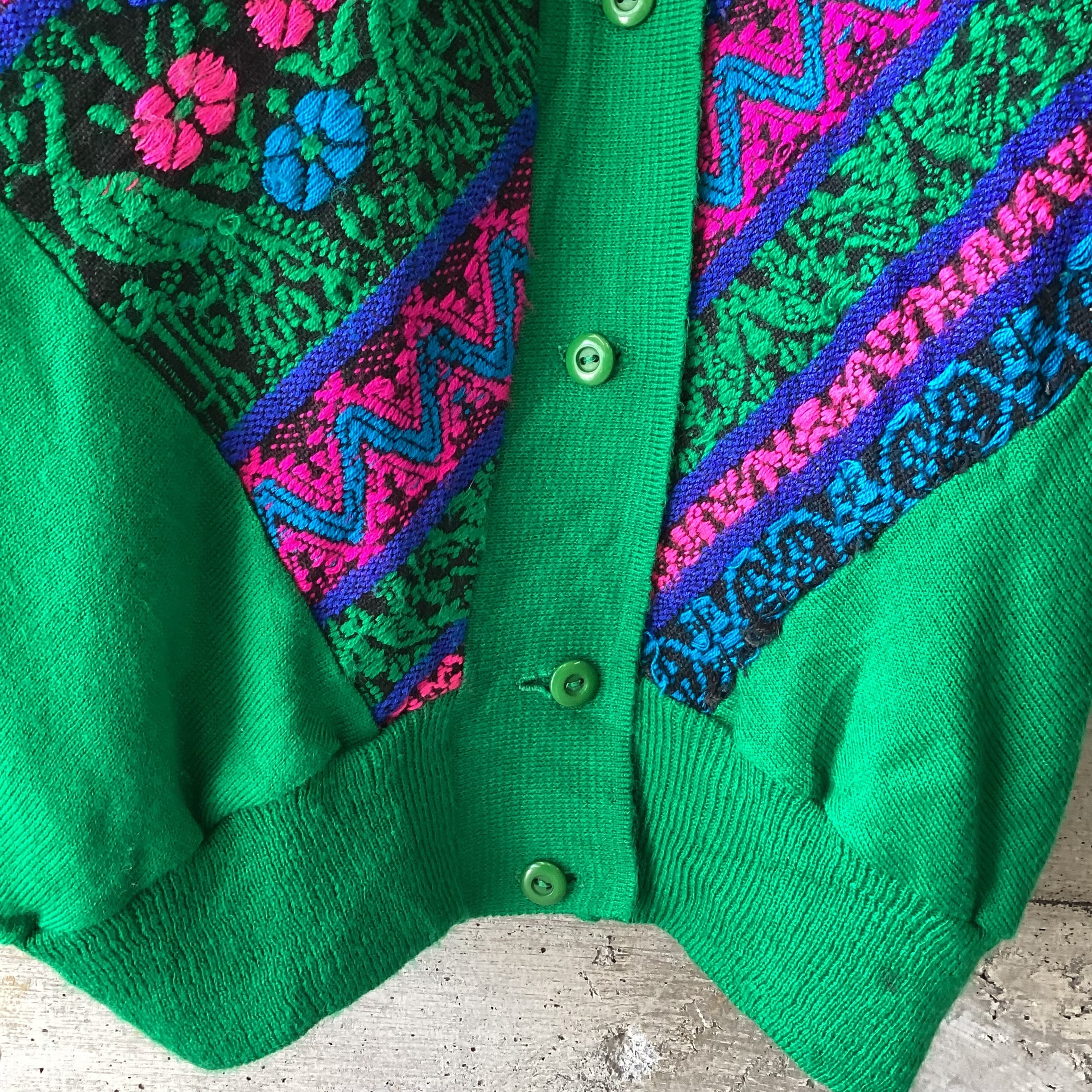 綺麗なグリーンのカーディガンに鮮やかな色の刺繍が施されています