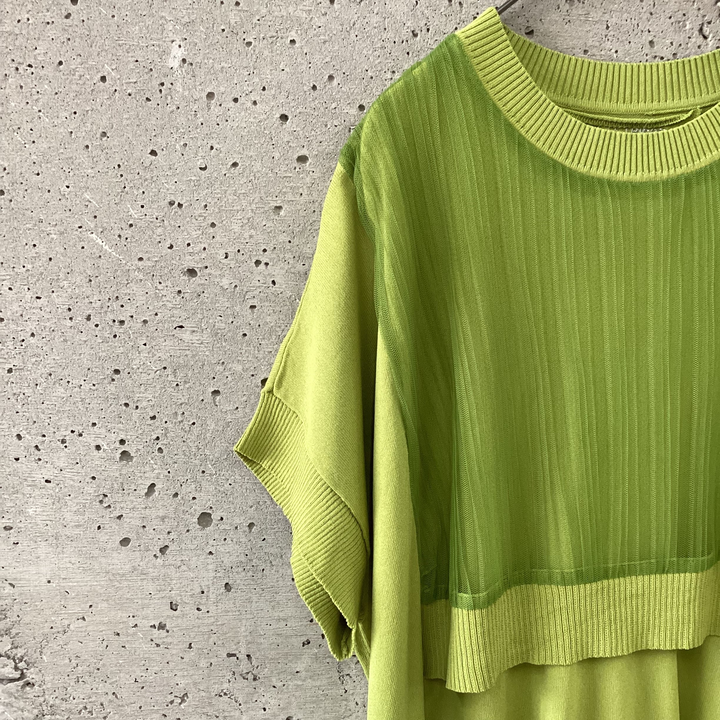 薄手のニット生地にシアーのプリーツ生地が縫い付けられたワンピースです。