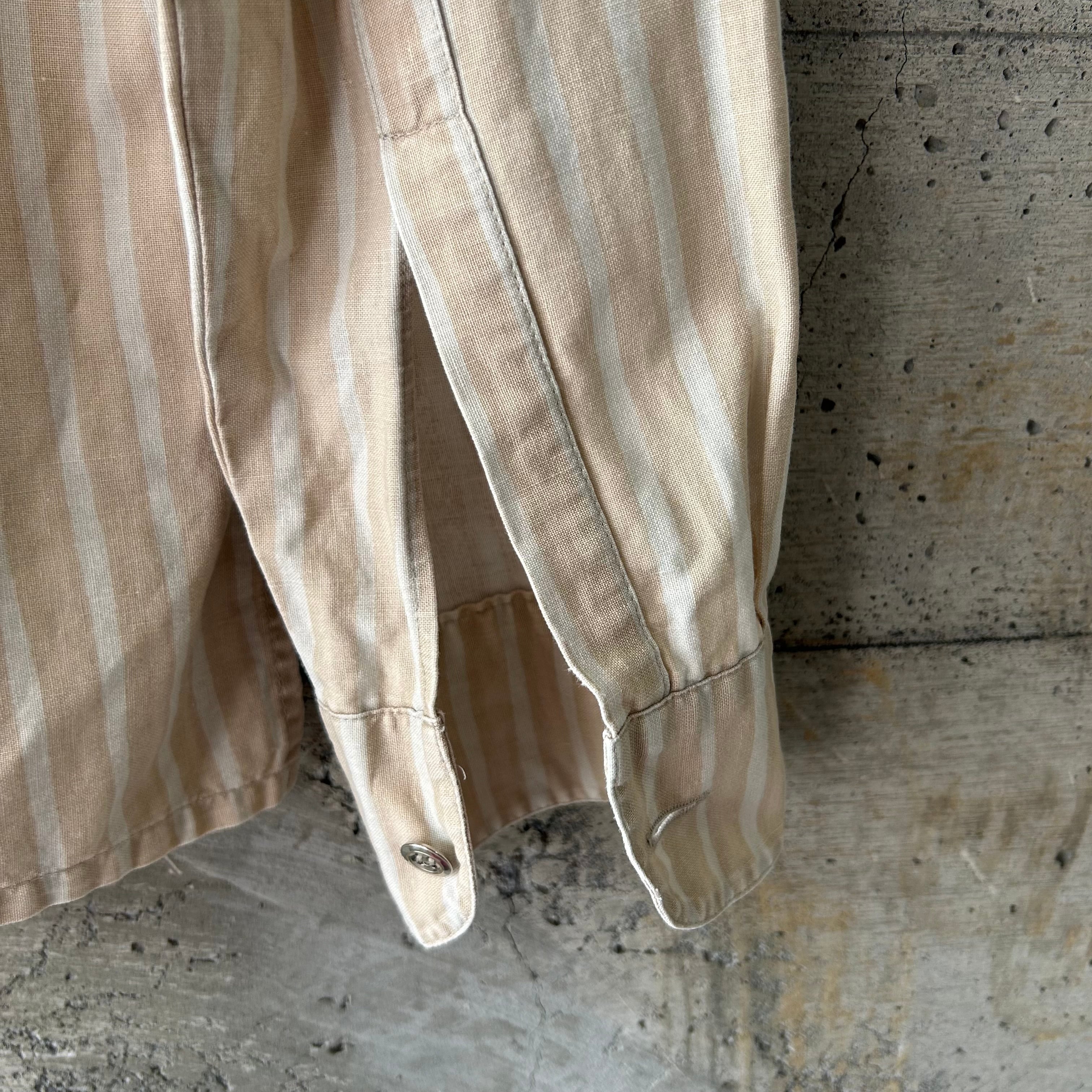 ベージュとホワイトのストライプシャツです。しっかりとした生地で作られており、着ると立体感が出ます。