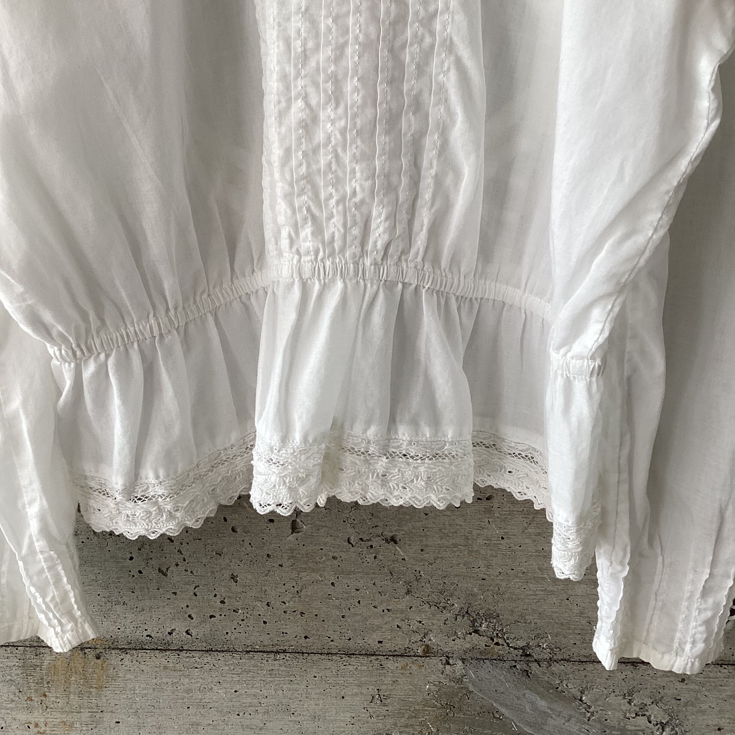 白のレースや裾のギャザーが可愛らしい印象のブラウスです