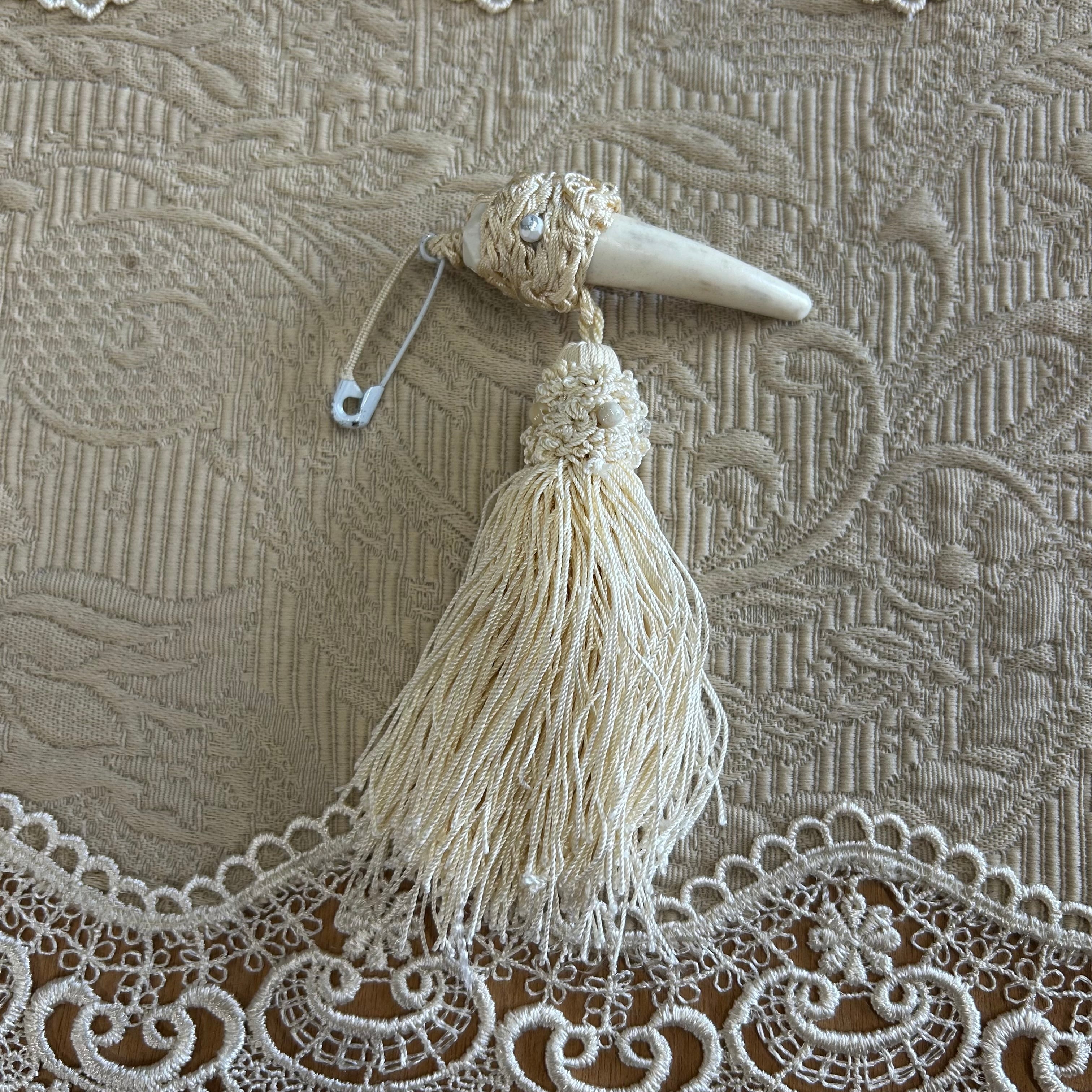 よく見ると骨がくちばし、タッセルが胴体の鳥の形に見えます。
