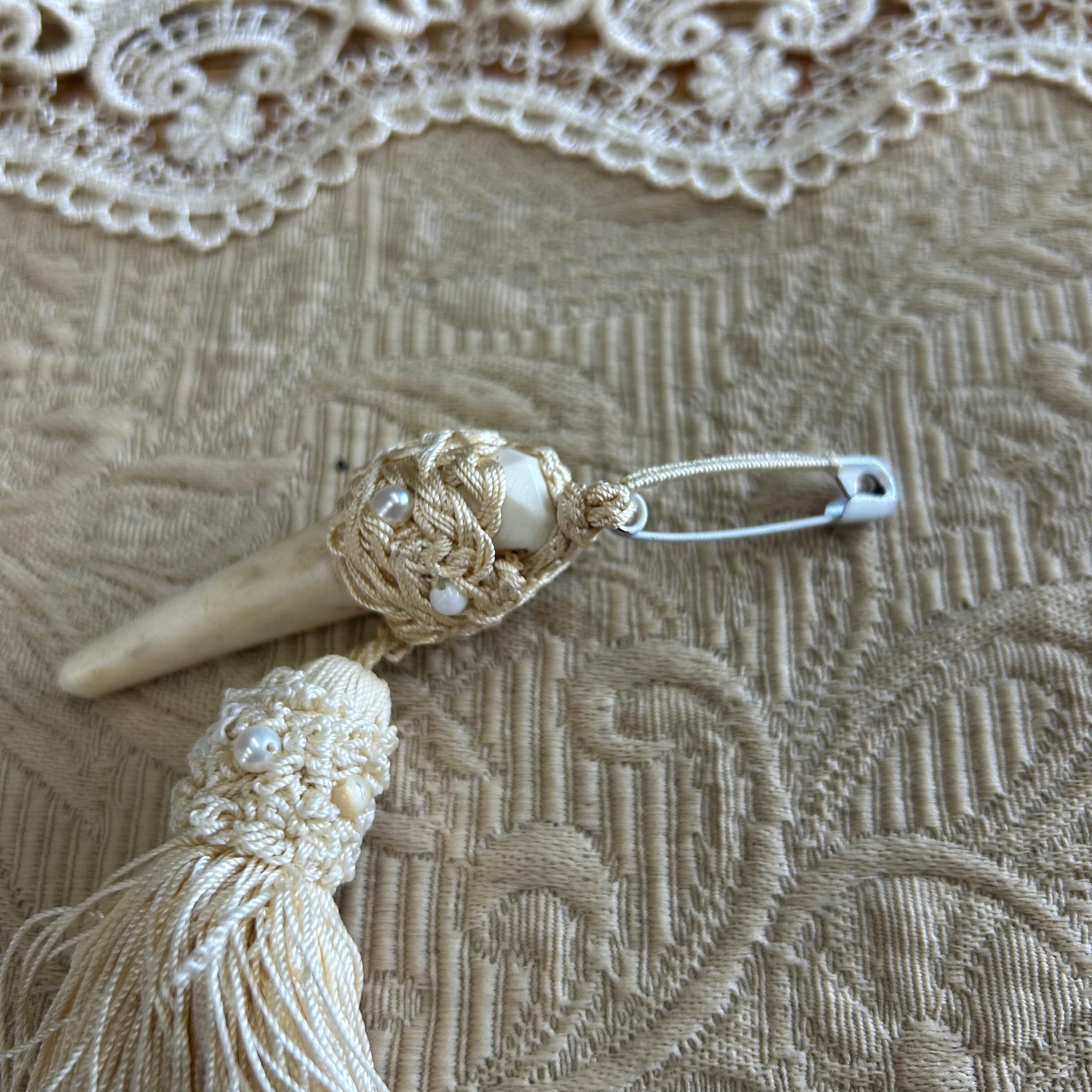 タッセルと動物の骨がついている優しくもあり退廃的でもあり、な印象を受けます。