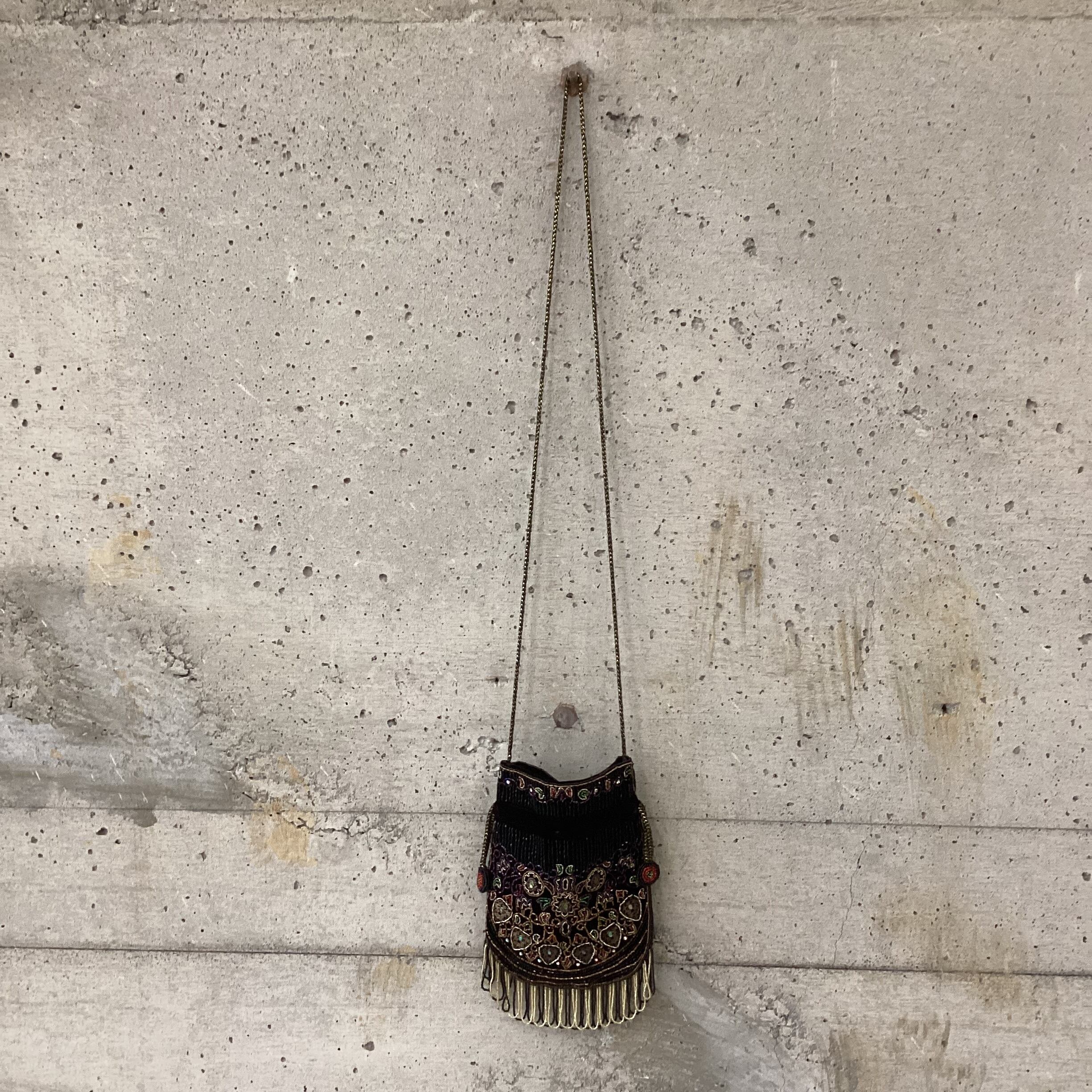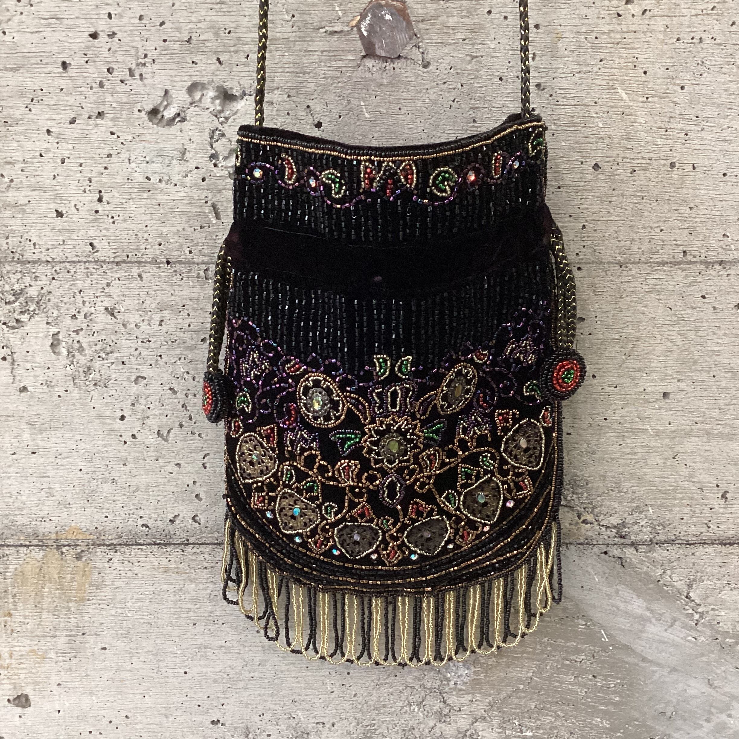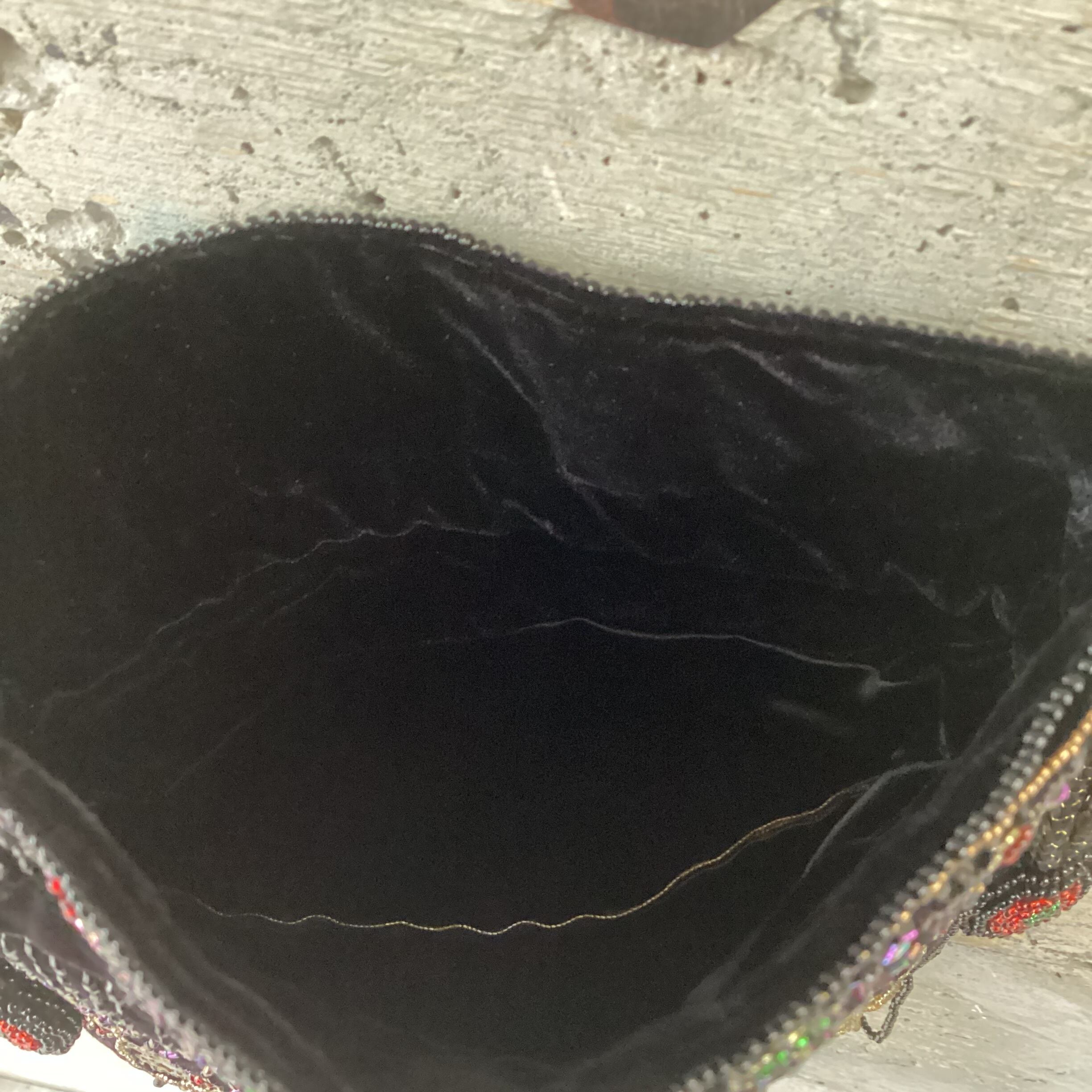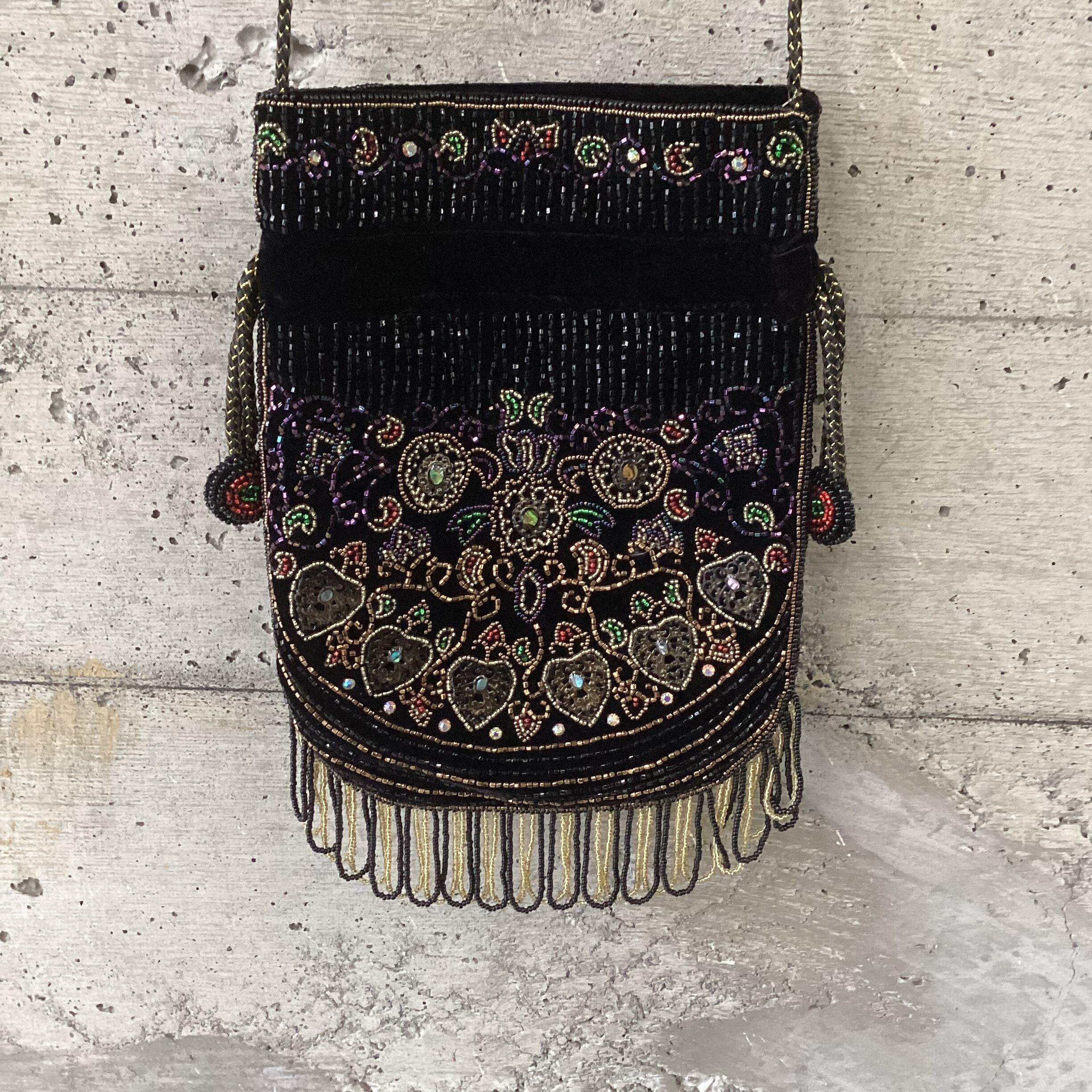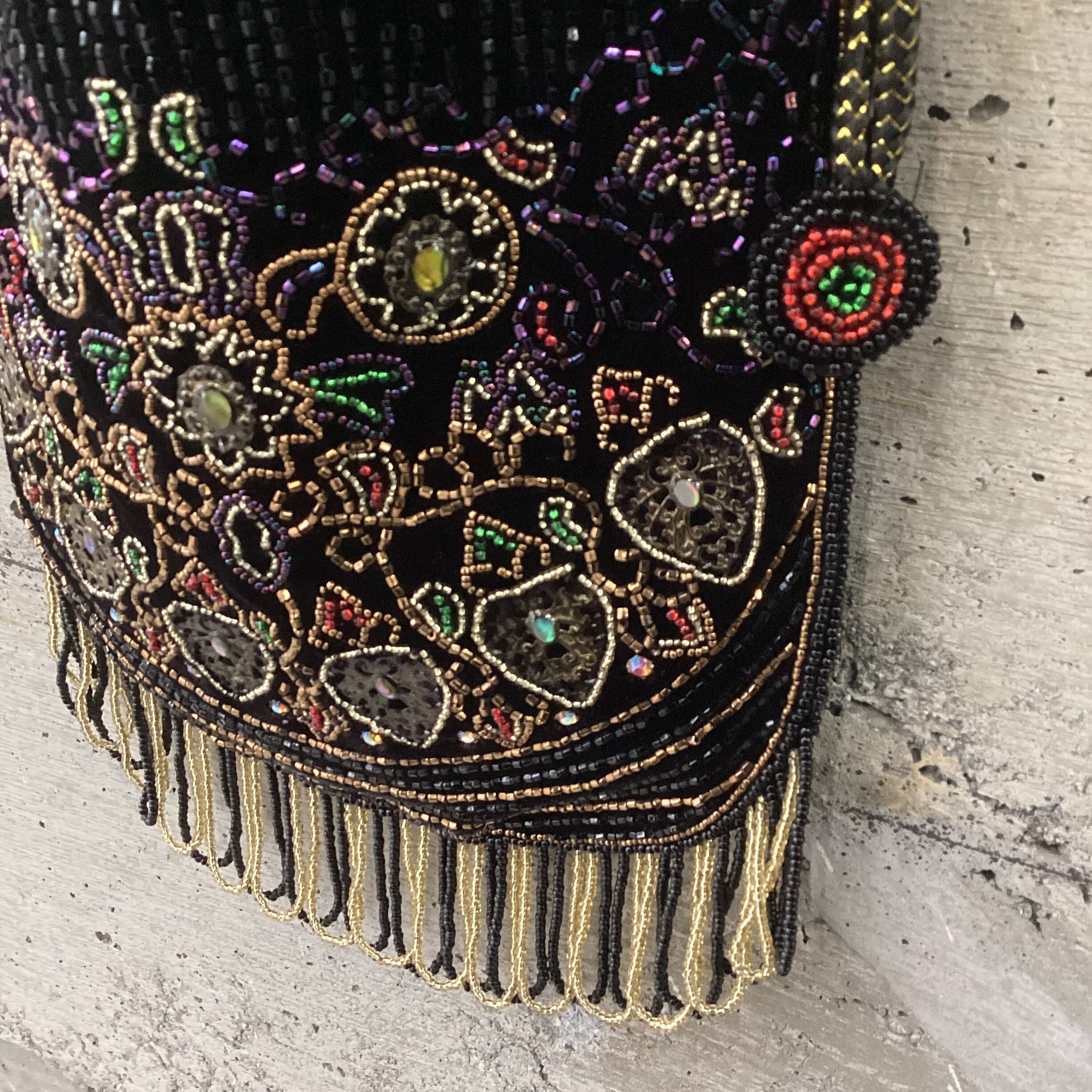 黒のベロア生地の上にビーズが縫いつかられた華やかなバッグです