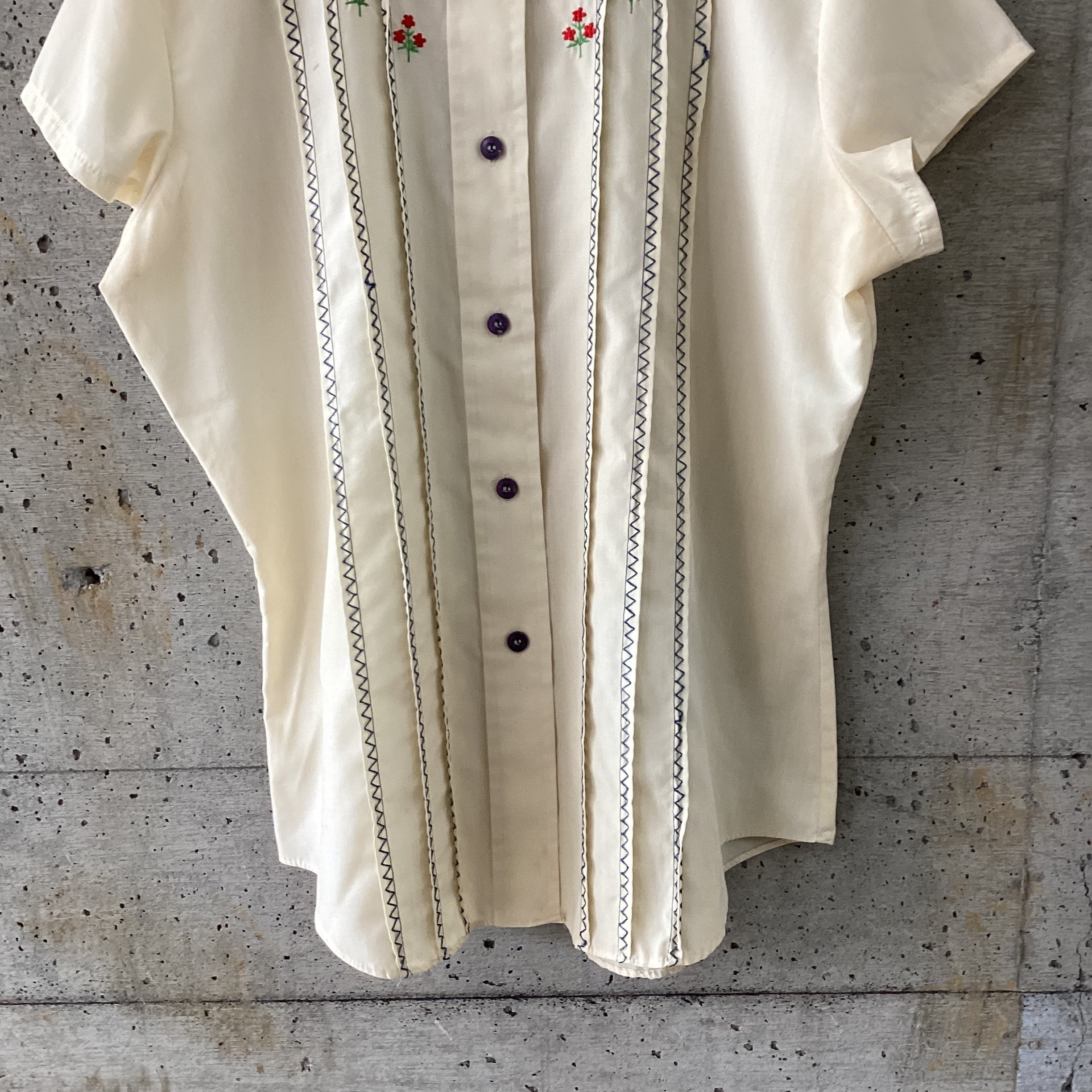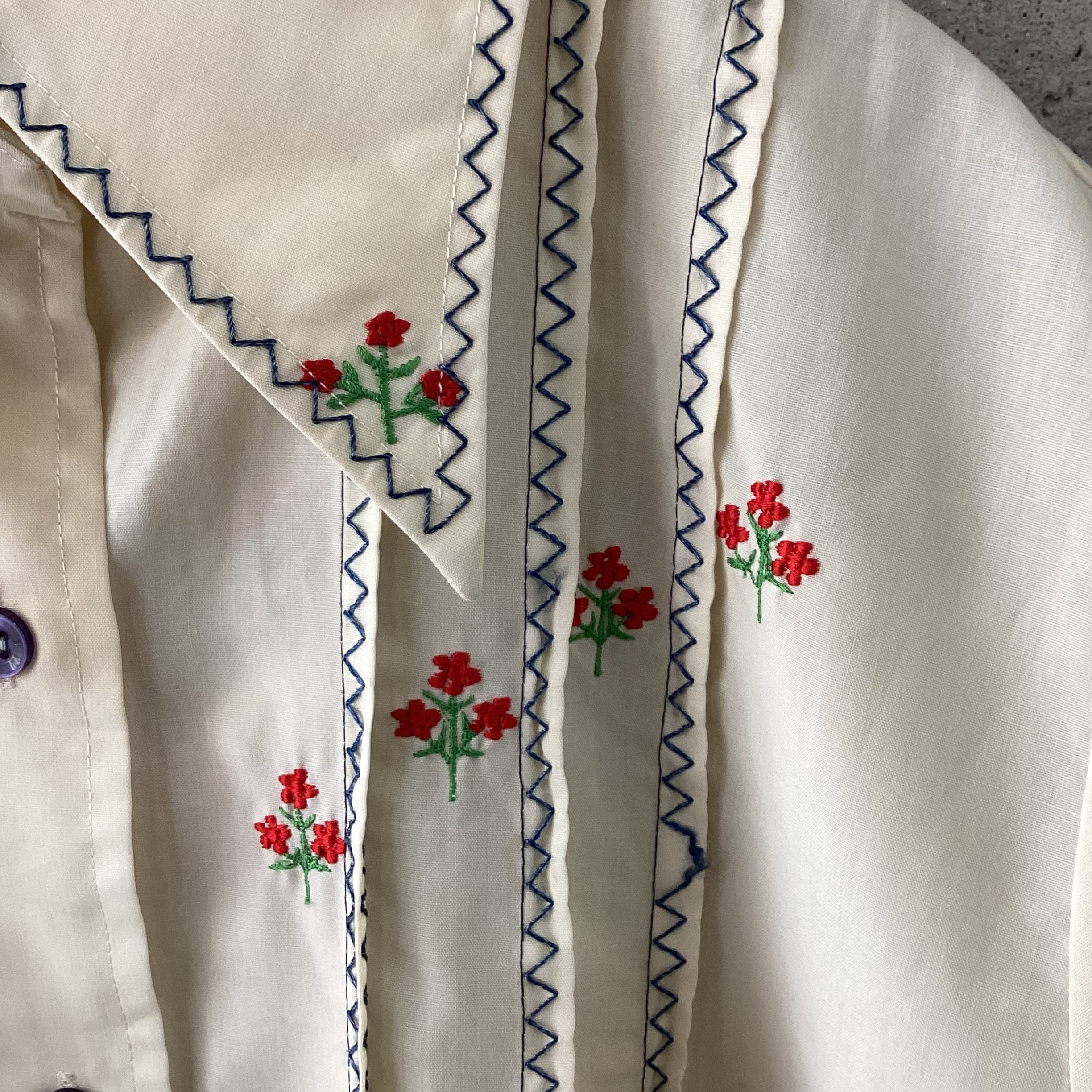 クリーム色のボディに紺色のステッチとお花の刺繍がよく映えます。
