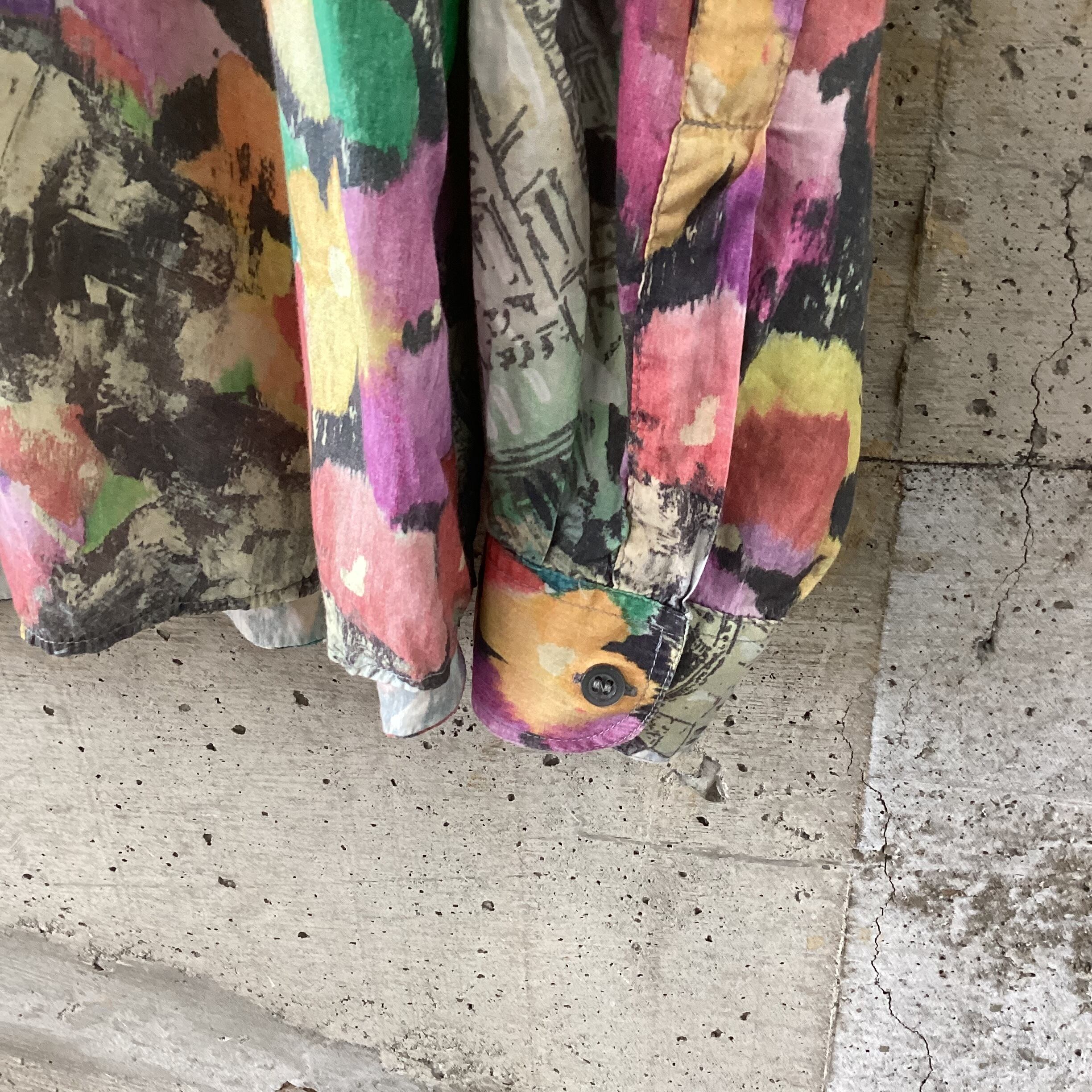 暗めの色も入っているのでデニムやグレーのパンツなどとも合わせやすく、一枚持っているだけで気持ちも華やかになるようなシャツです。