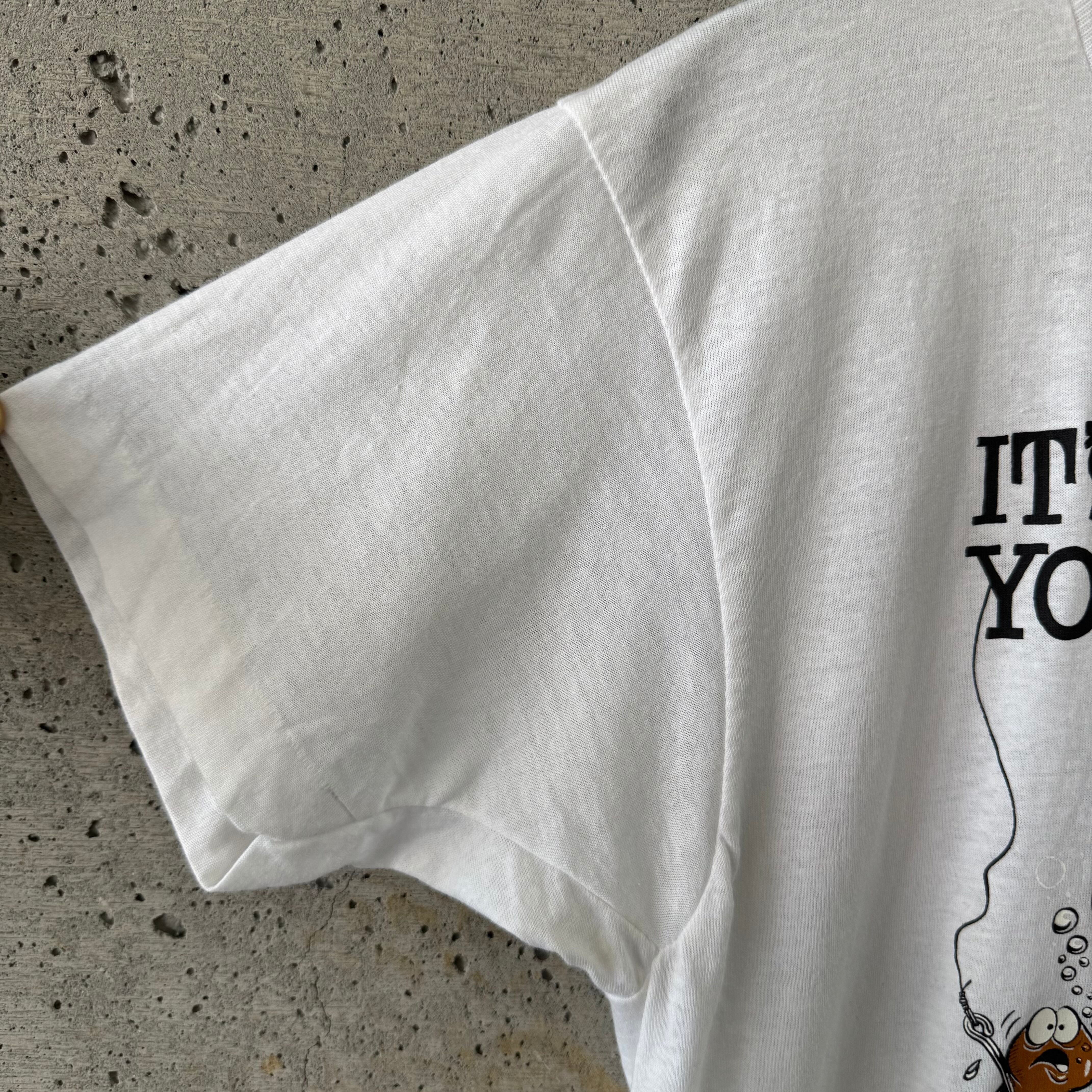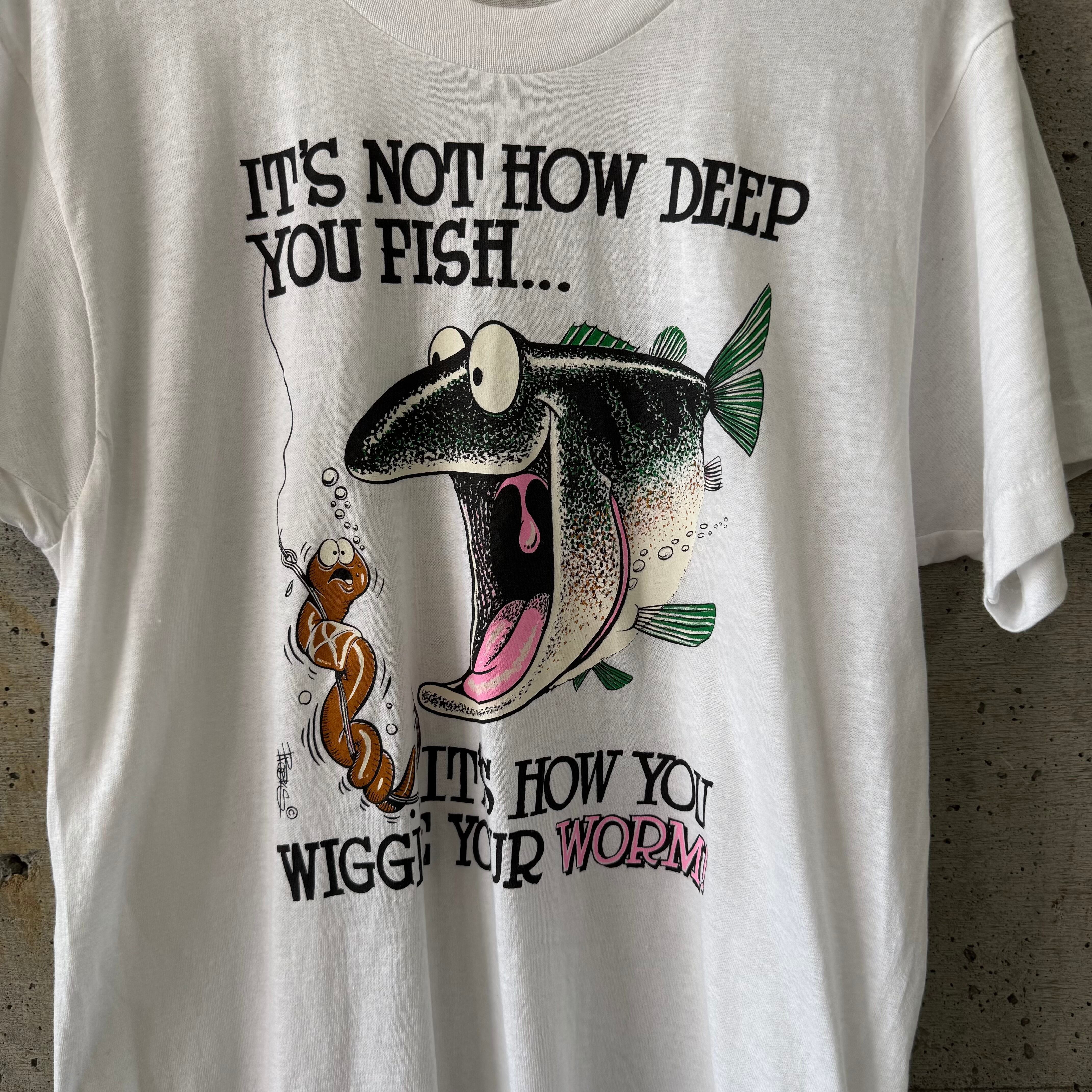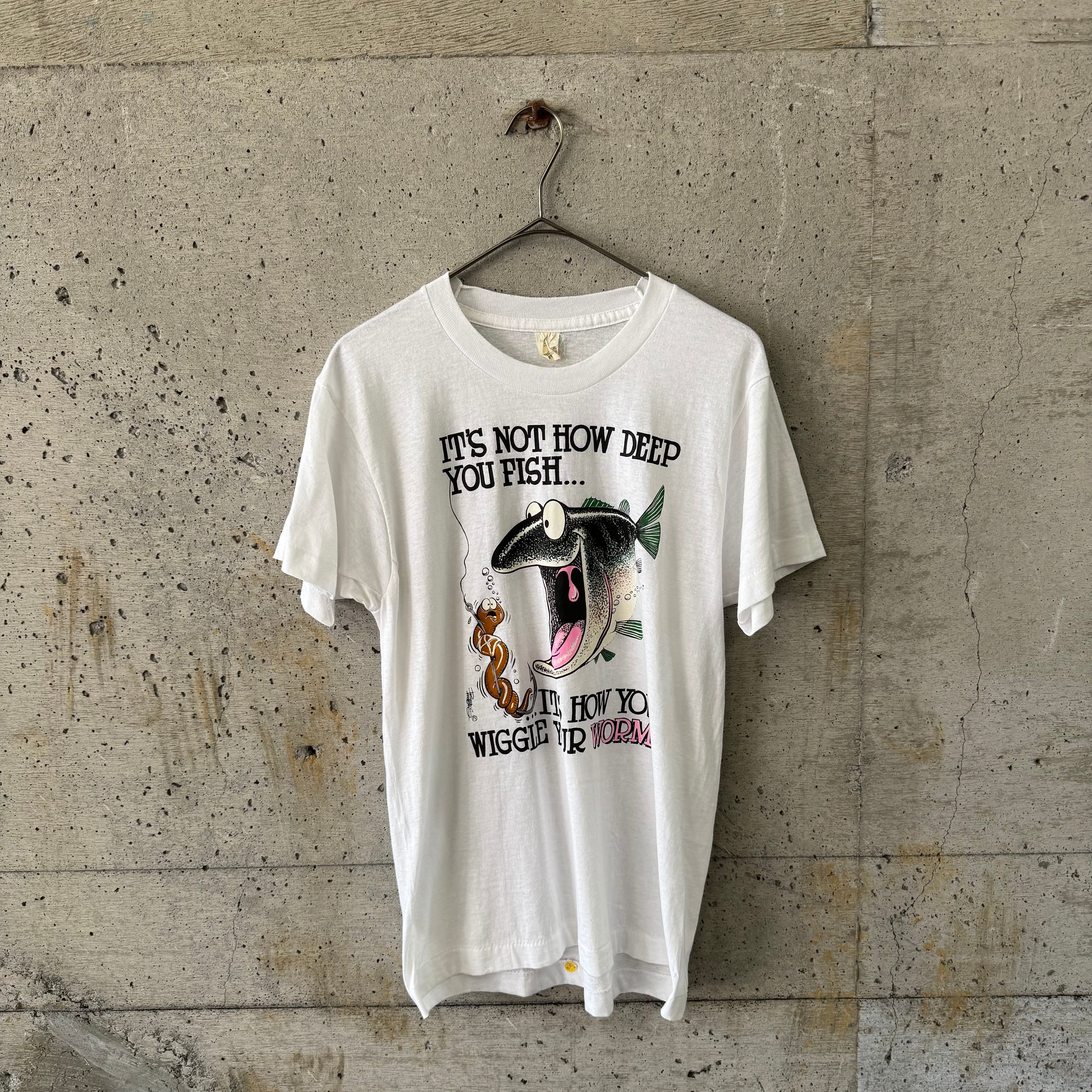 大きな魚が虫を食べようとしている様子が面白くプリントされているTシャツです。