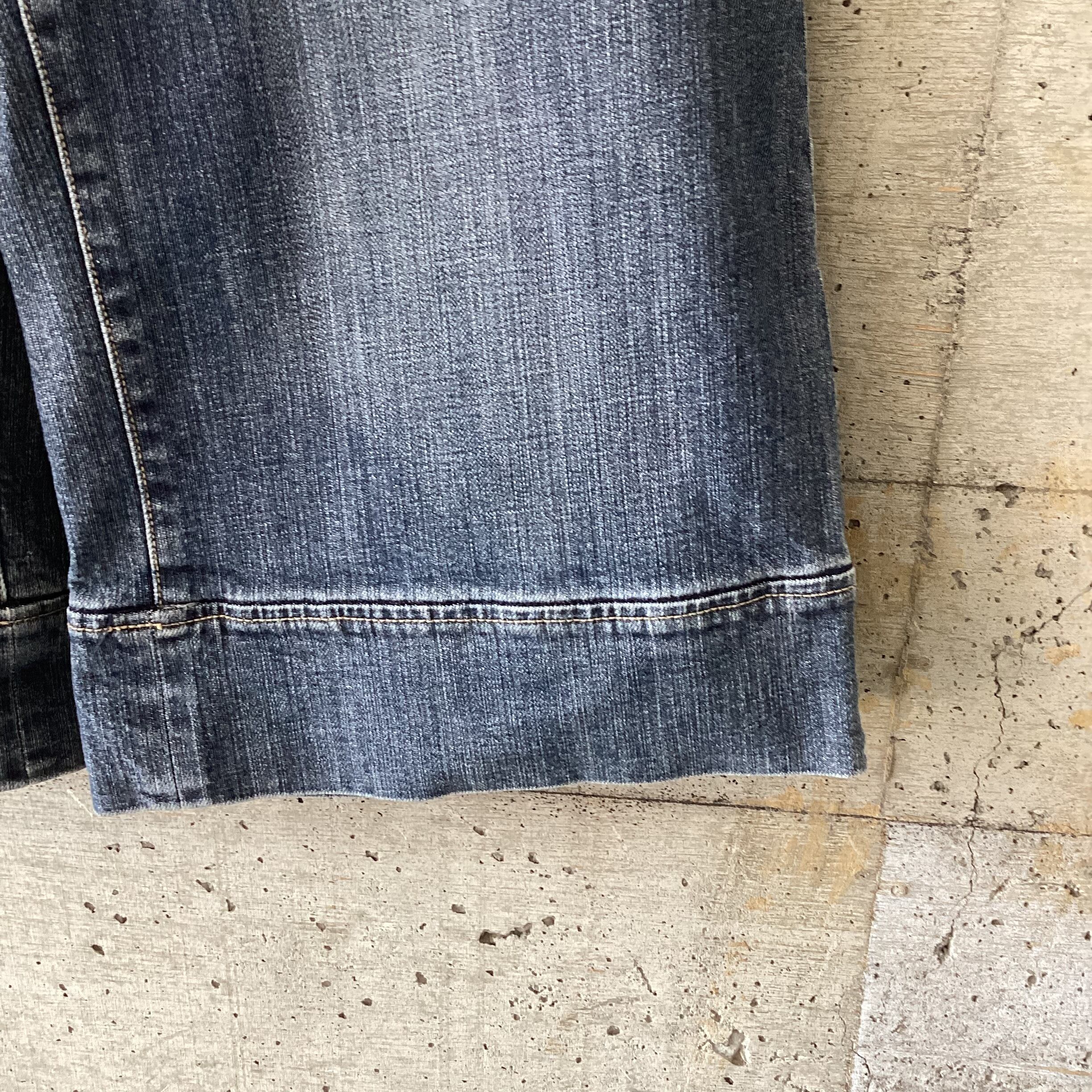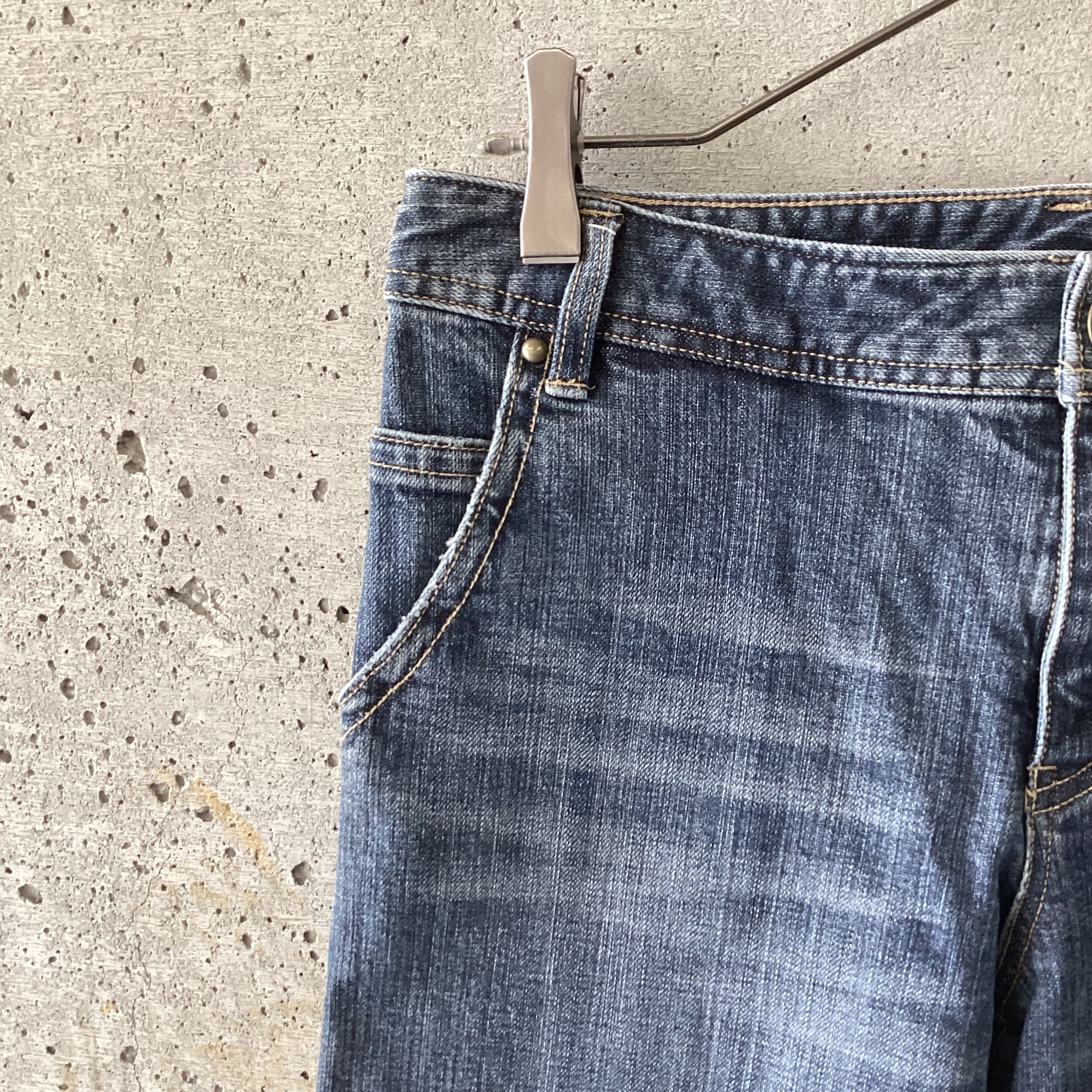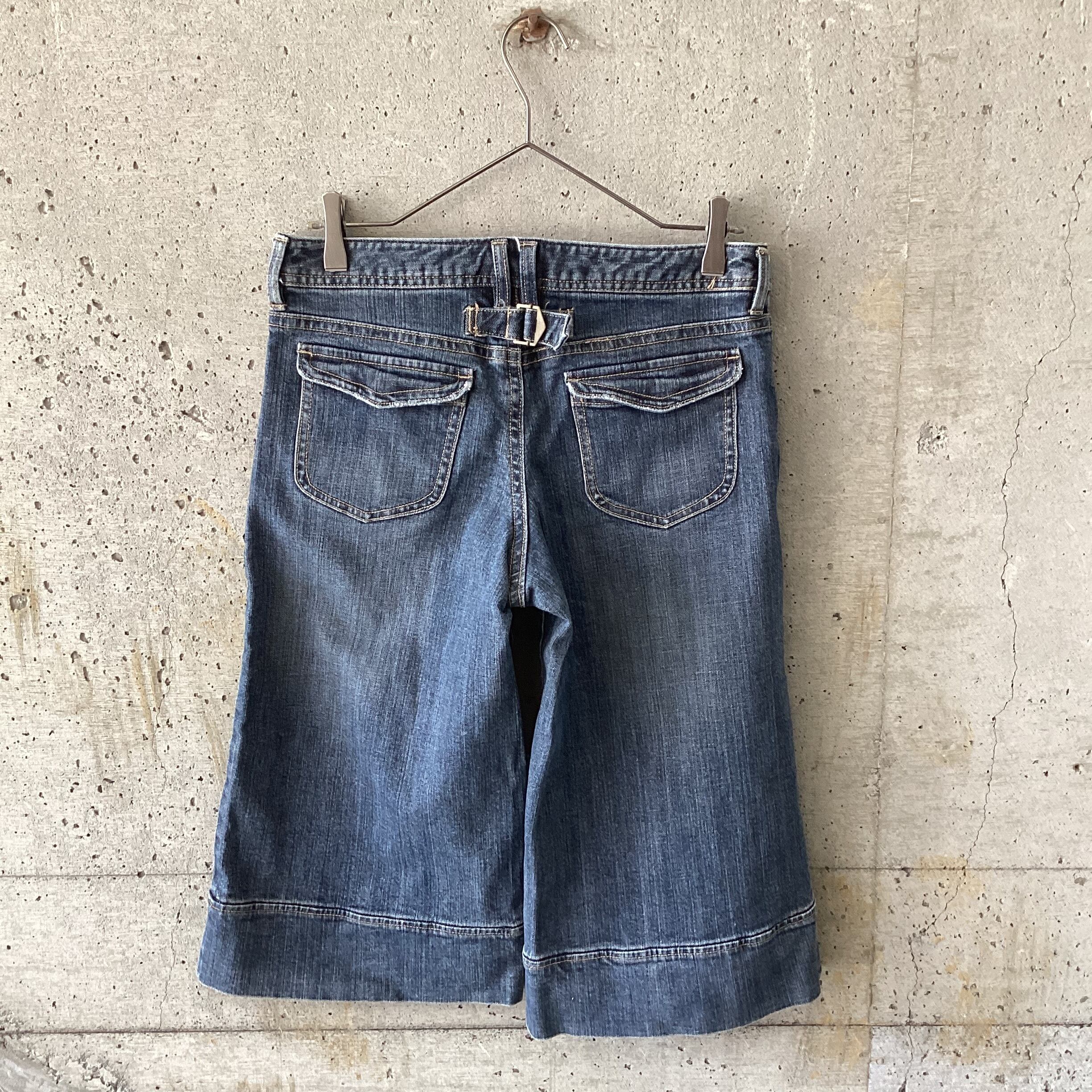 少し丈の長めのソックスとスニーカーと合わせる定番の履き方以外にも、下にジャージを重ねたりと楽しめる膝下丈デニムパンツです