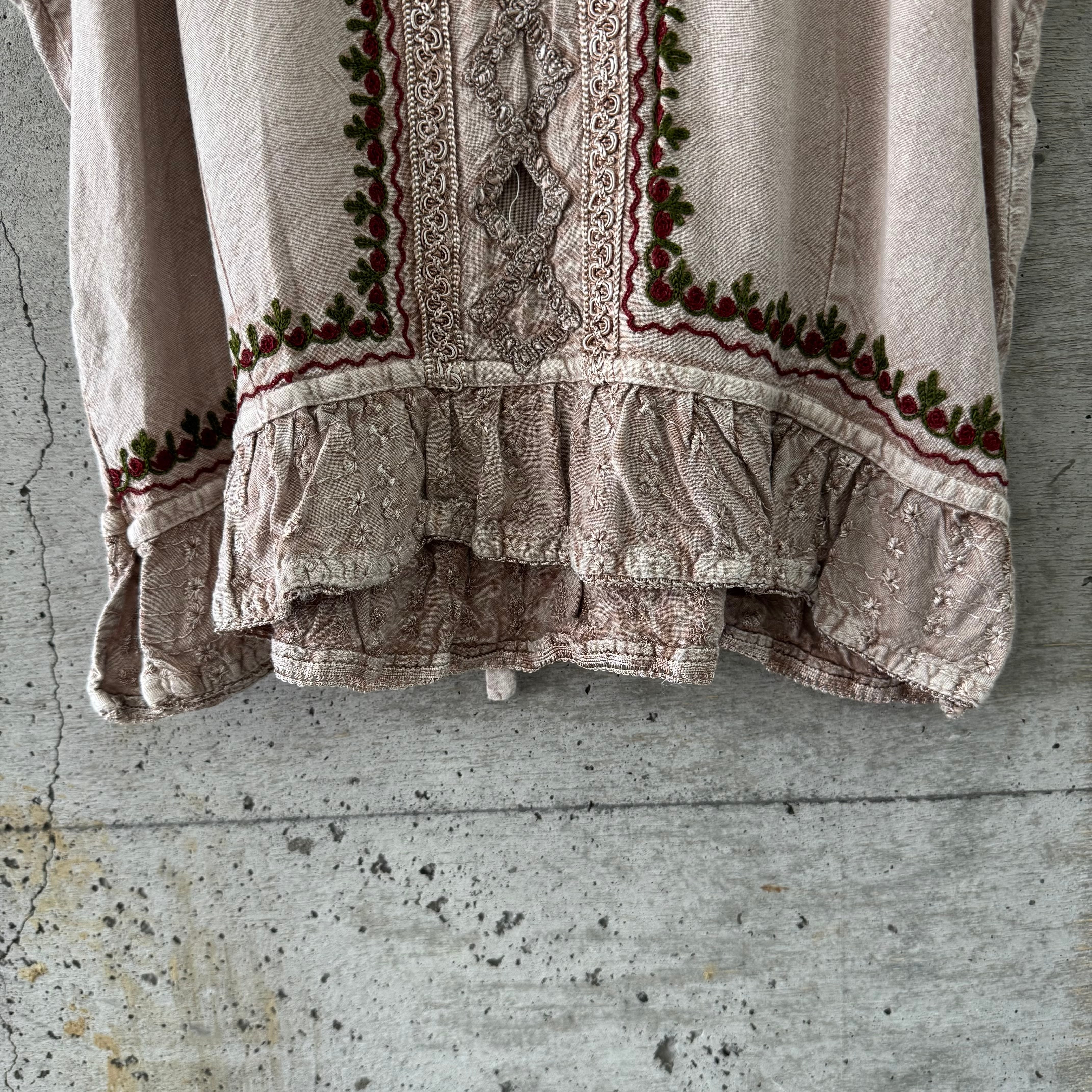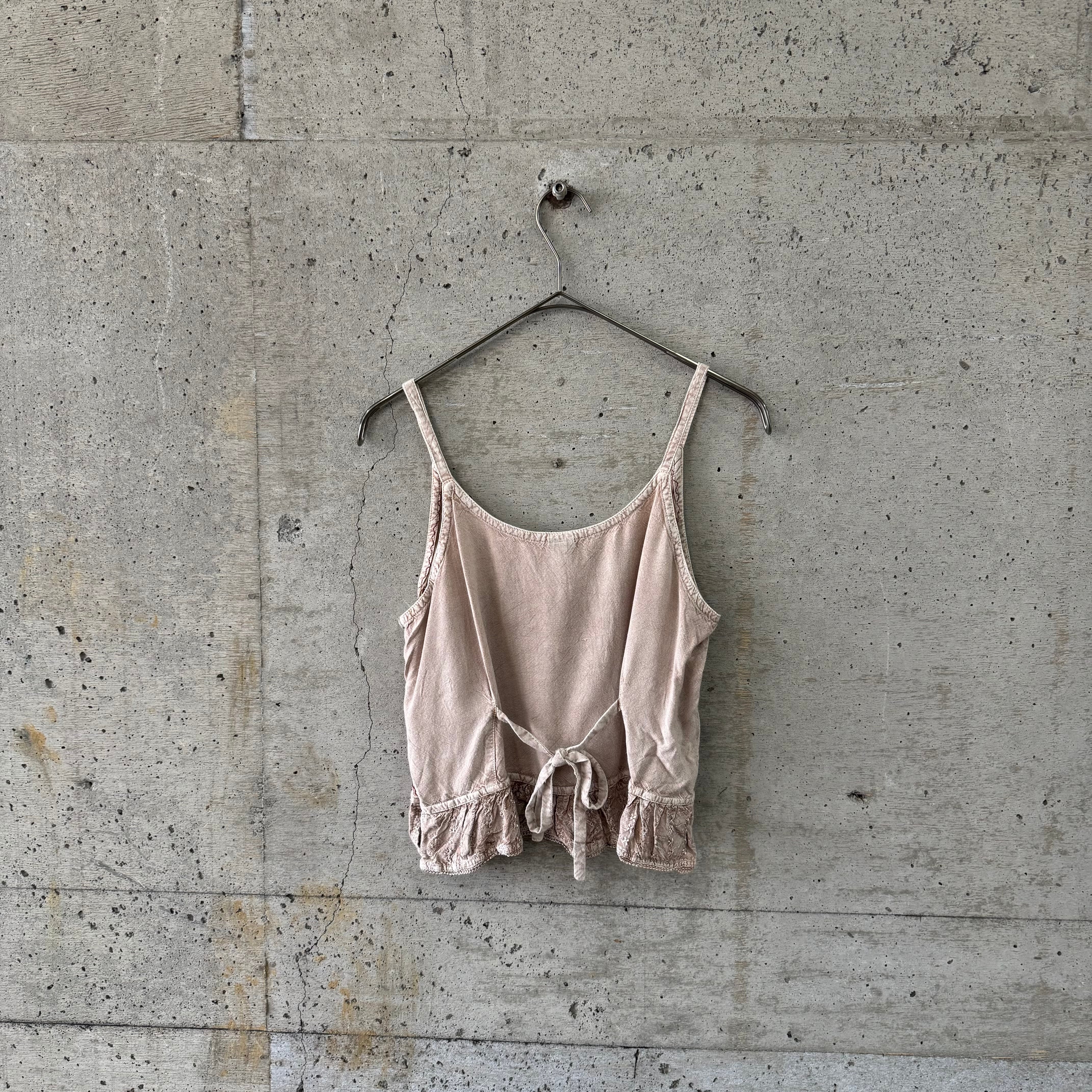 ベージュのボディに濃いレッドとグリーンの刺繍の相性が抜群なキャミソールです。