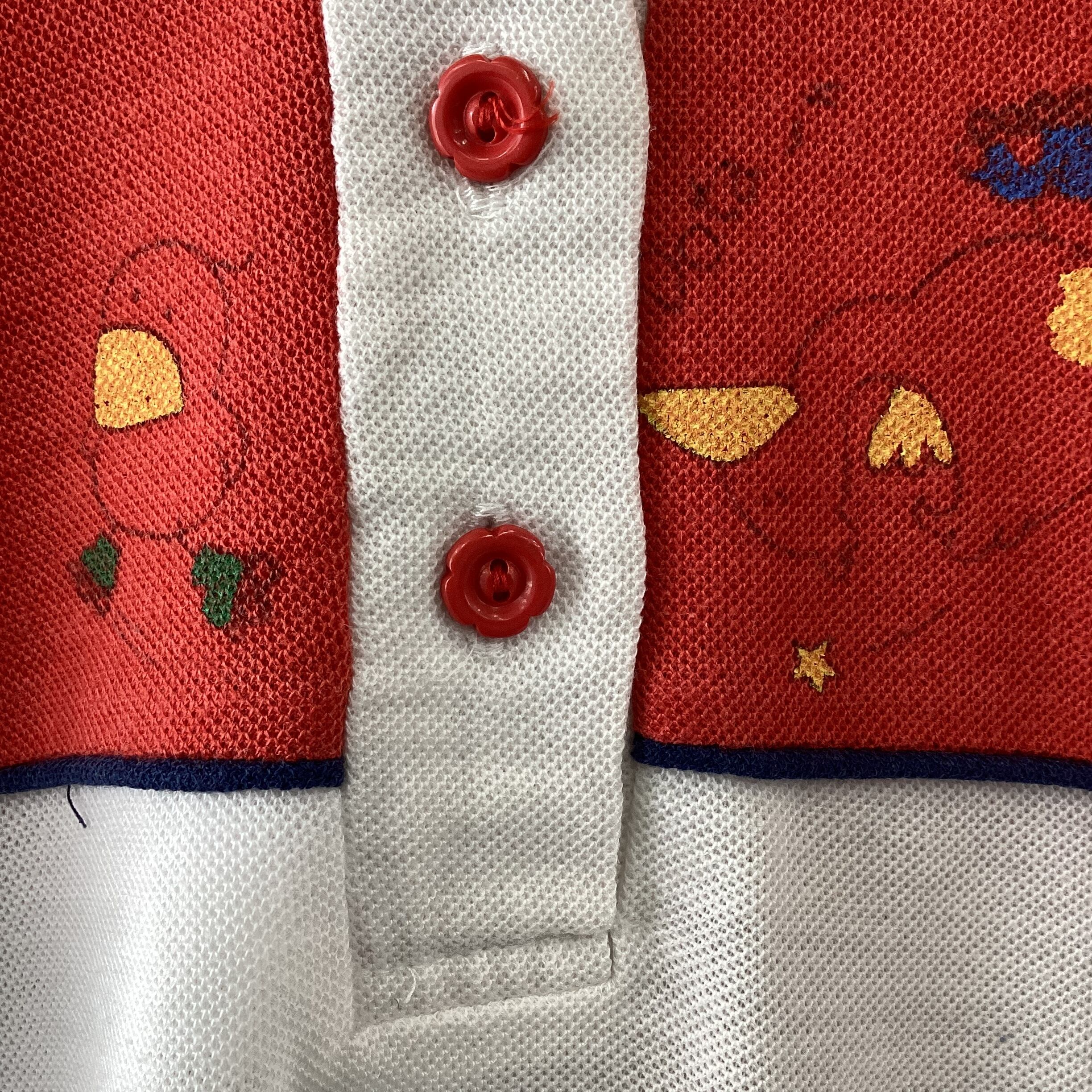 切り替えの色味とバランスがとても良く、レトロポップなかわいさを感じます。ボタンは花の形になっていて、襟の周りはオレンジでフリルのようで、細かなところへのこだわりも感じます。パンツもスカートも、ショート丈もロング丈も合うような1着なので、とても着回しやすいです。