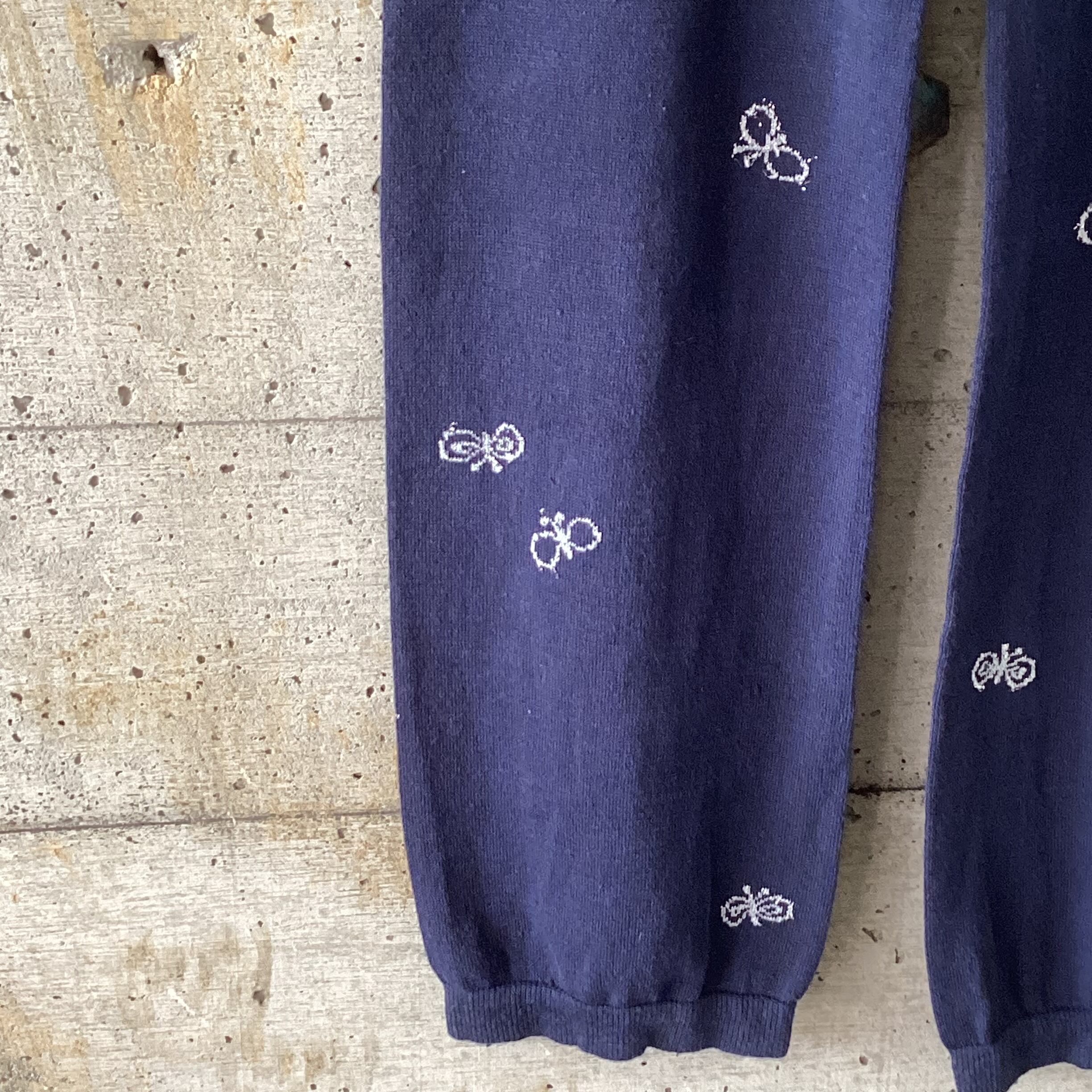 ネイビーのボディにシルバーのラメ入りの糸で蝶が刺繍されたパンツです。