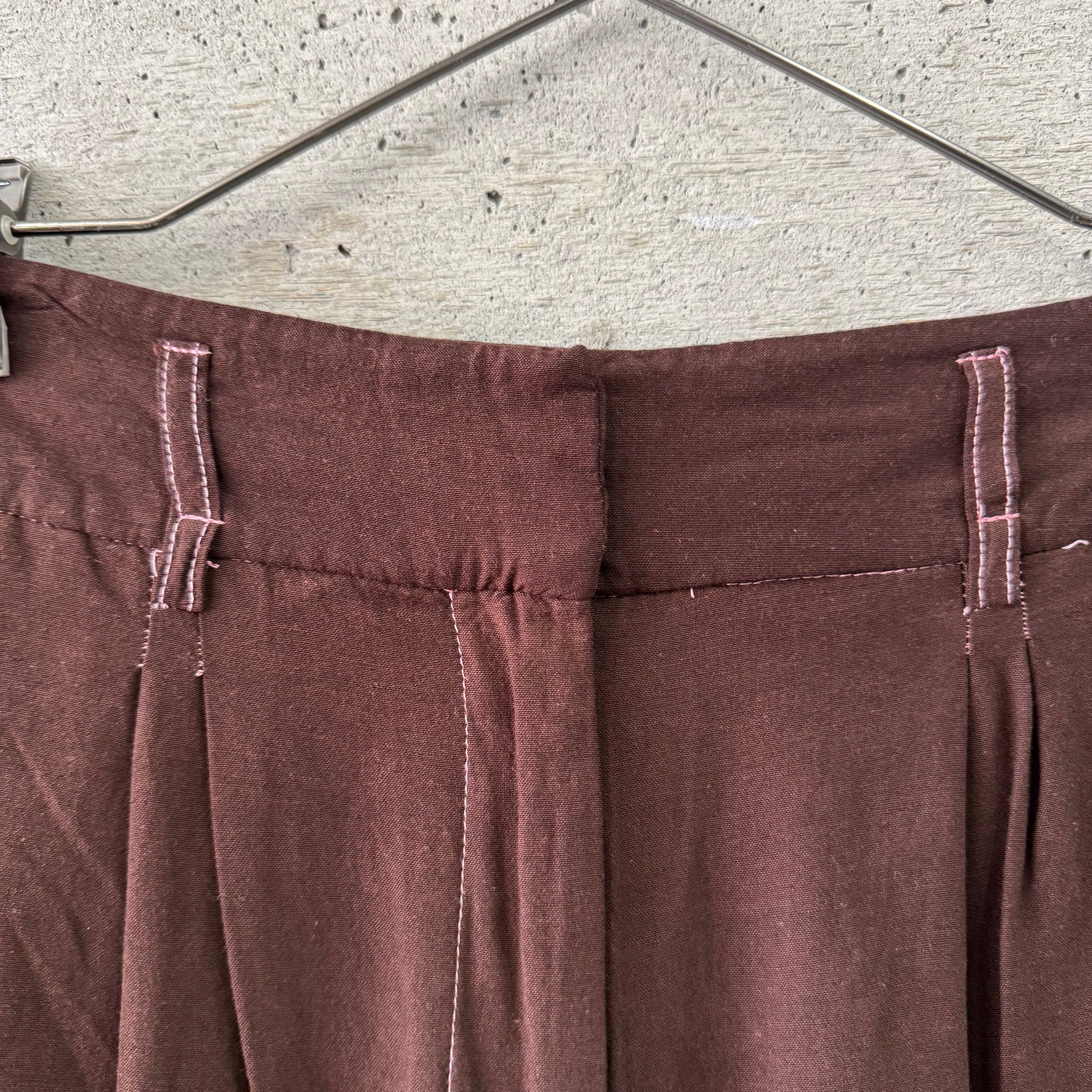 濃いブラウンのボディにピンクステッチの組み合わせがとても可愛いワイドパンツです。
