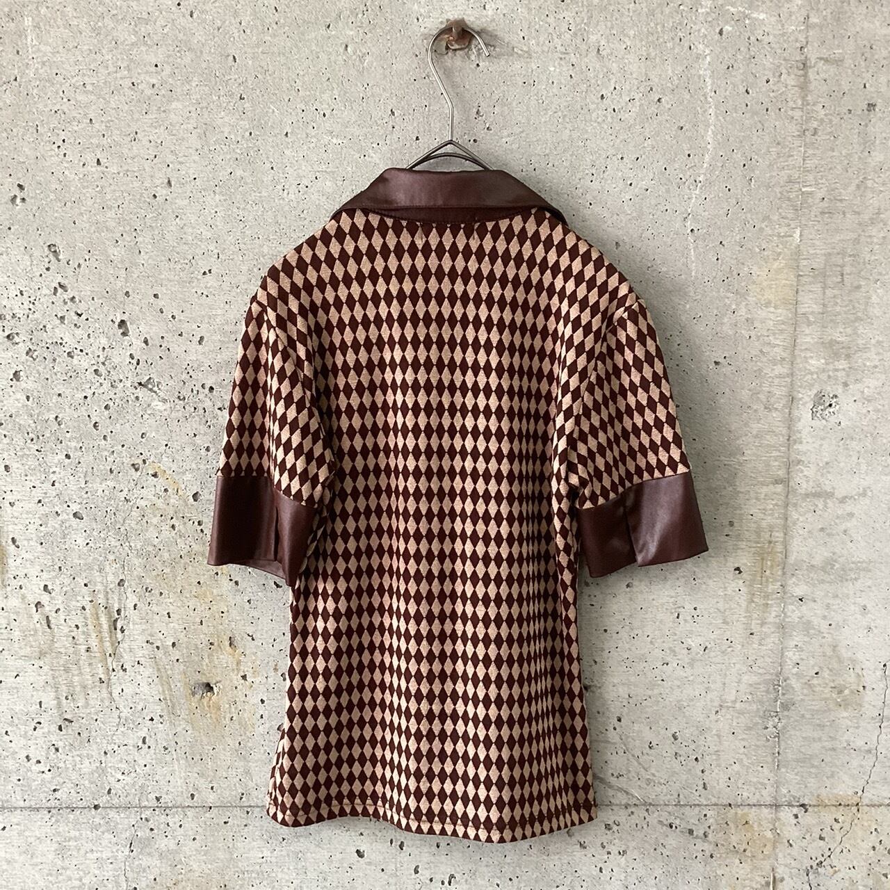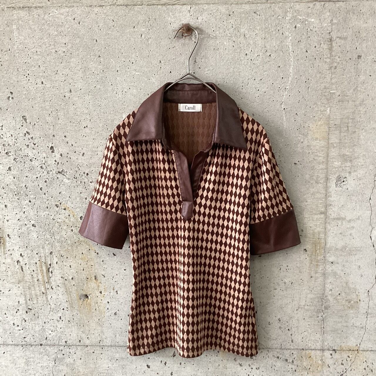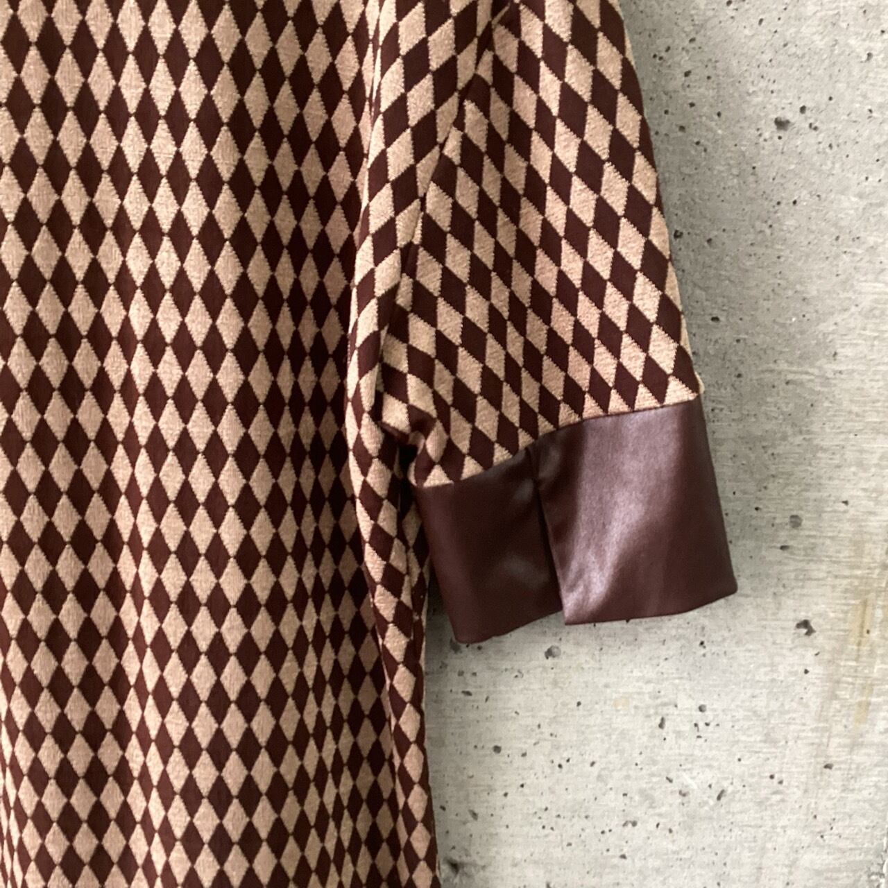 ダイヤ柄と、レザーのような光沢のあるニットの切り替えトップスです。