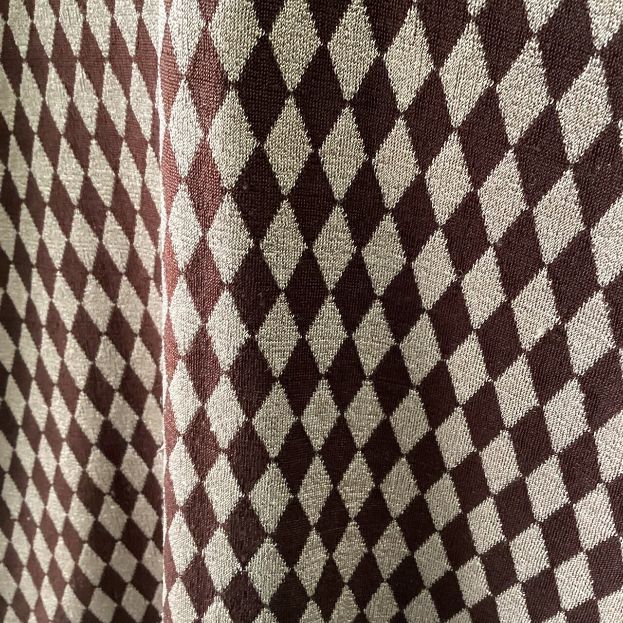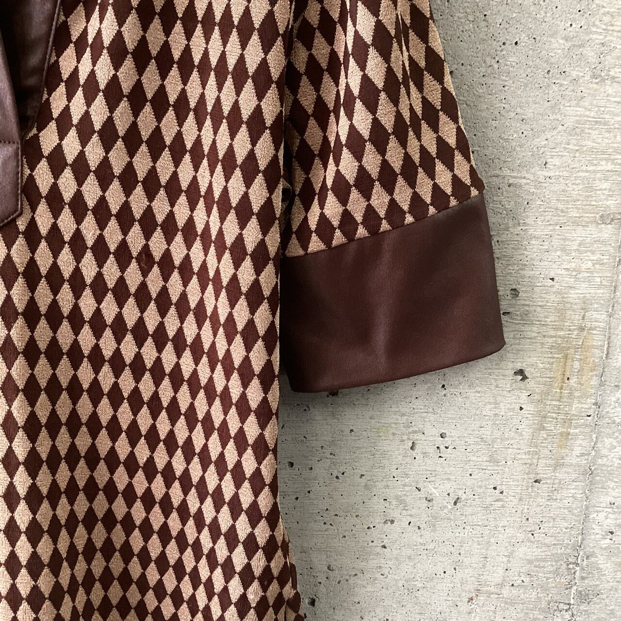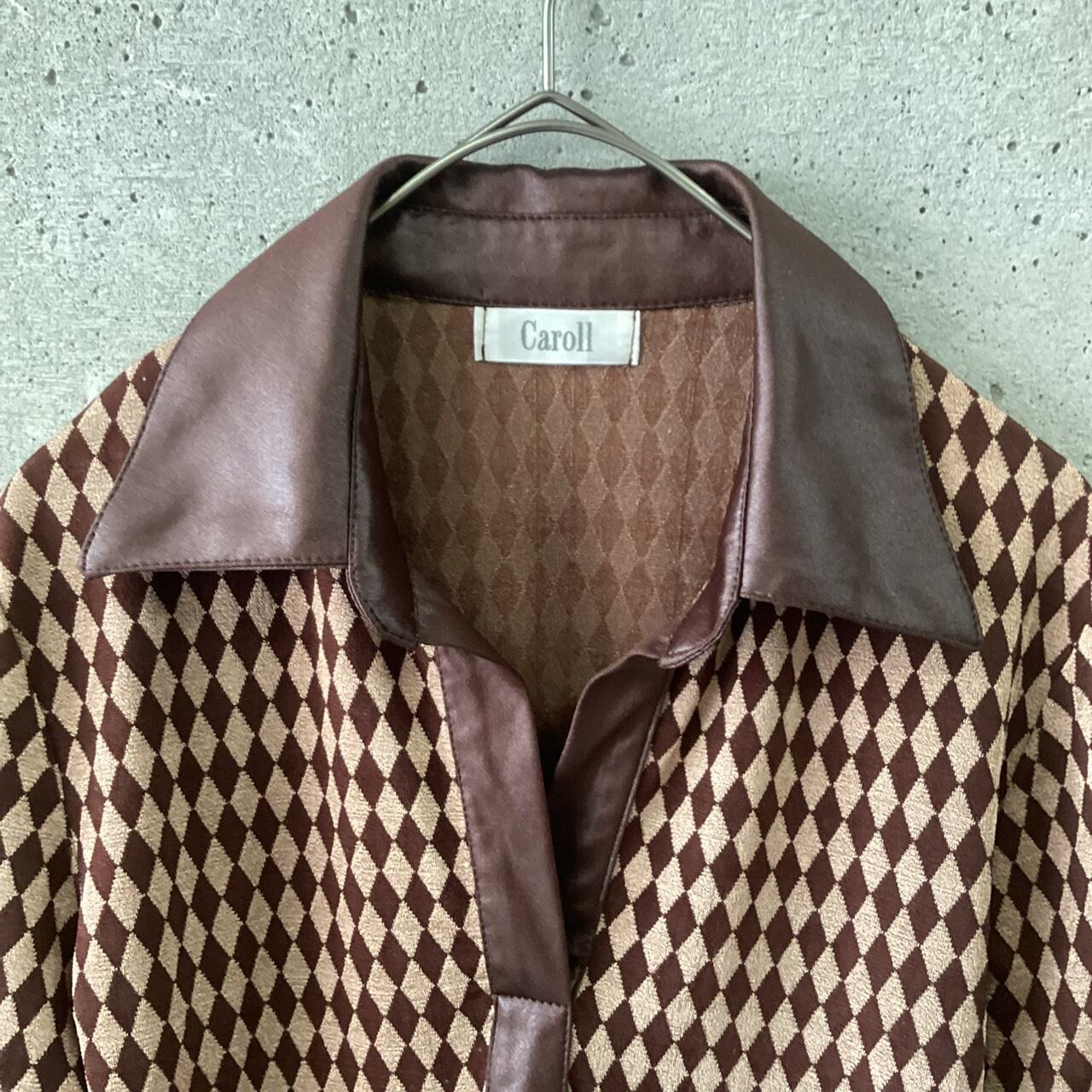 ダイヤ柄と、レザーのような光沢のあるニットの切り替えトップスです。
