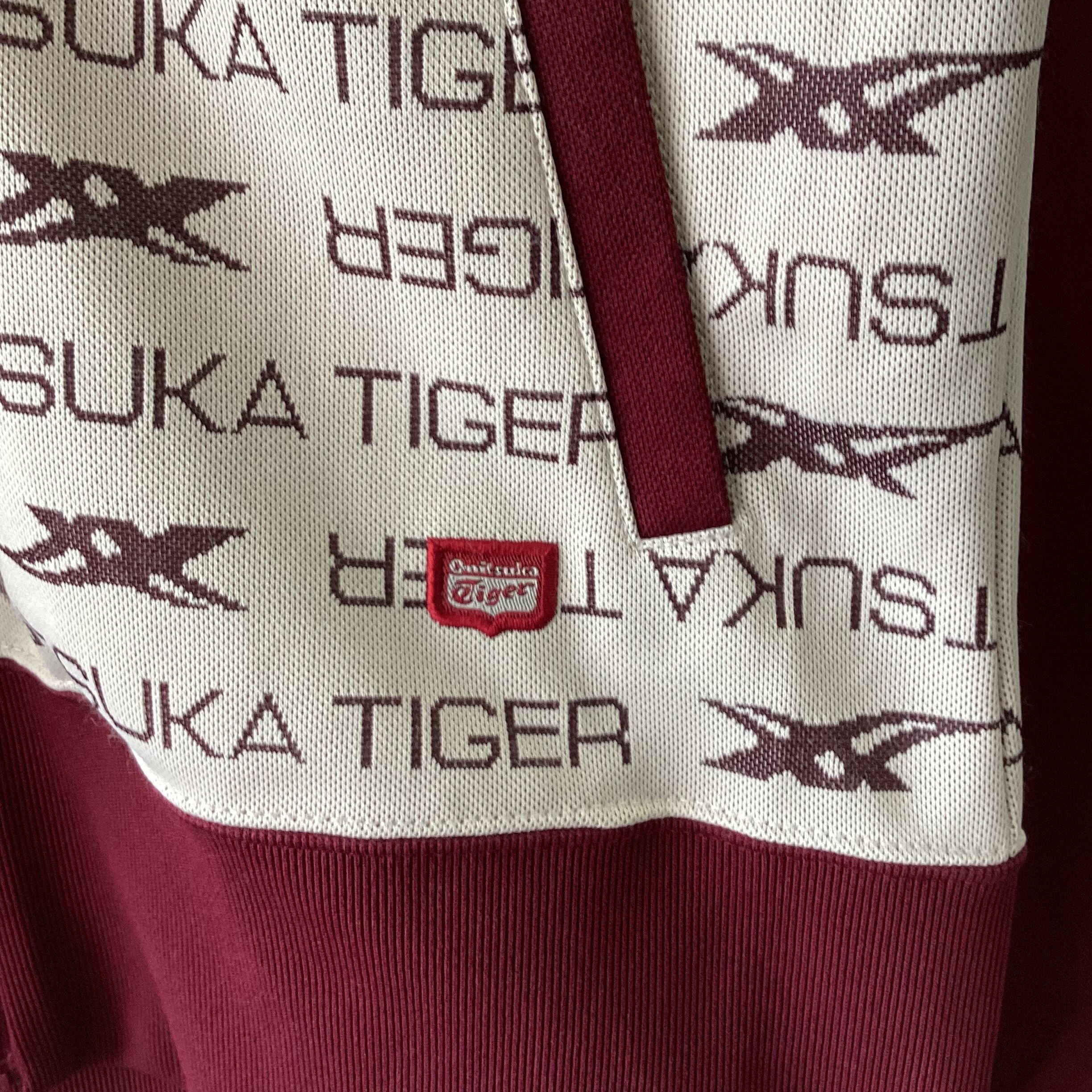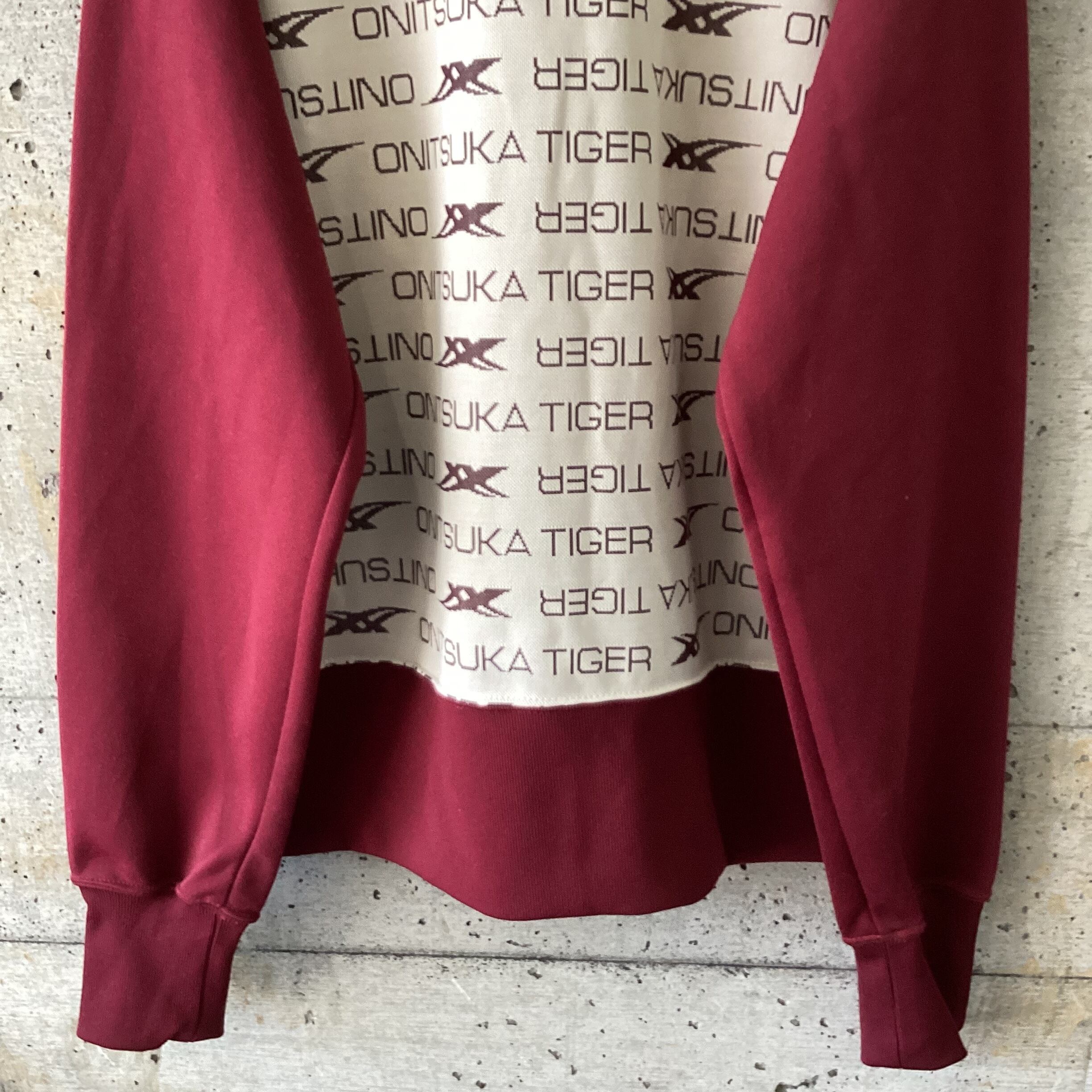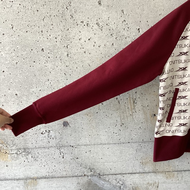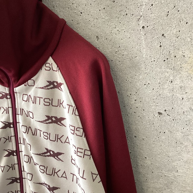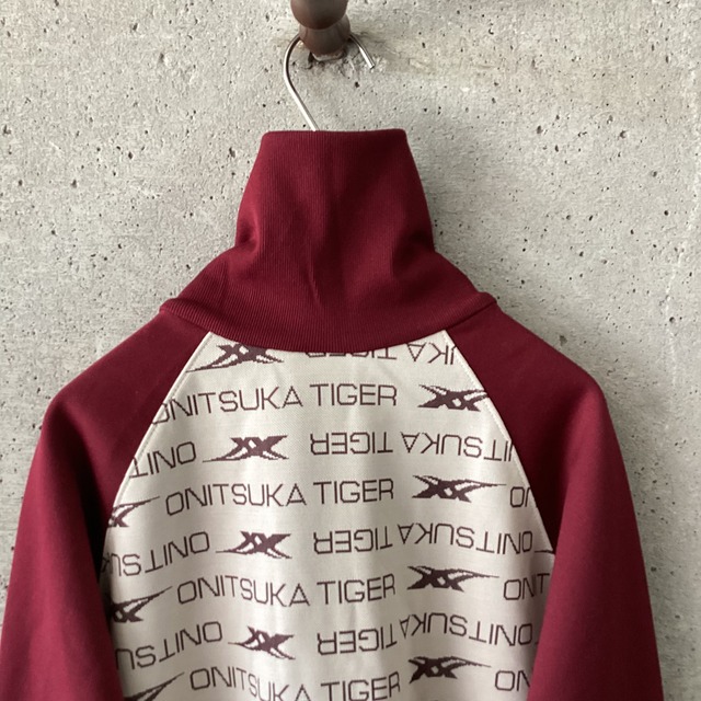 ONITSUKA TIGERの文字とロゴのテキスタイルが使われたトラックジャケットです。