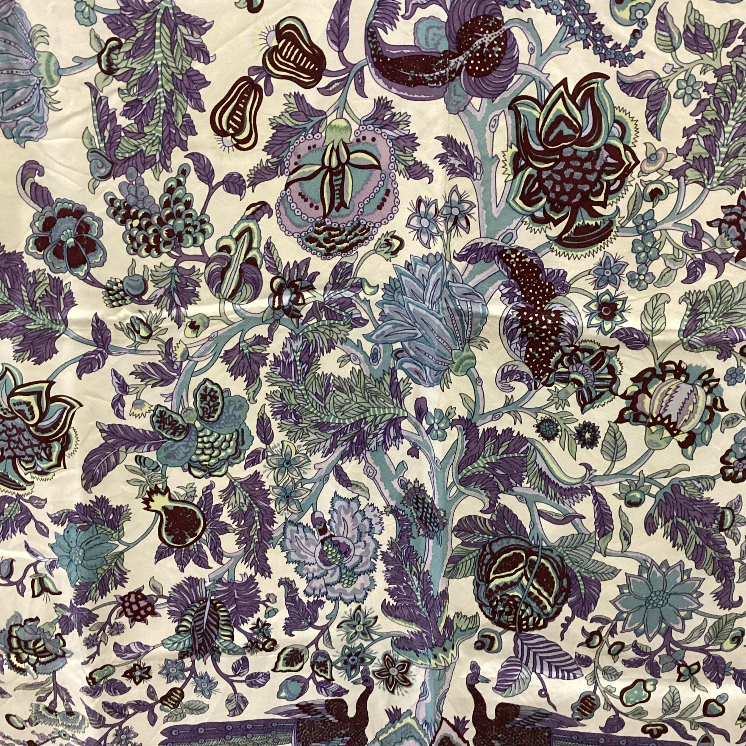 シルク素材の孔雀とボタニカルな柄の繊細なプリントスカーフです