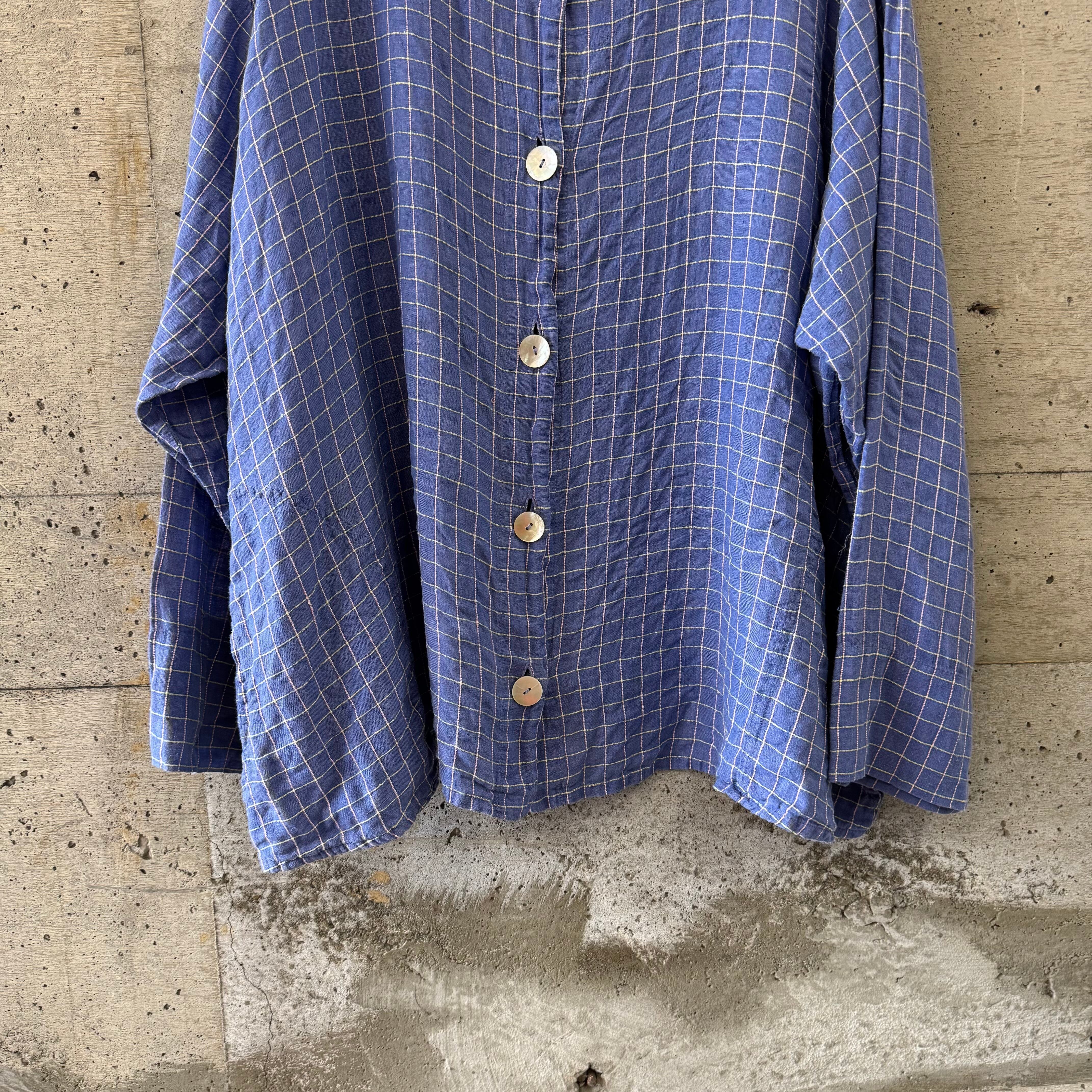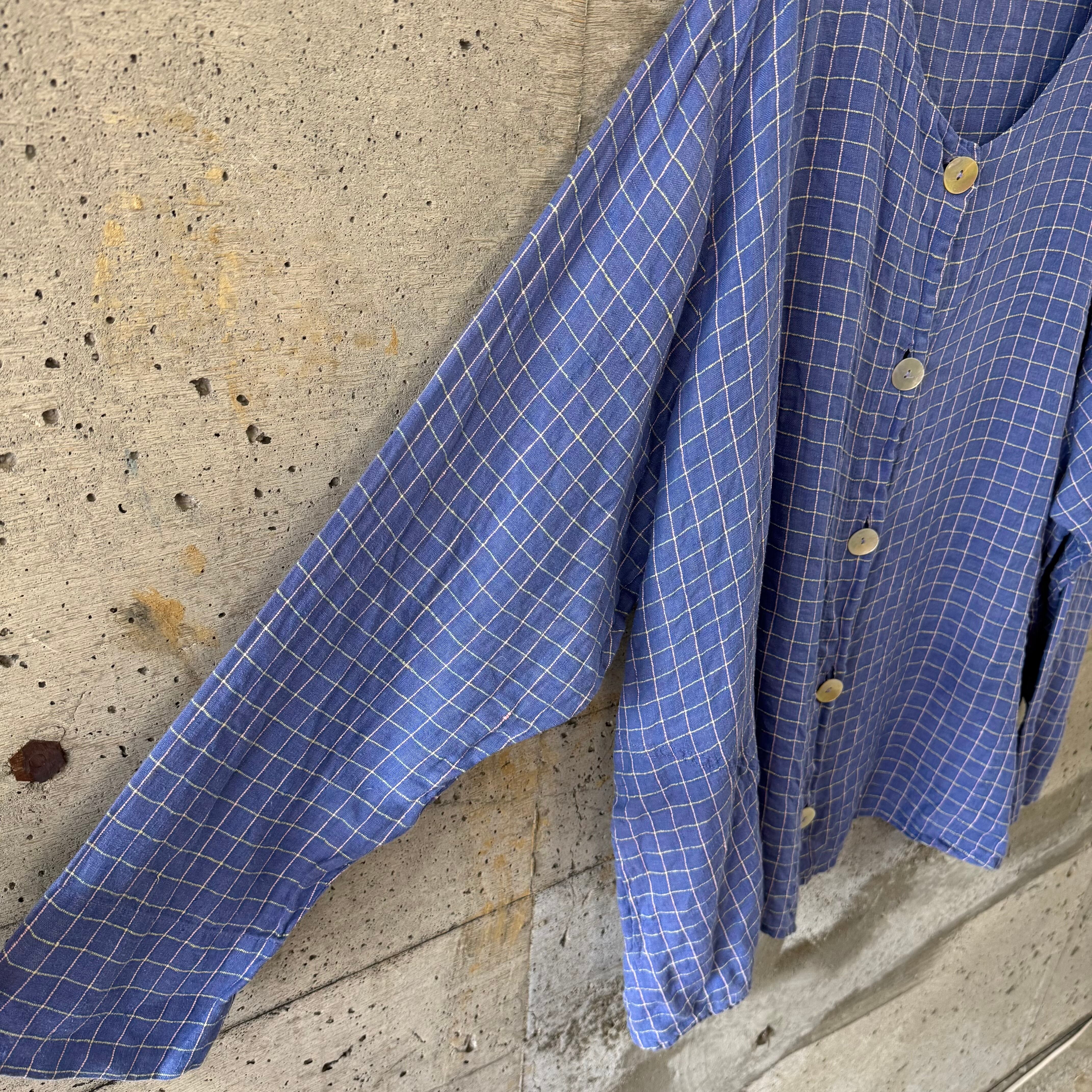 青ベースの生地にピンクと黄色の線で作られたチェック柄がとても可愛く、素朴さもありながらコーディネートのポイントになってくれます。