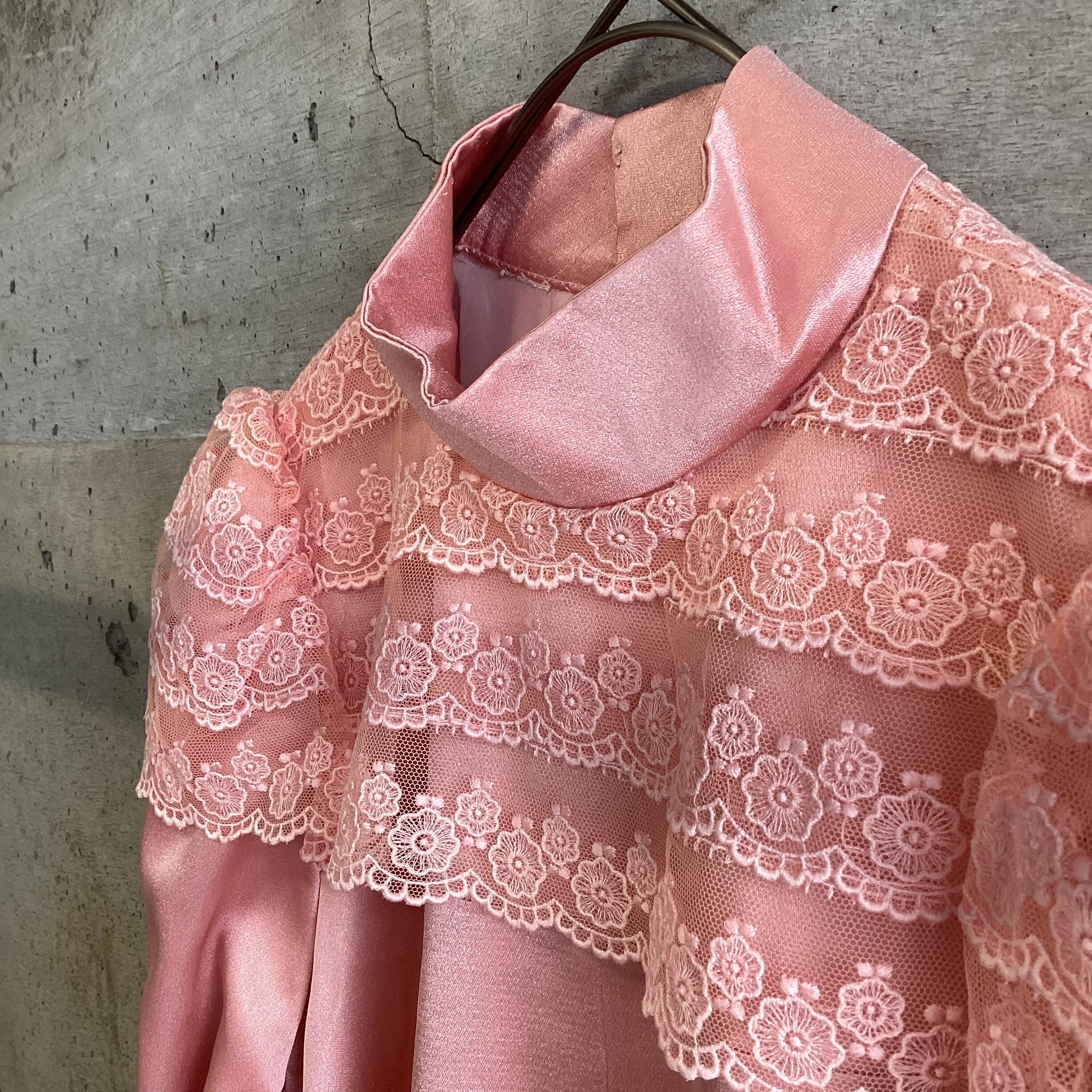 光沢のあるピンク色の生地に同色のレースが可愛らしいワンピースです。
