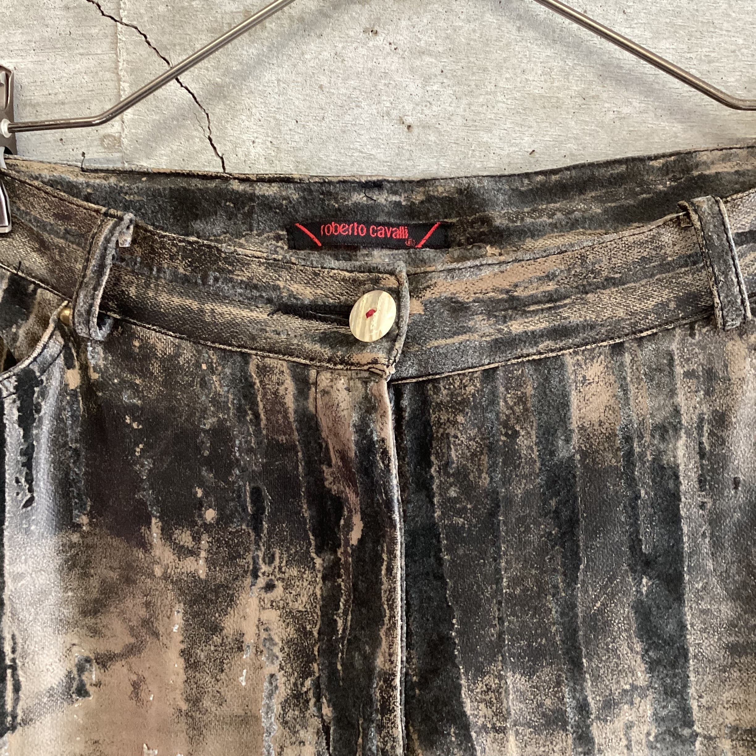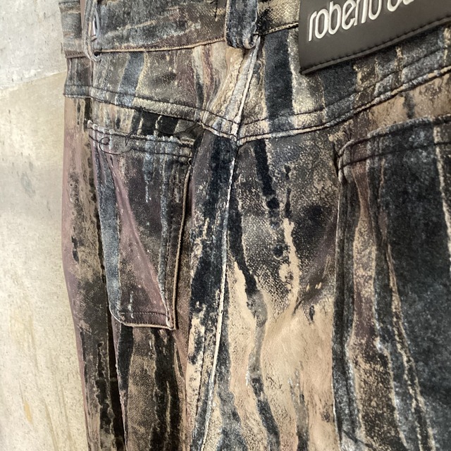 伸縮性のあるフェイクレザーにフロッキー加工が所々施されたパンツです。