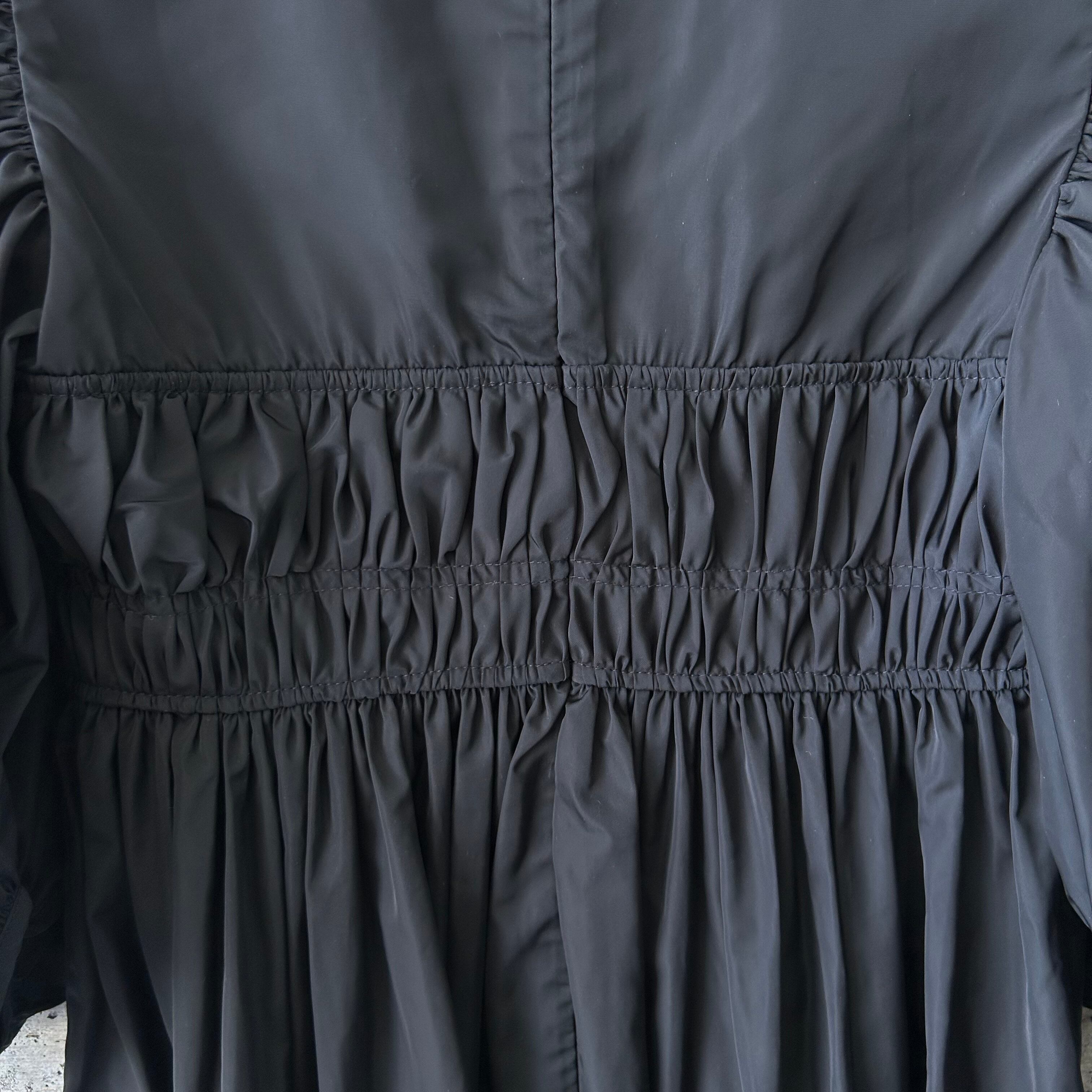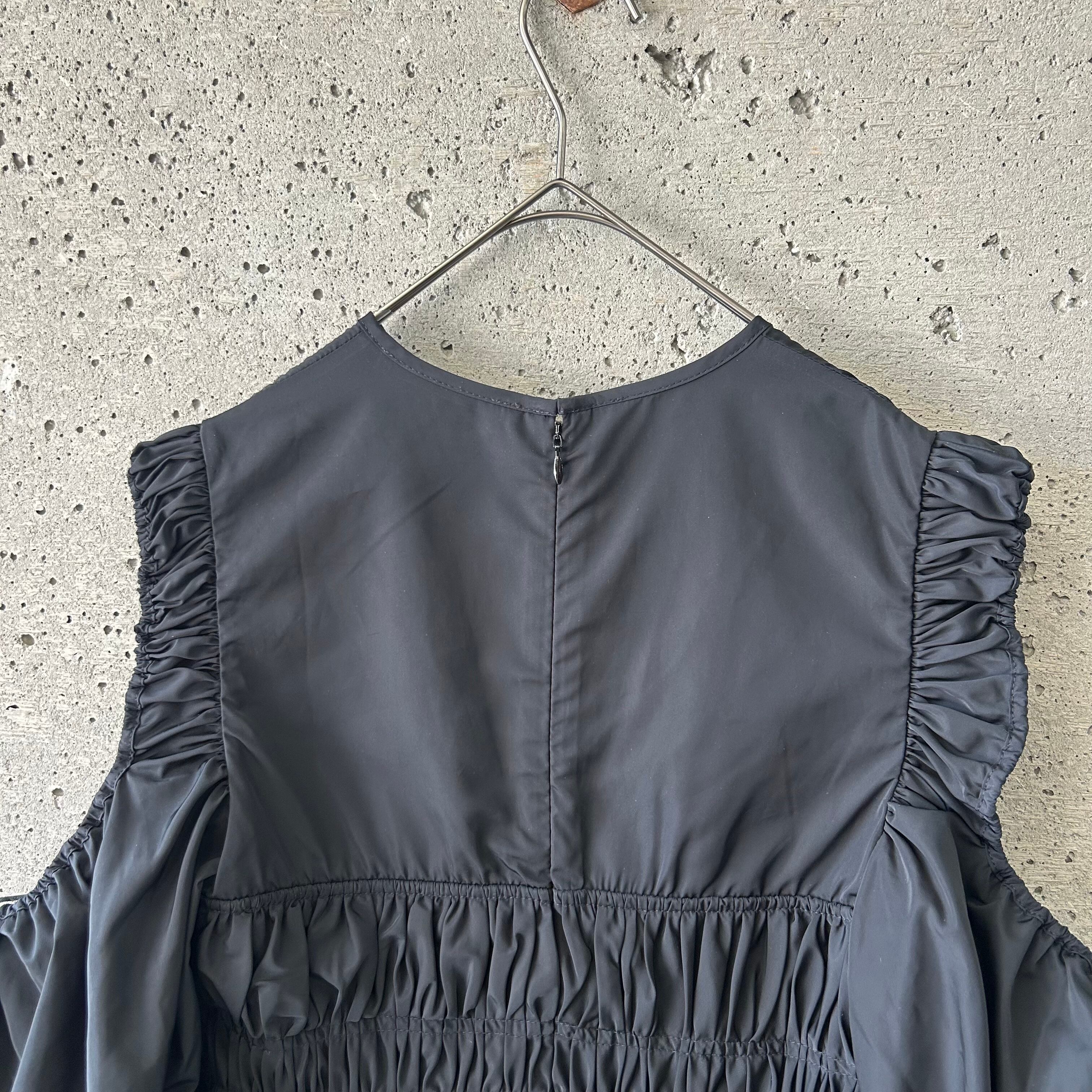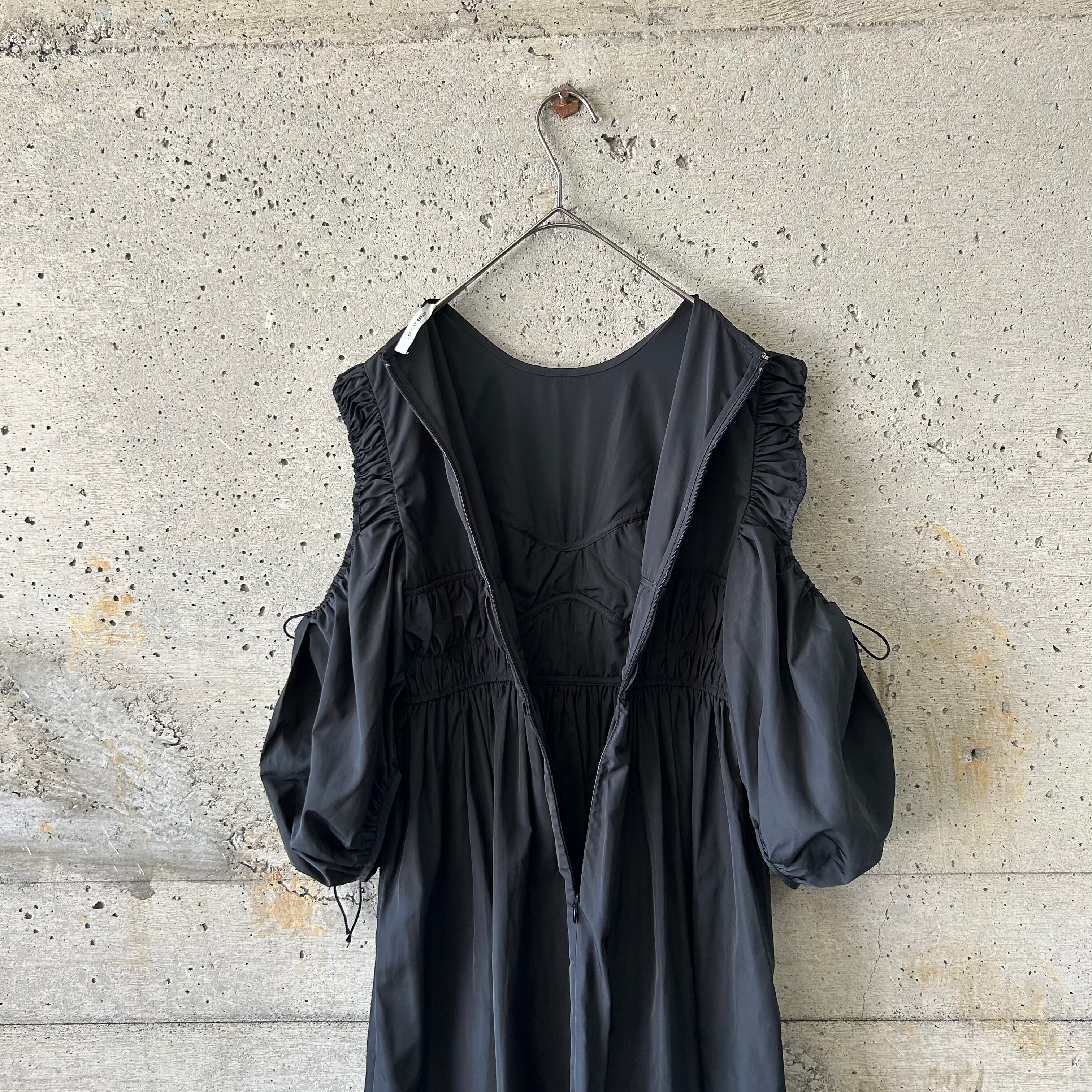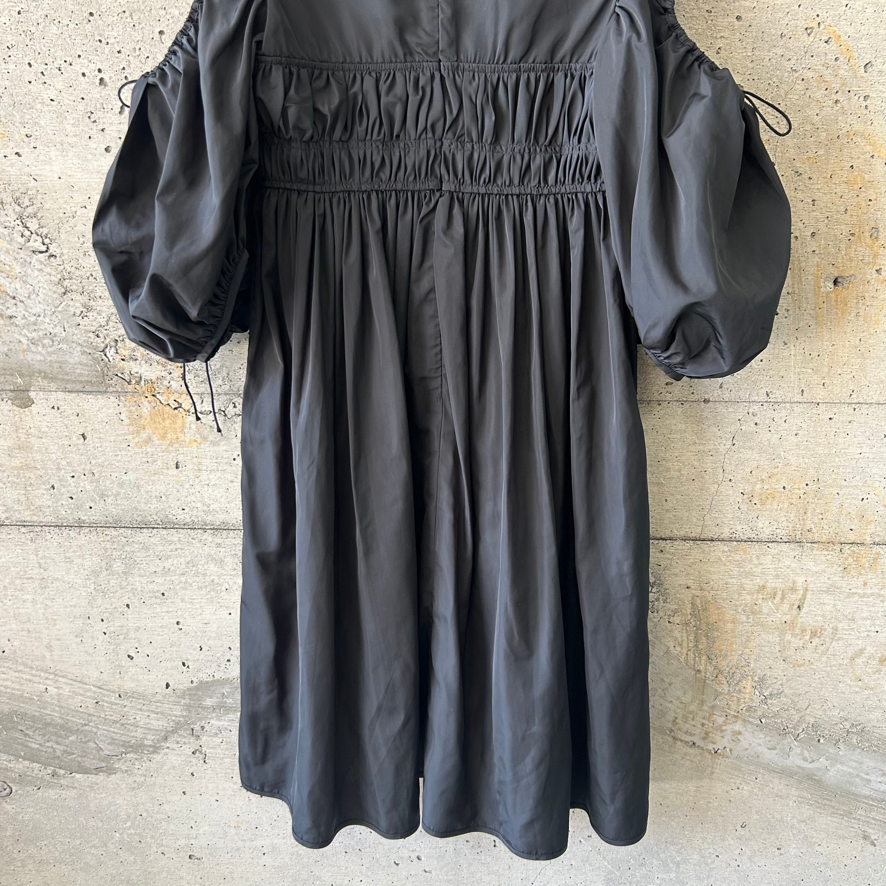 このワンピースも例に漏れなく、ボリュームのあるオープンショルダーの袖がとても可愛らしい雰囲気ですが、ボディの方はギャザーを寄せて可愛らしさを演出しながら体にフィットするようなシルエットになっています。