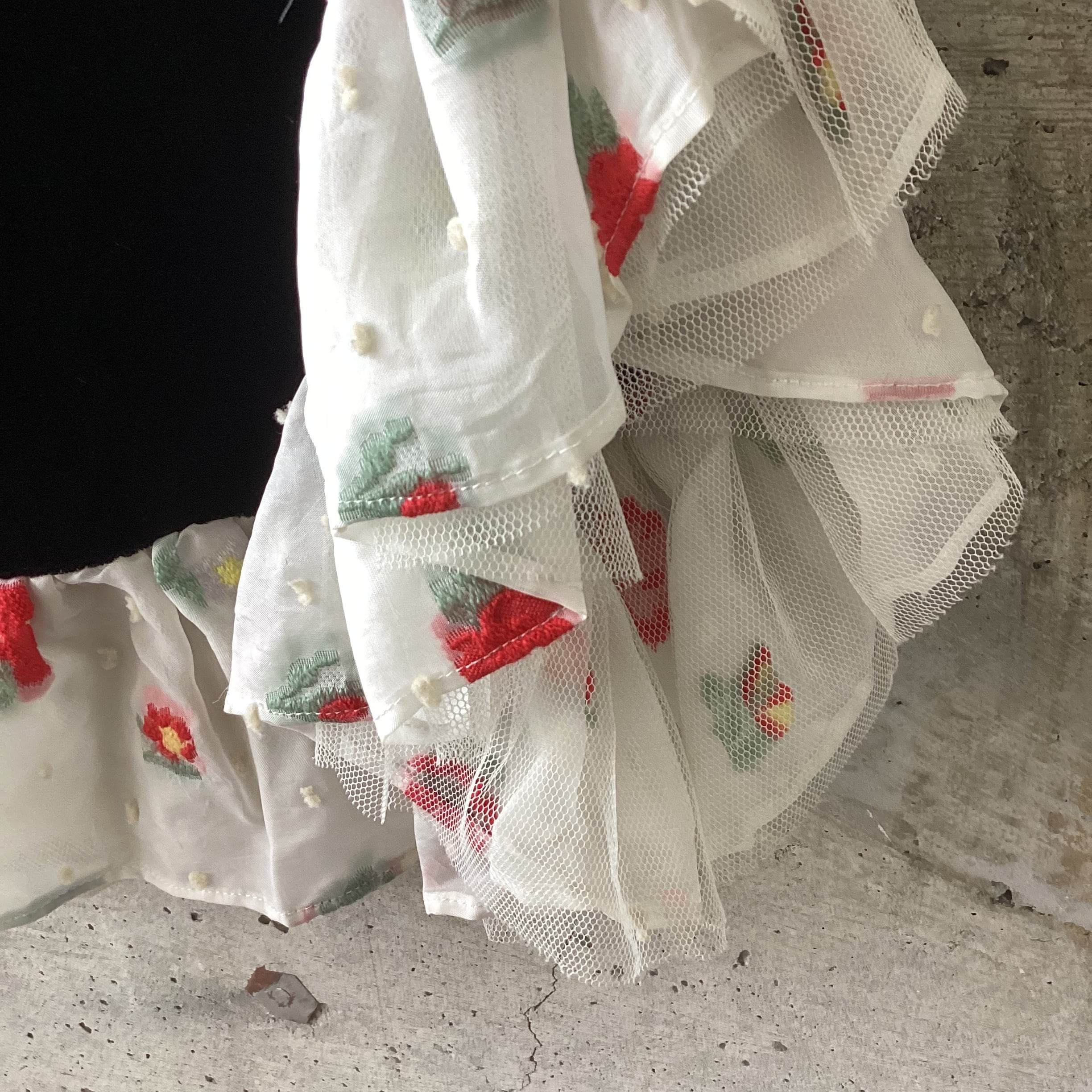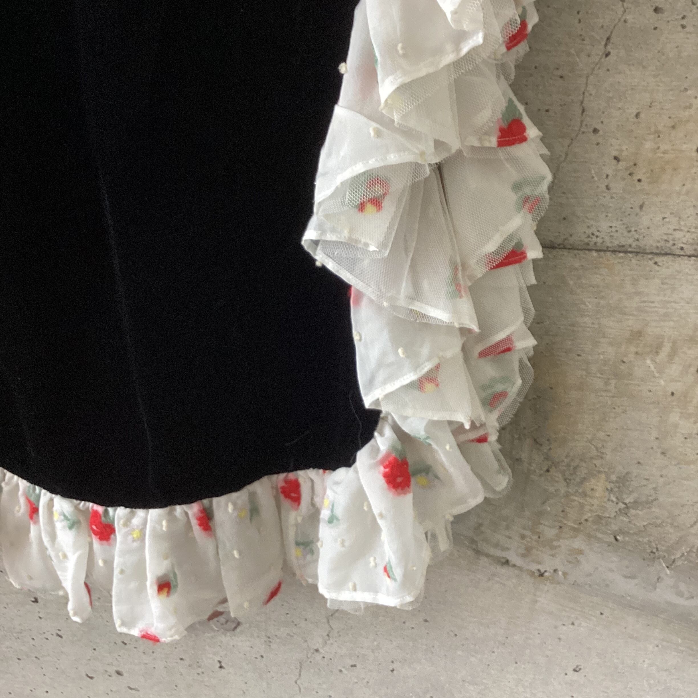 ベロアのスカートのウエスト以外の縁にチュールレースと立体的な刺繍の布の縁取りがされたスカートです