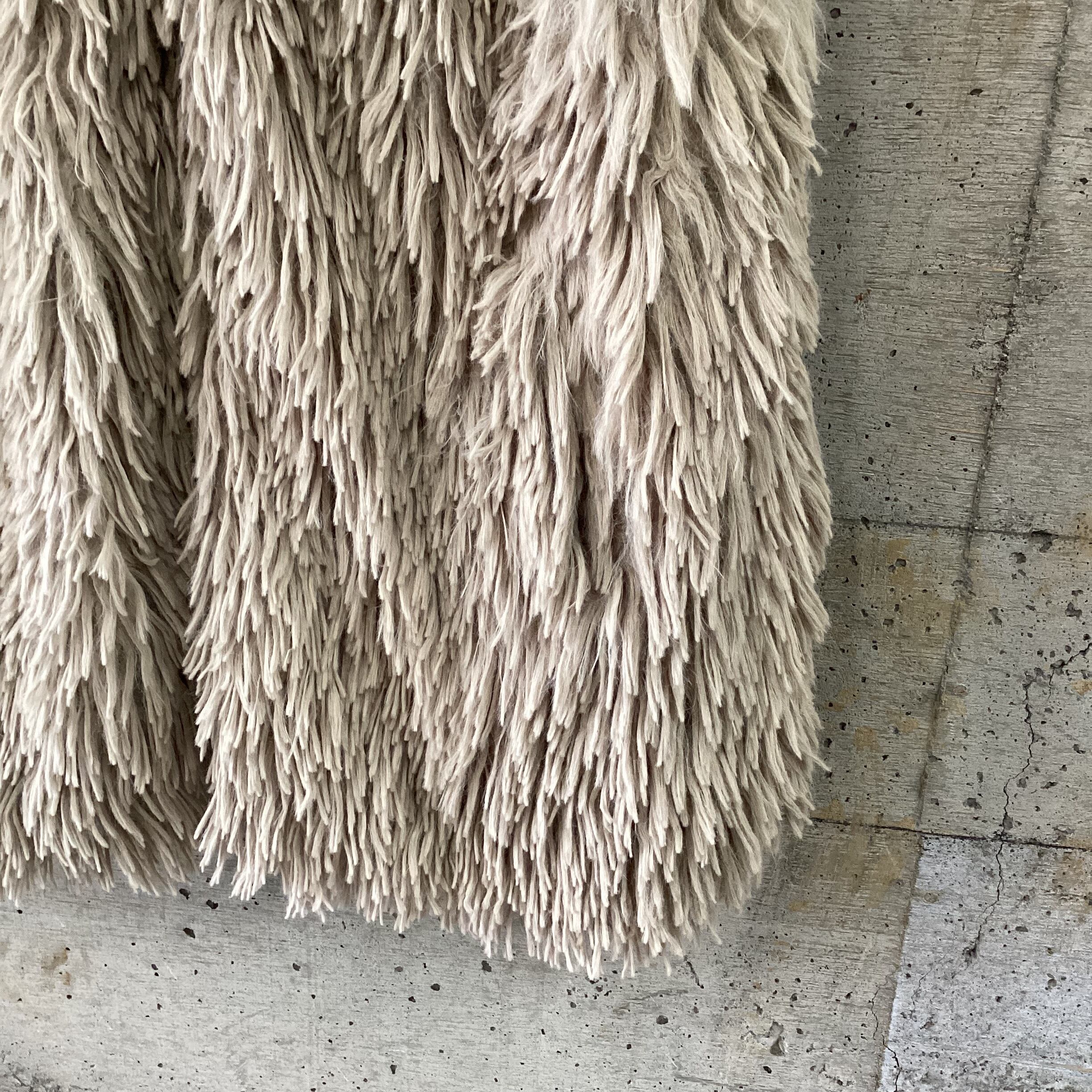 ふさふさなグレージュのフード付きベストです。