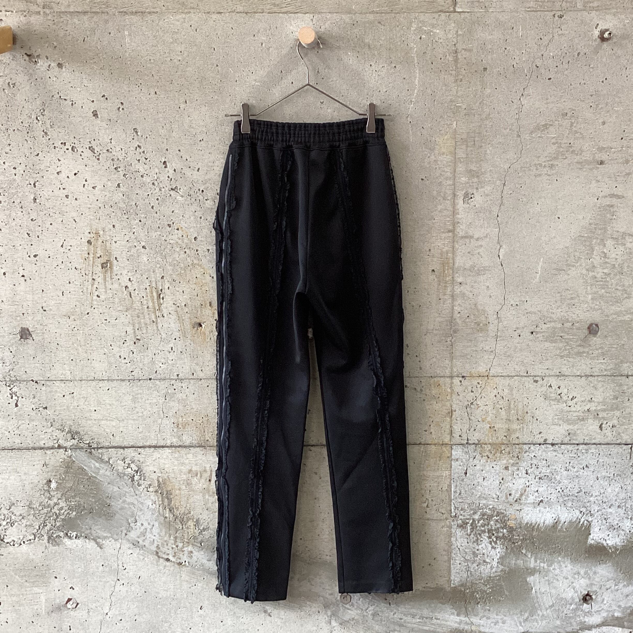 前後のセンターラインとサイドにレースが付いたトラックパンツです