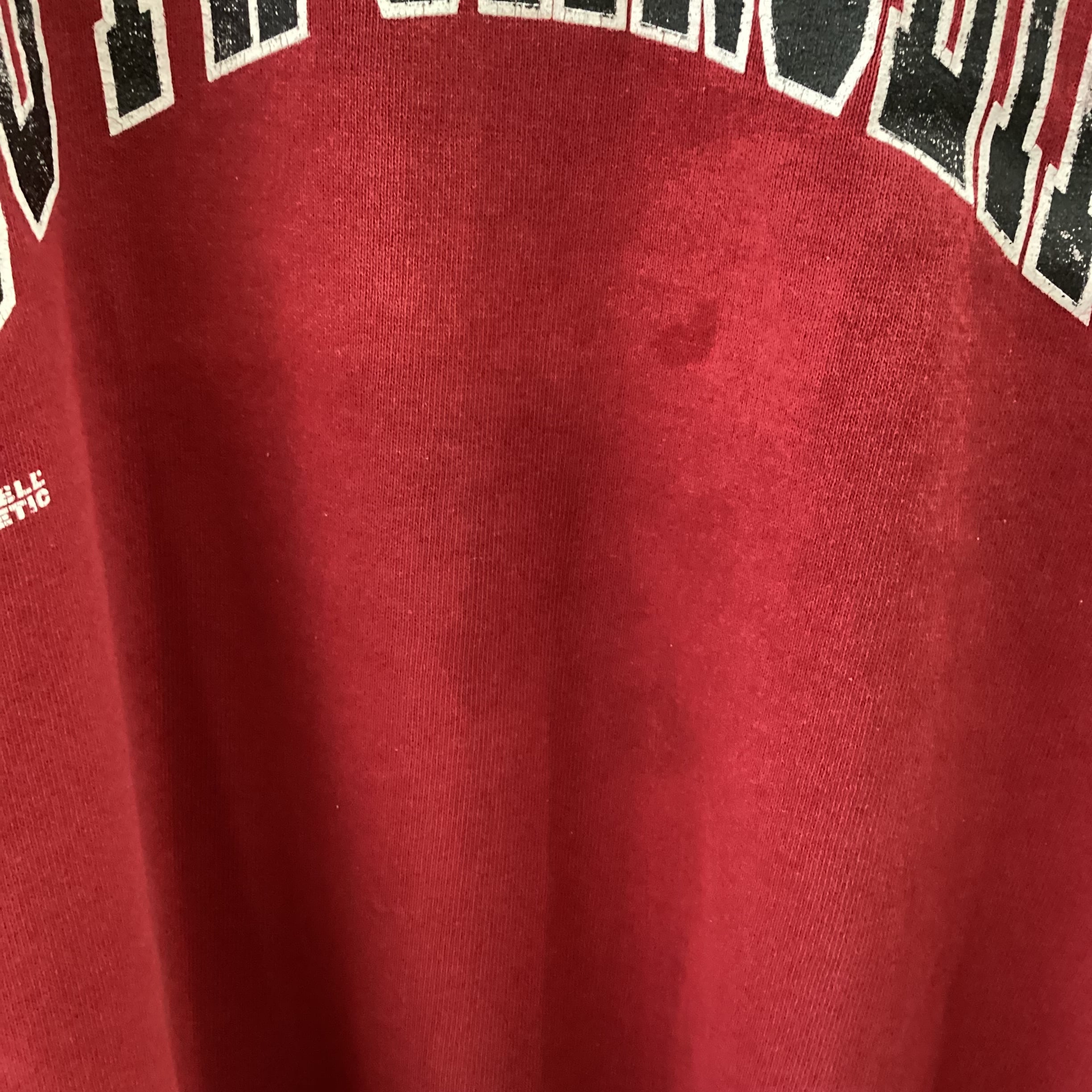 深めな赤色と英字のプリントでスタンダードなデザインですが、サイズで遊ぶととてもユニークなコーディネートが組めます。