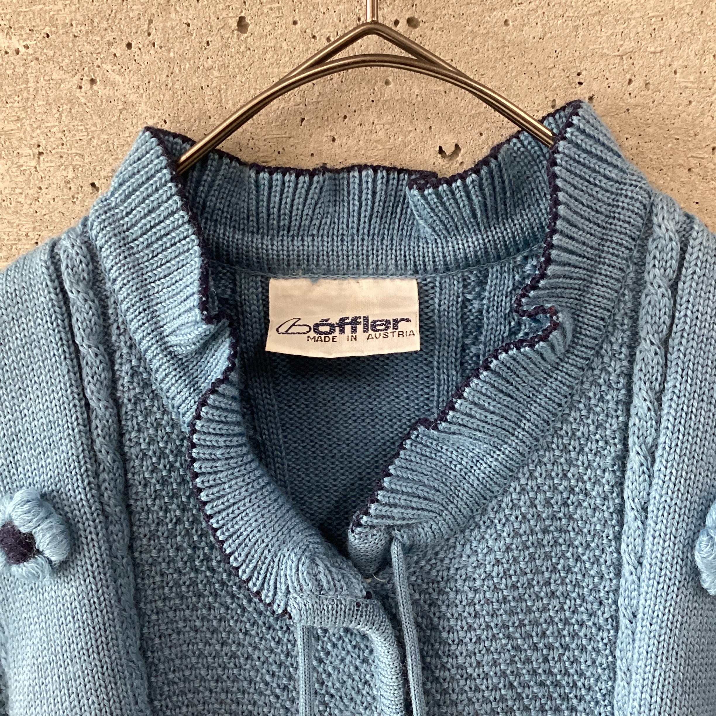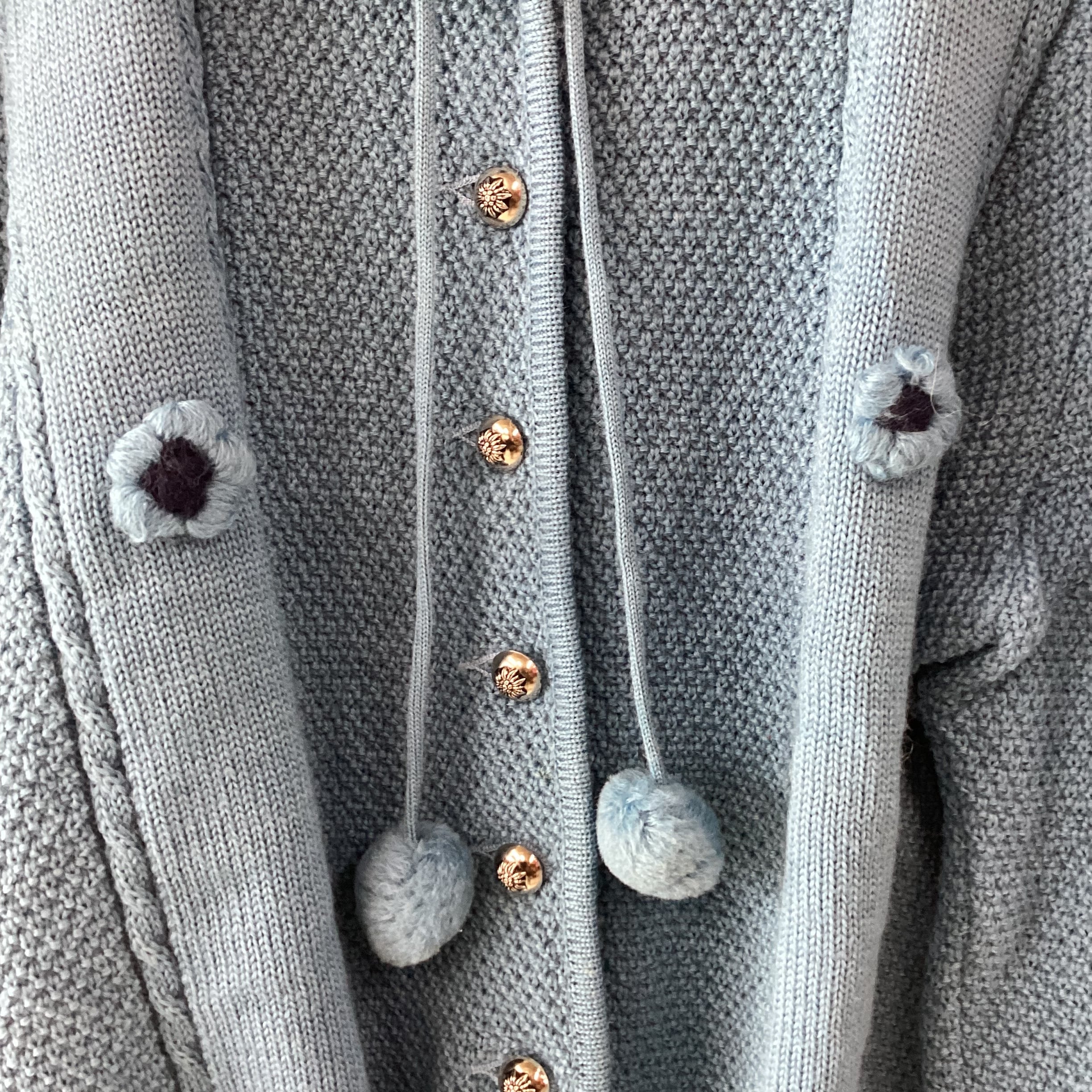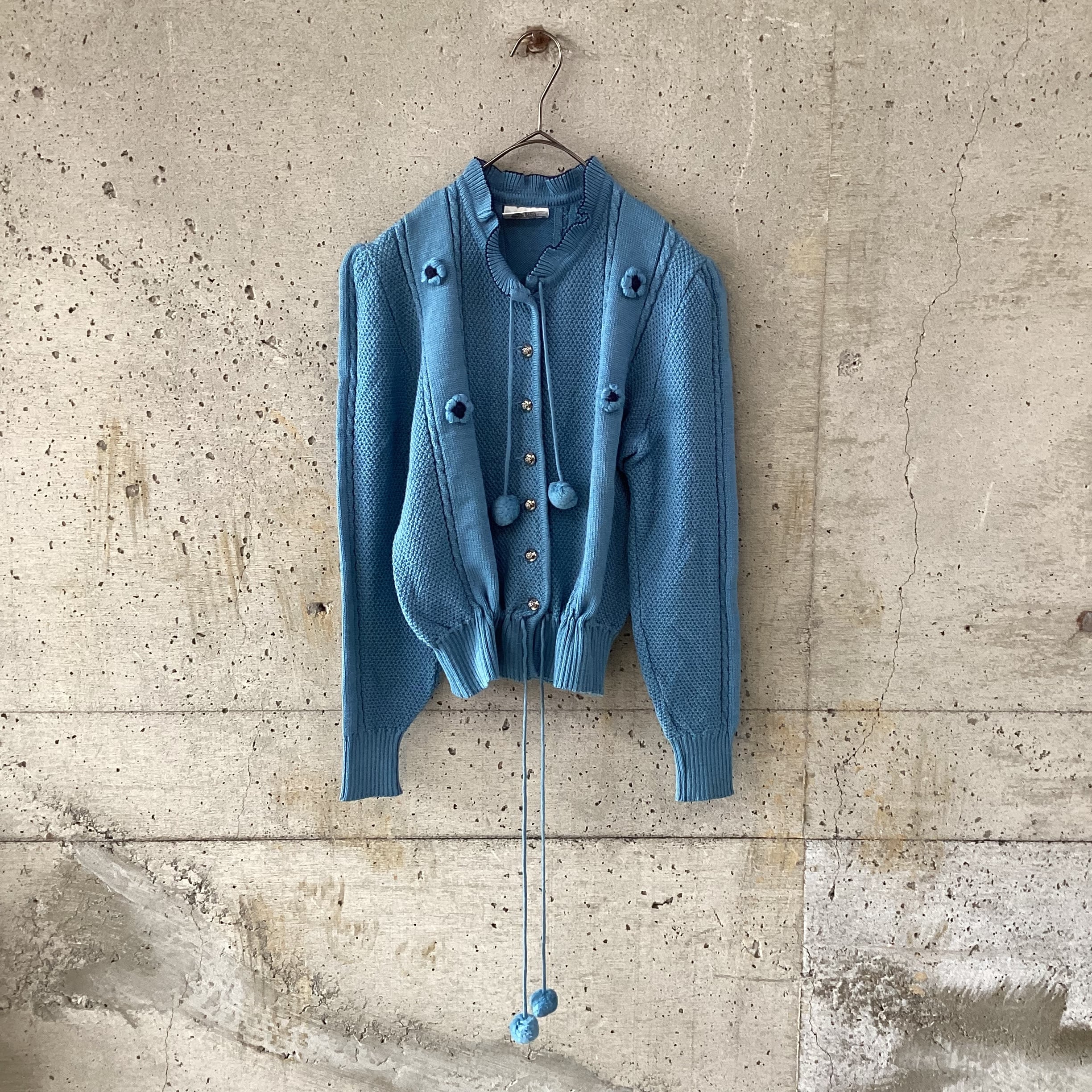 首元と裾にポンポンのついたニットカーディガンです。