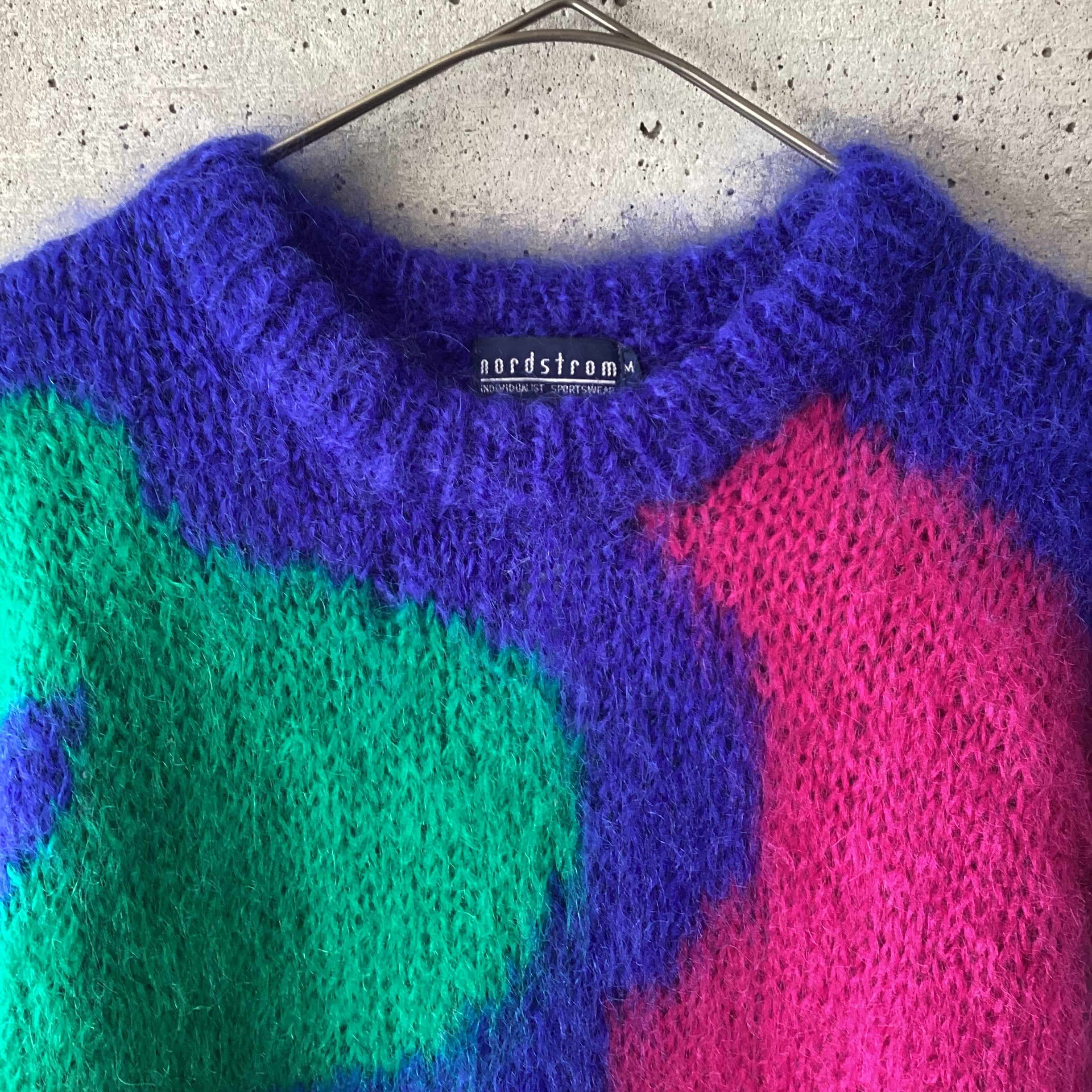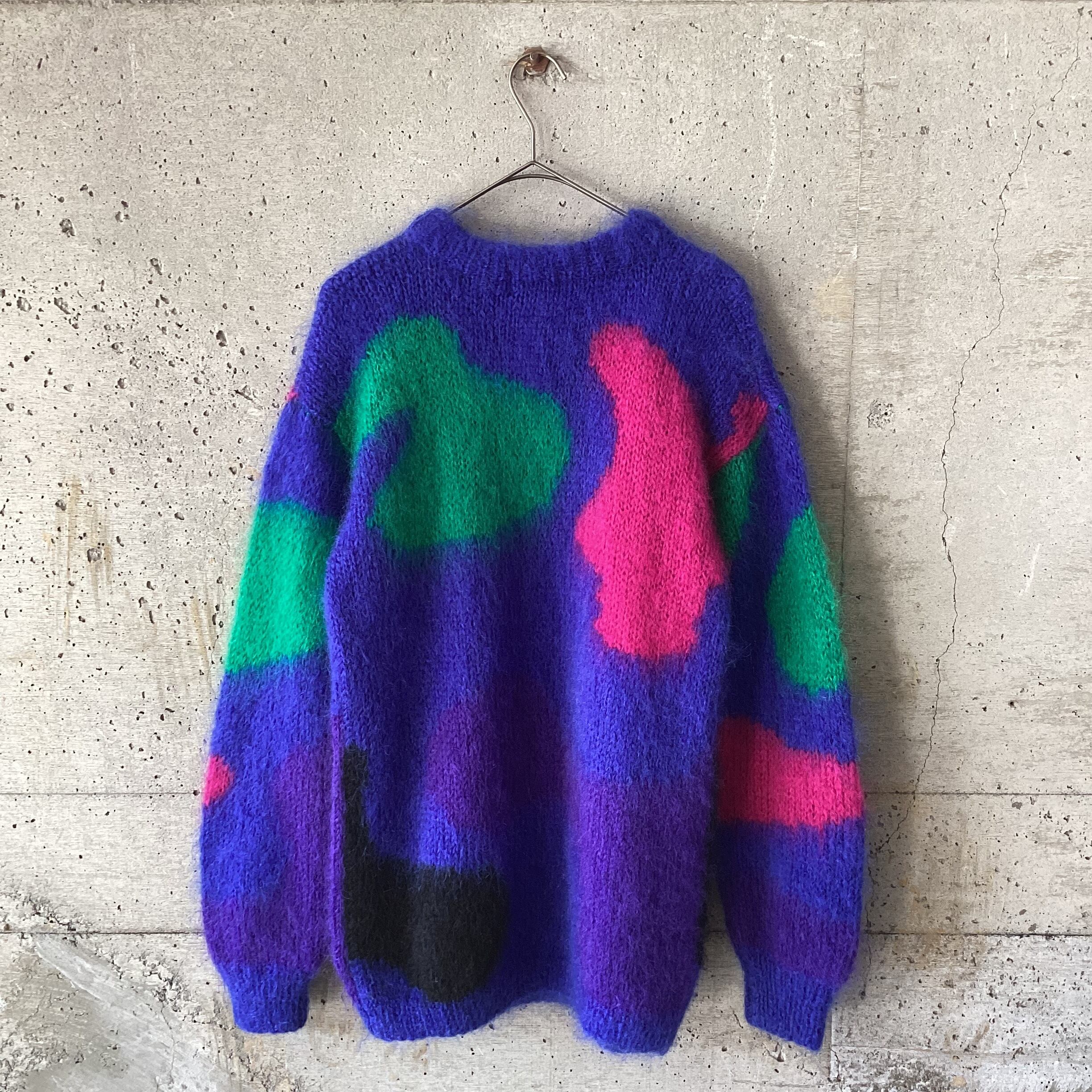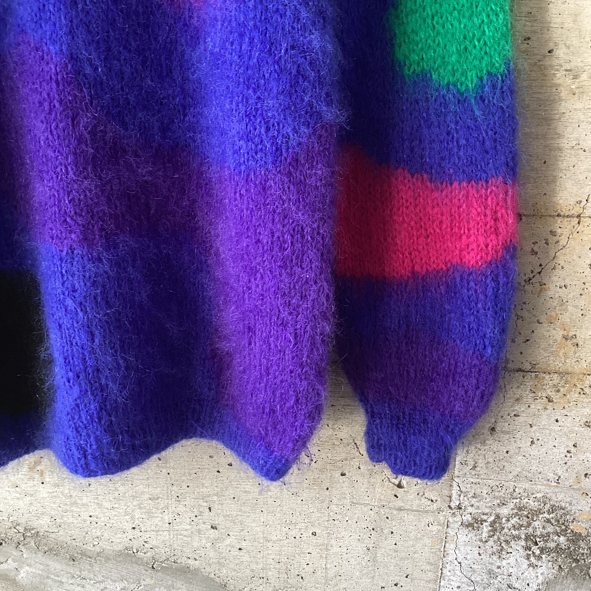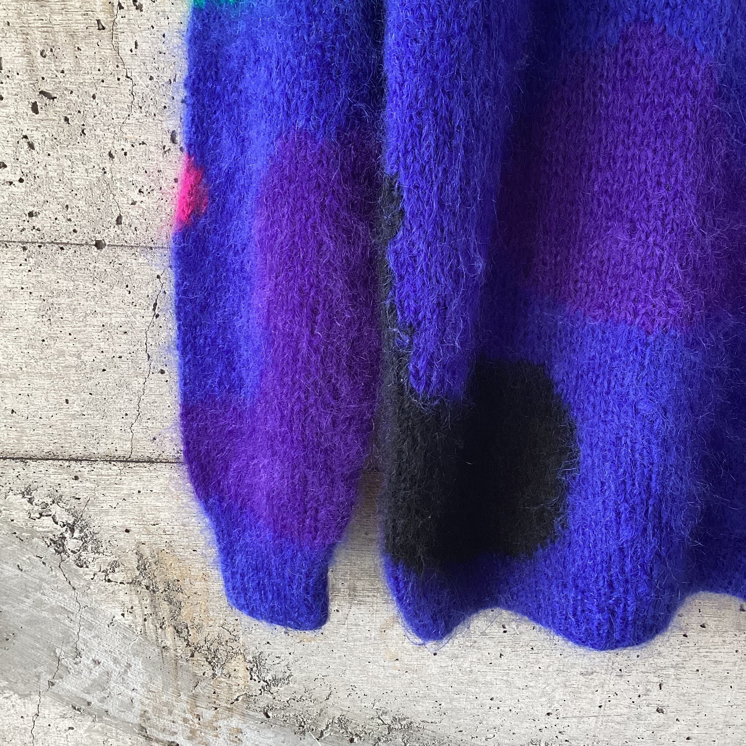 青のベースにピンクやグリーンパープルなどが斑らに編み込まれています。