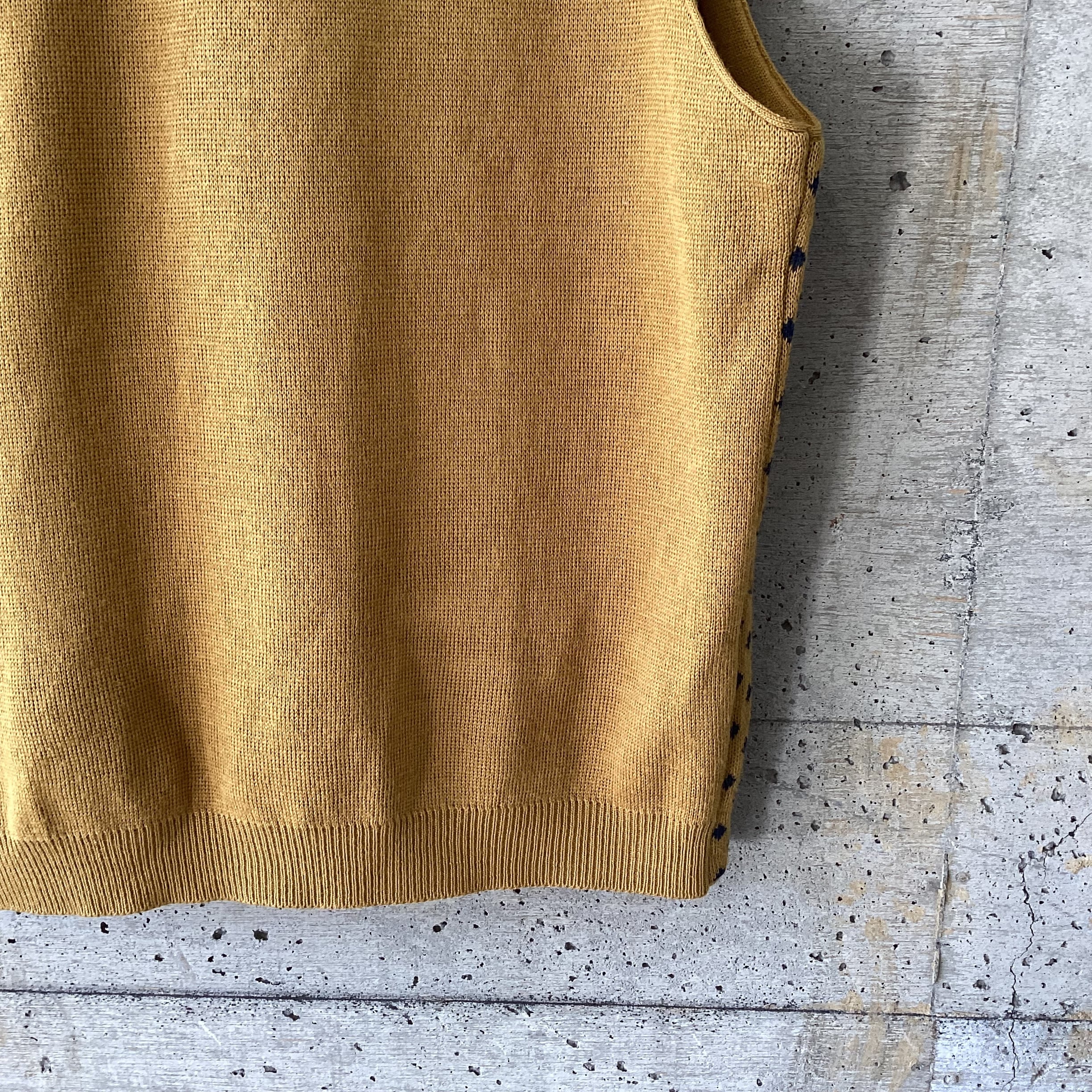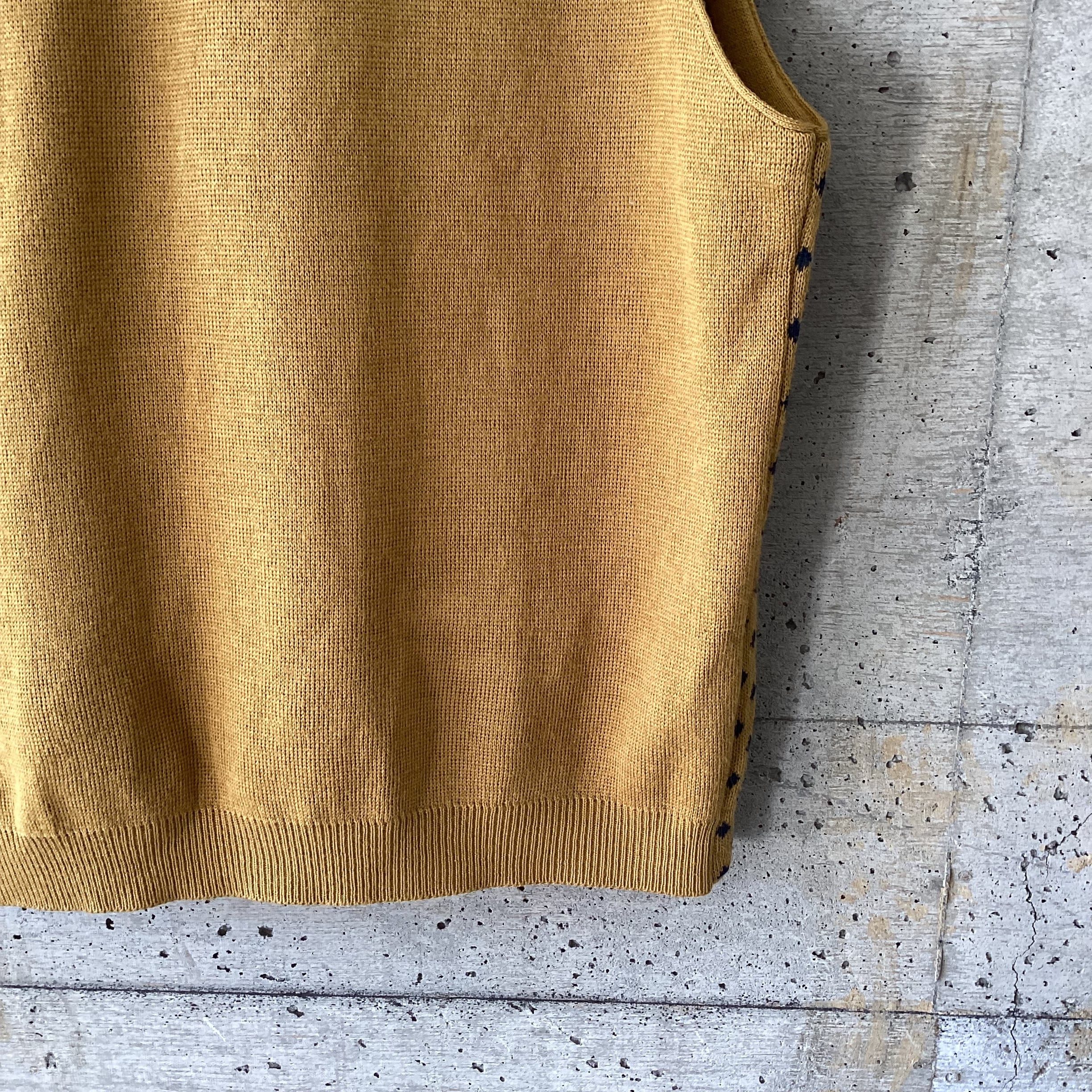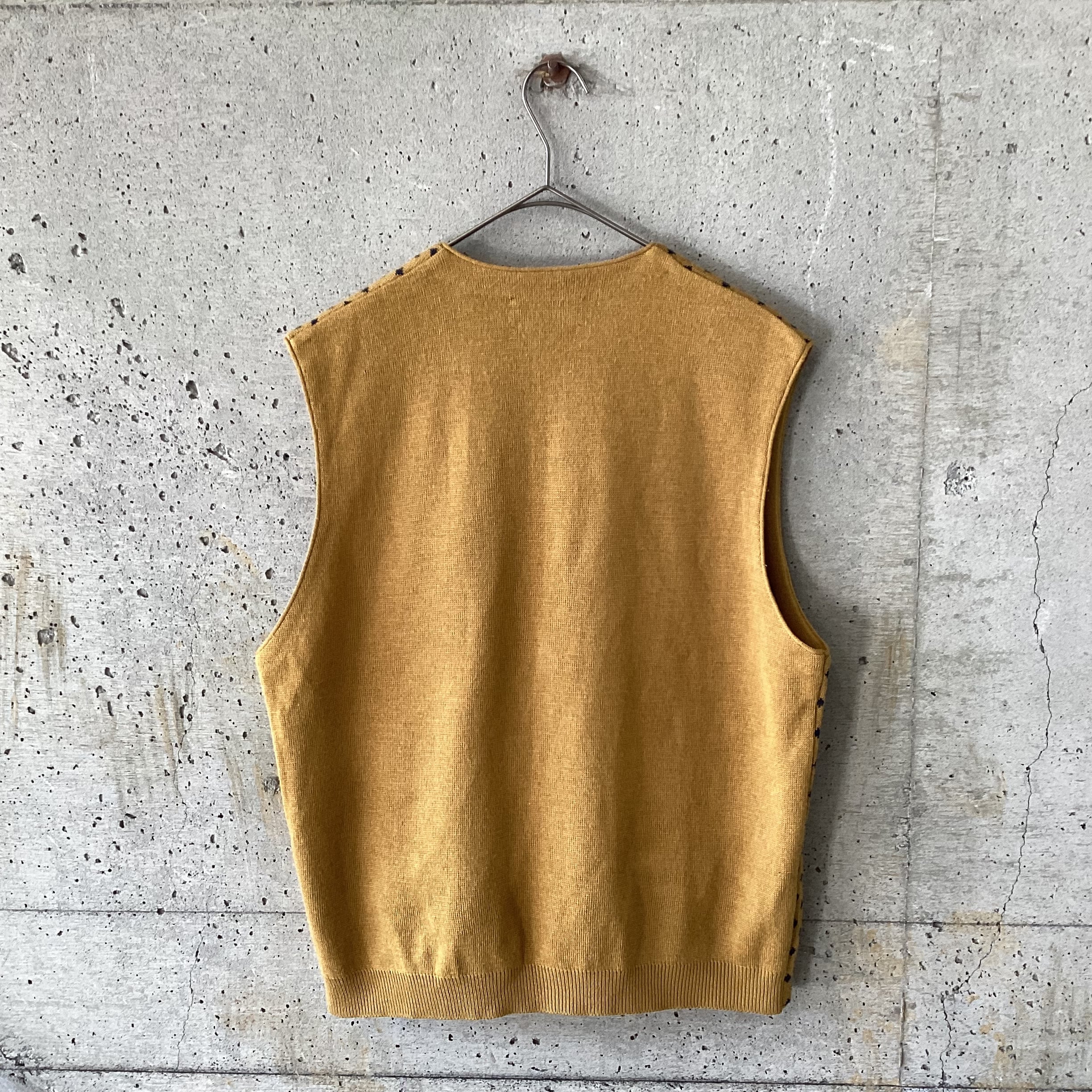 マスタード色にネイビーの菱形の色の掛け合わせや柄が素敵なニットベストです