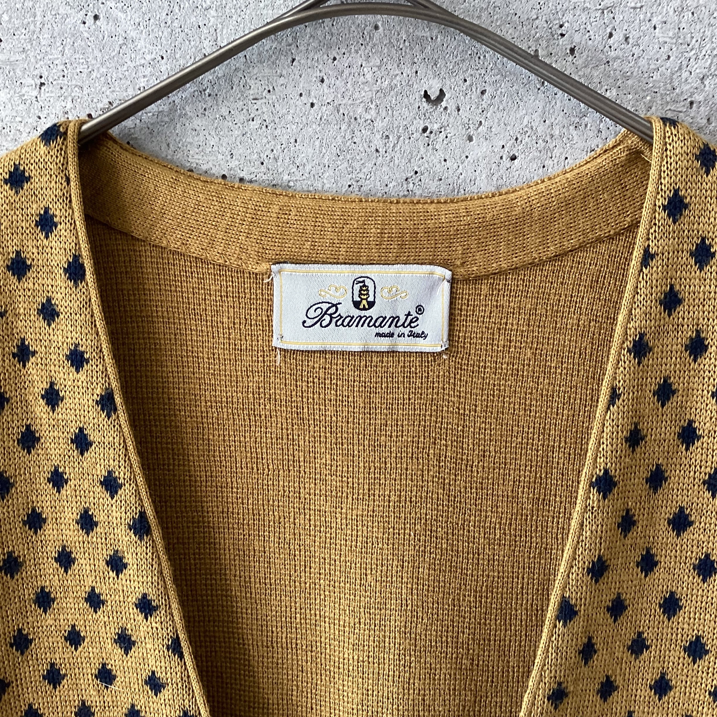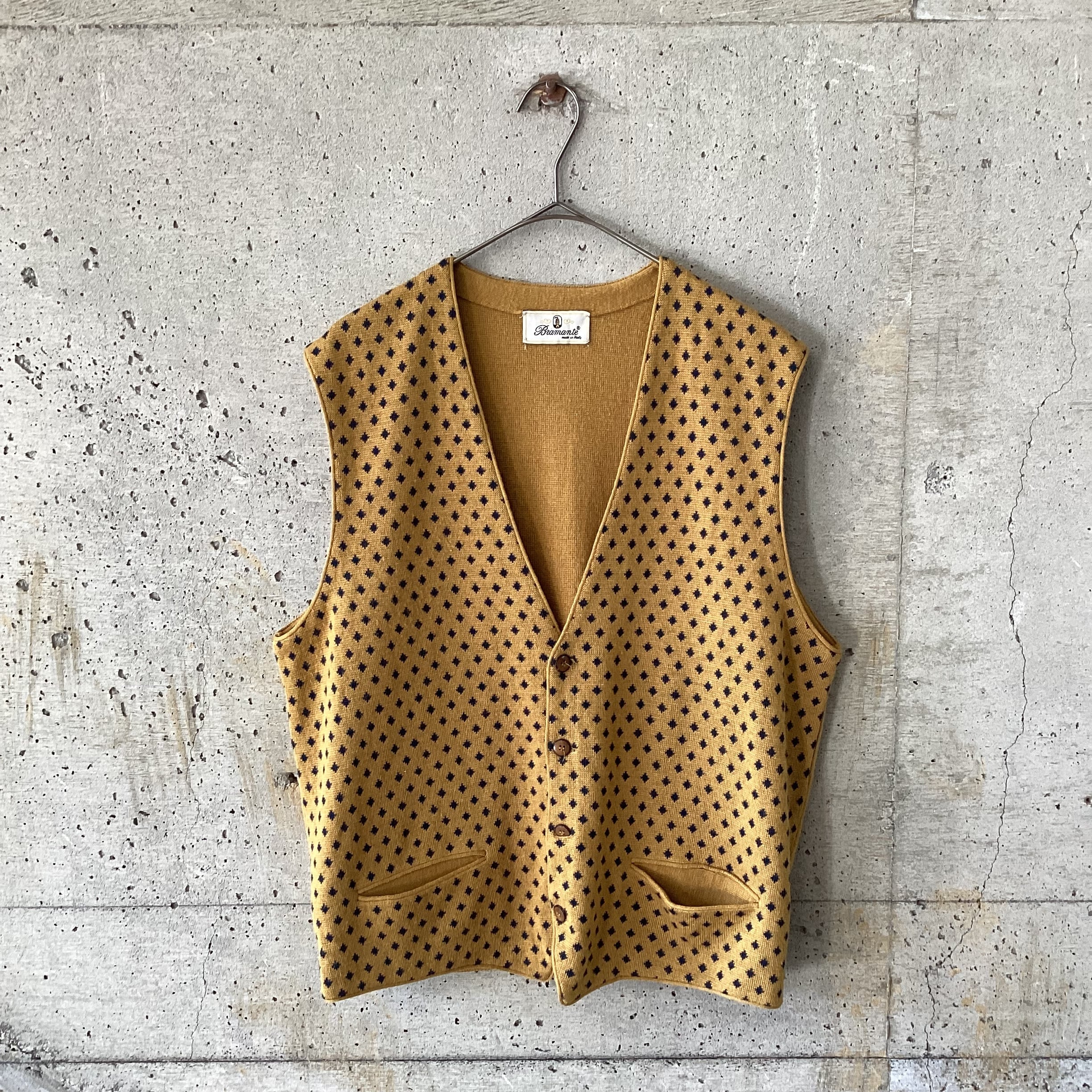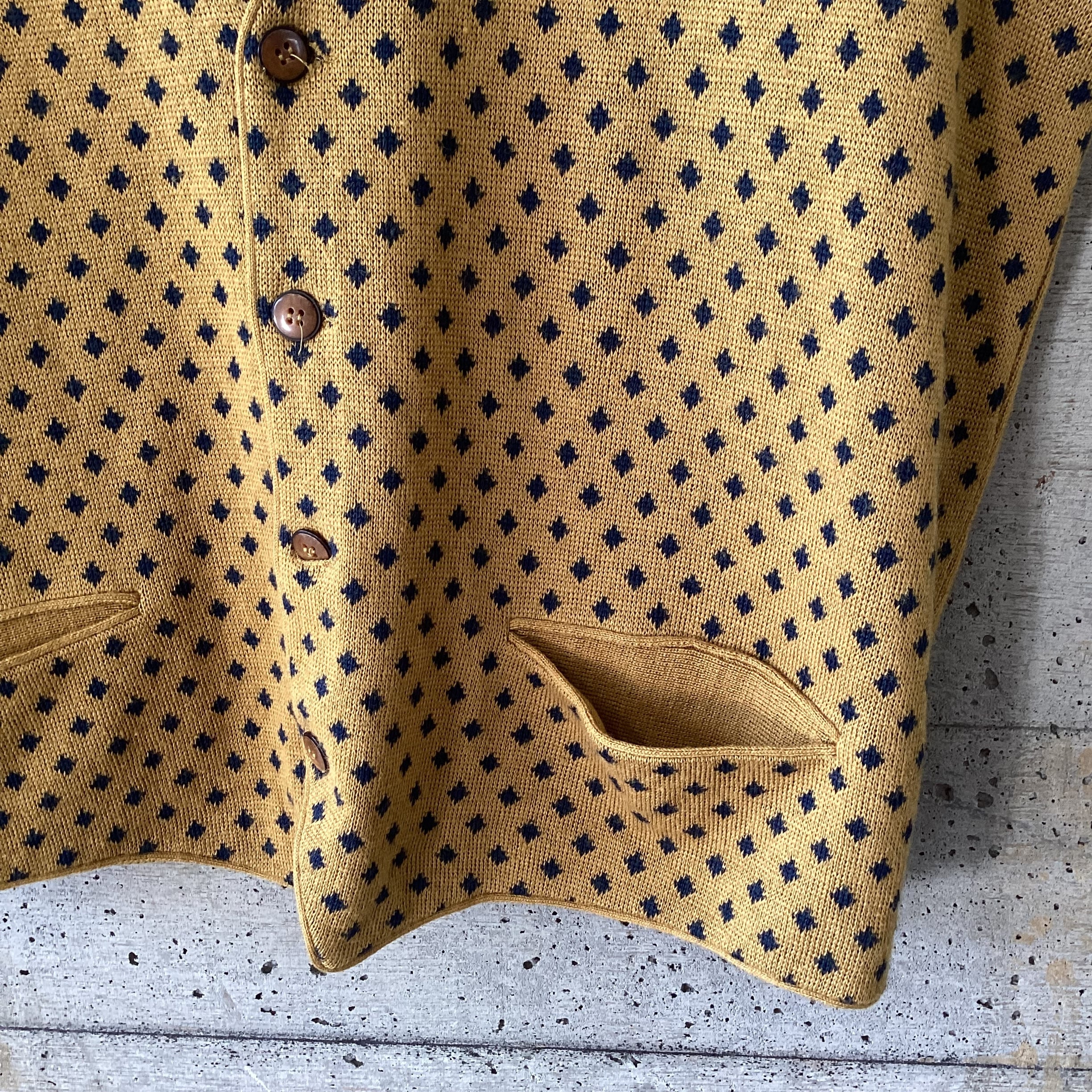 マスタード色にネイビーの菱形の色の掛け合わせや柄が素敵なニットベストです