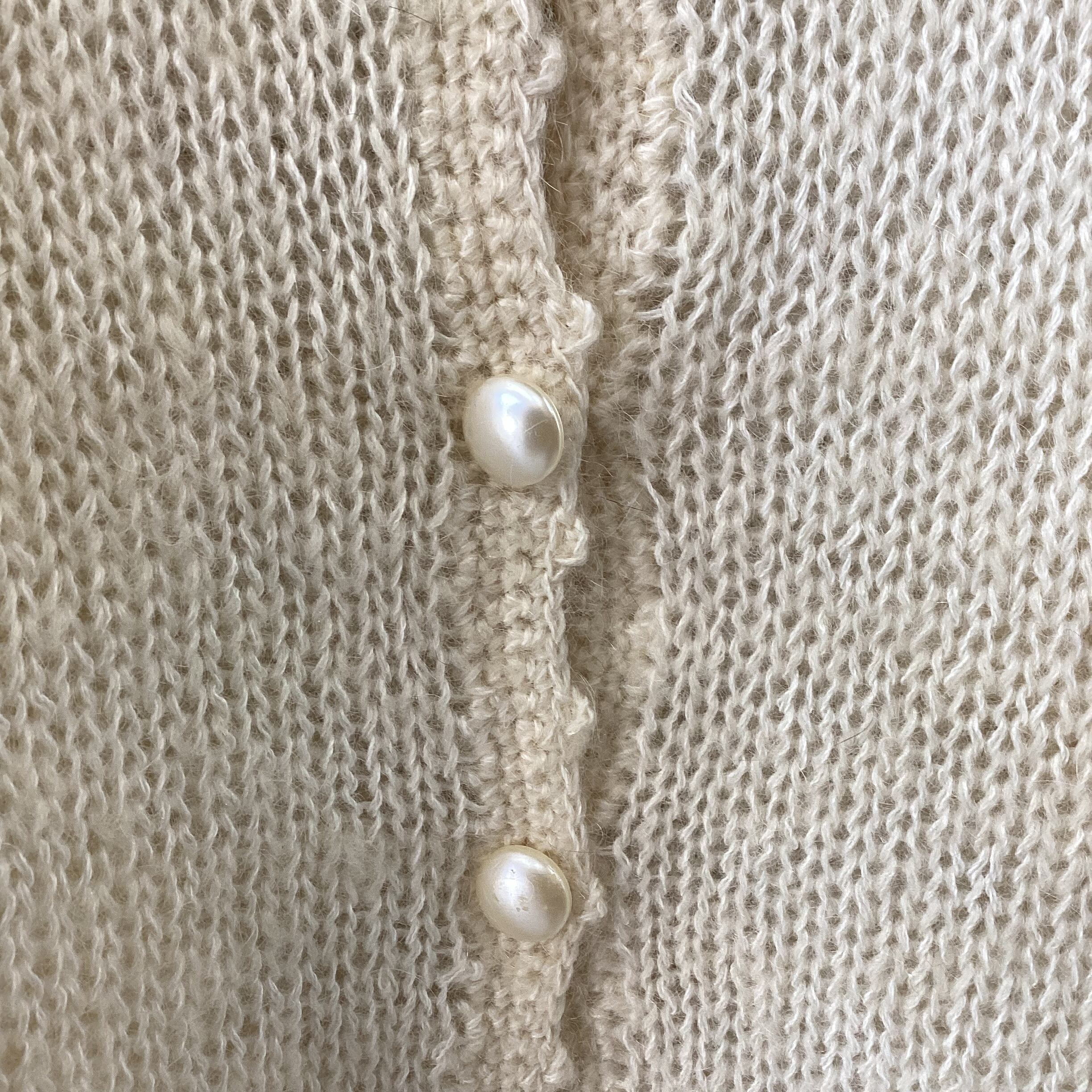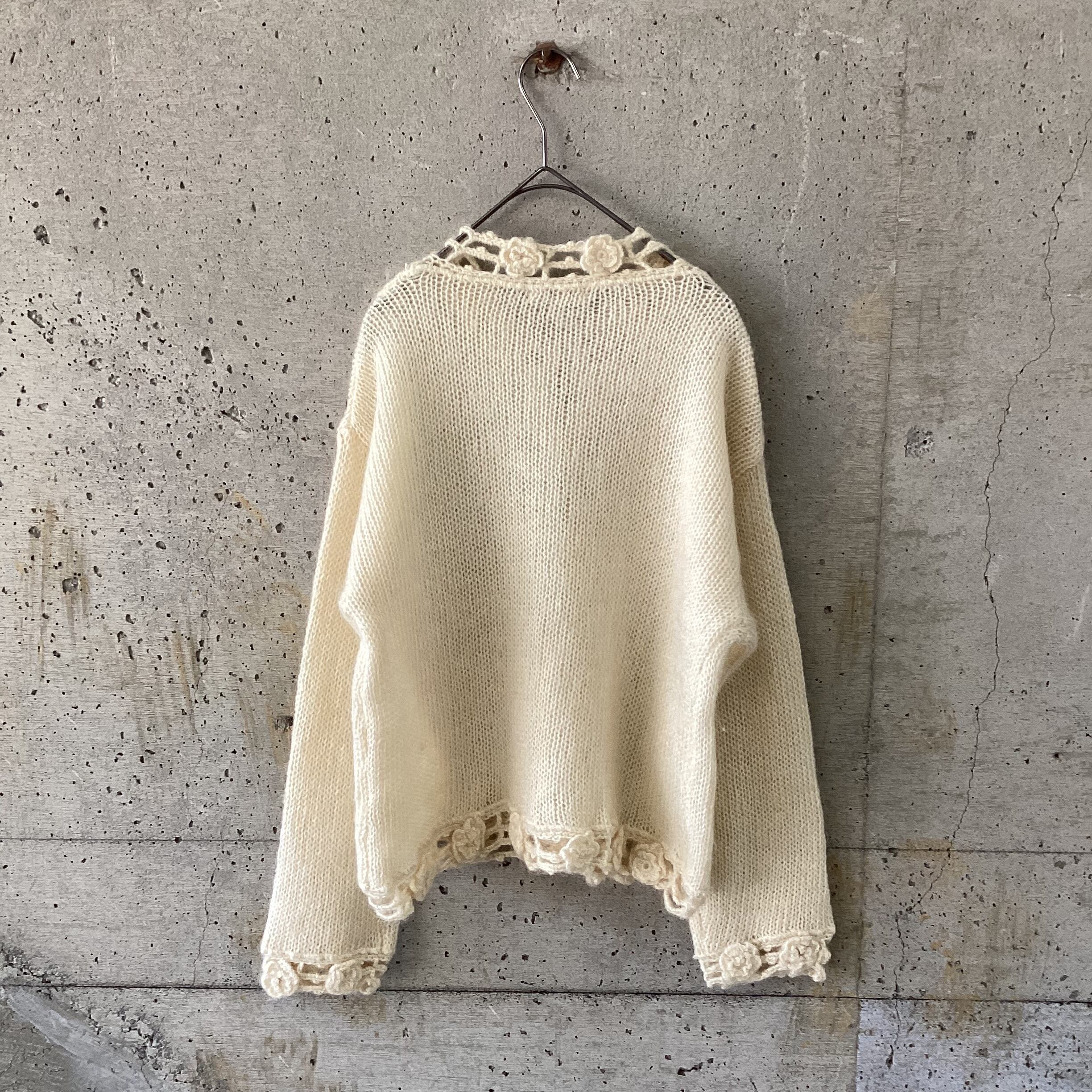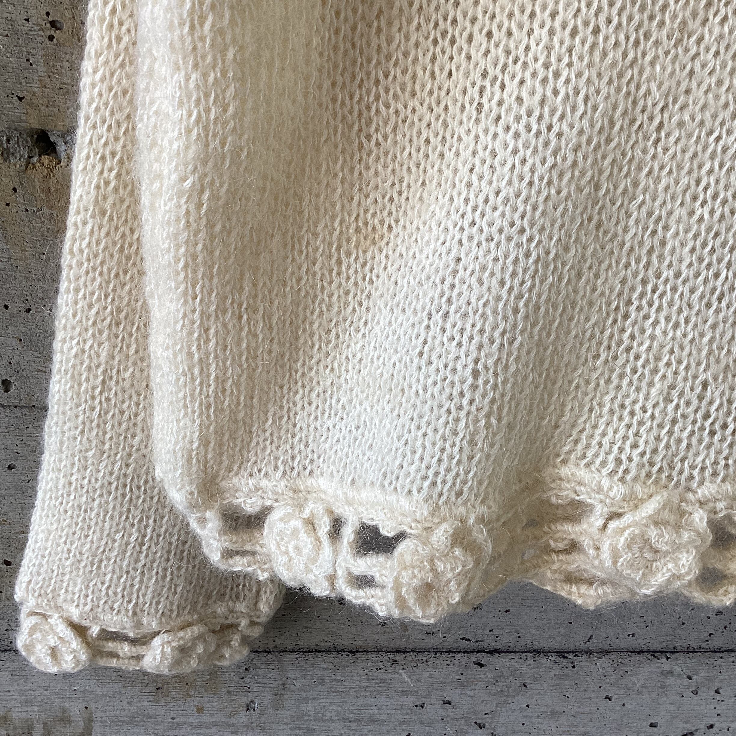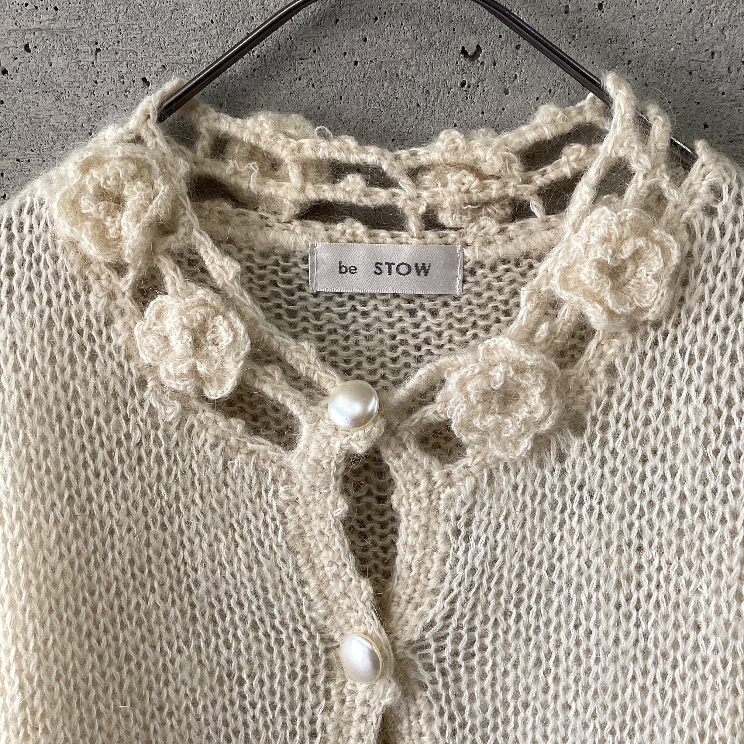 ふわふわのモヘアに、縁には小さな花モチーフがついていて、女の子らしさがぎゅっと詰まったカーディガンです。