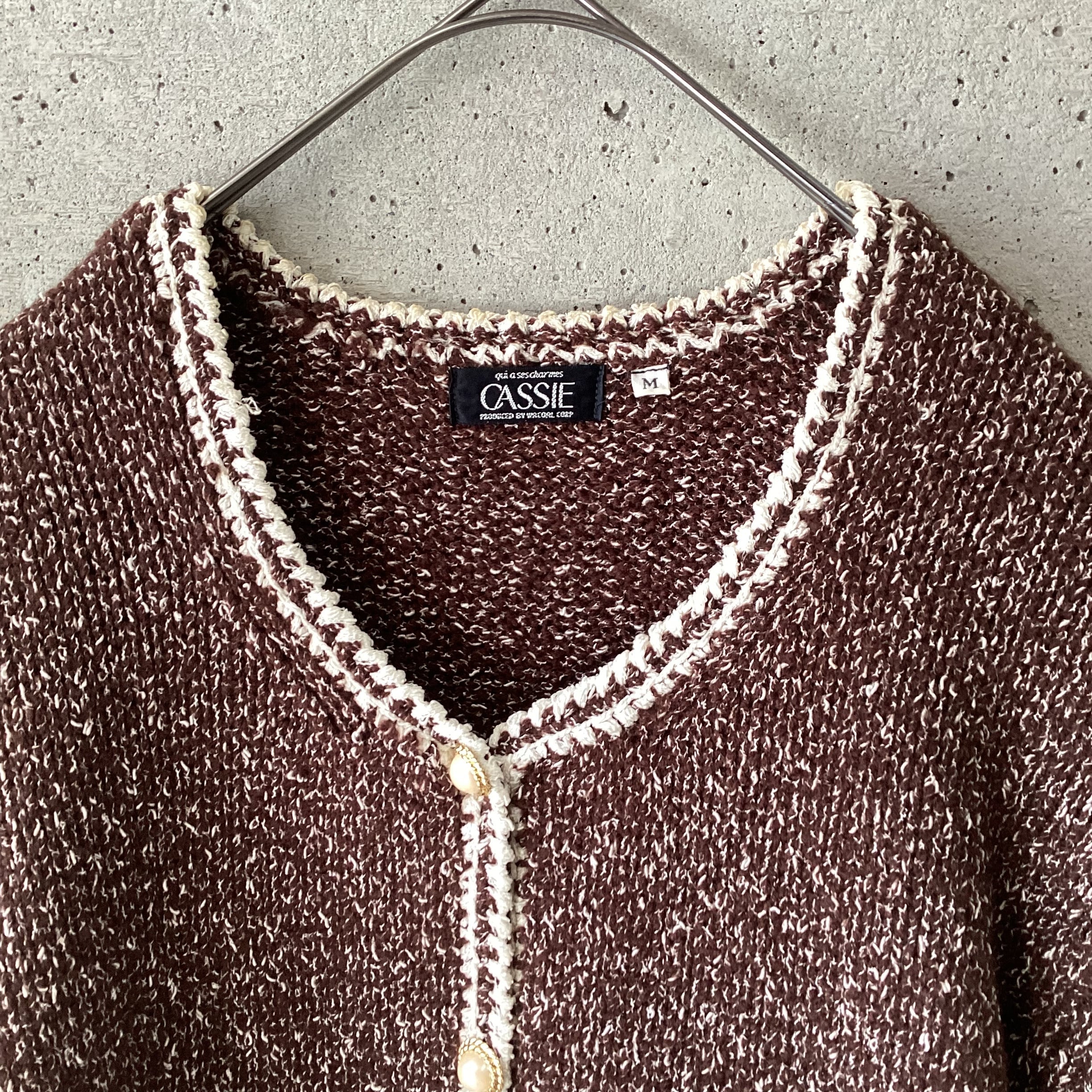 パールボタンや縁取りがツイードジャケットのような上品さを出しつつ、素材はニットなので伸縮性があり、とても着やすいアイテムです。