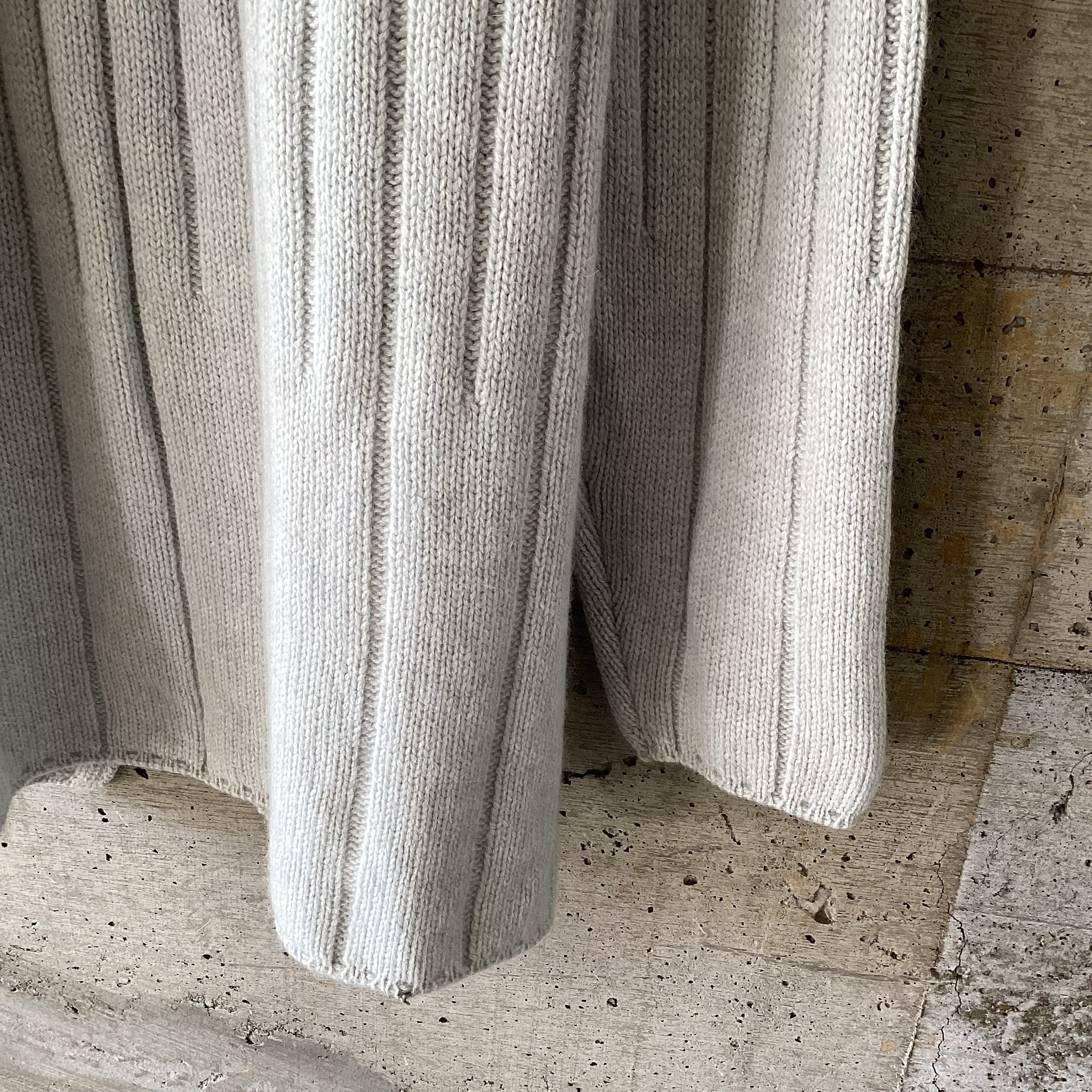 ネックから裾にかけて、リブ編みが3段階で太くなるデザインがポイントで、袖も同じ仕様になっています。