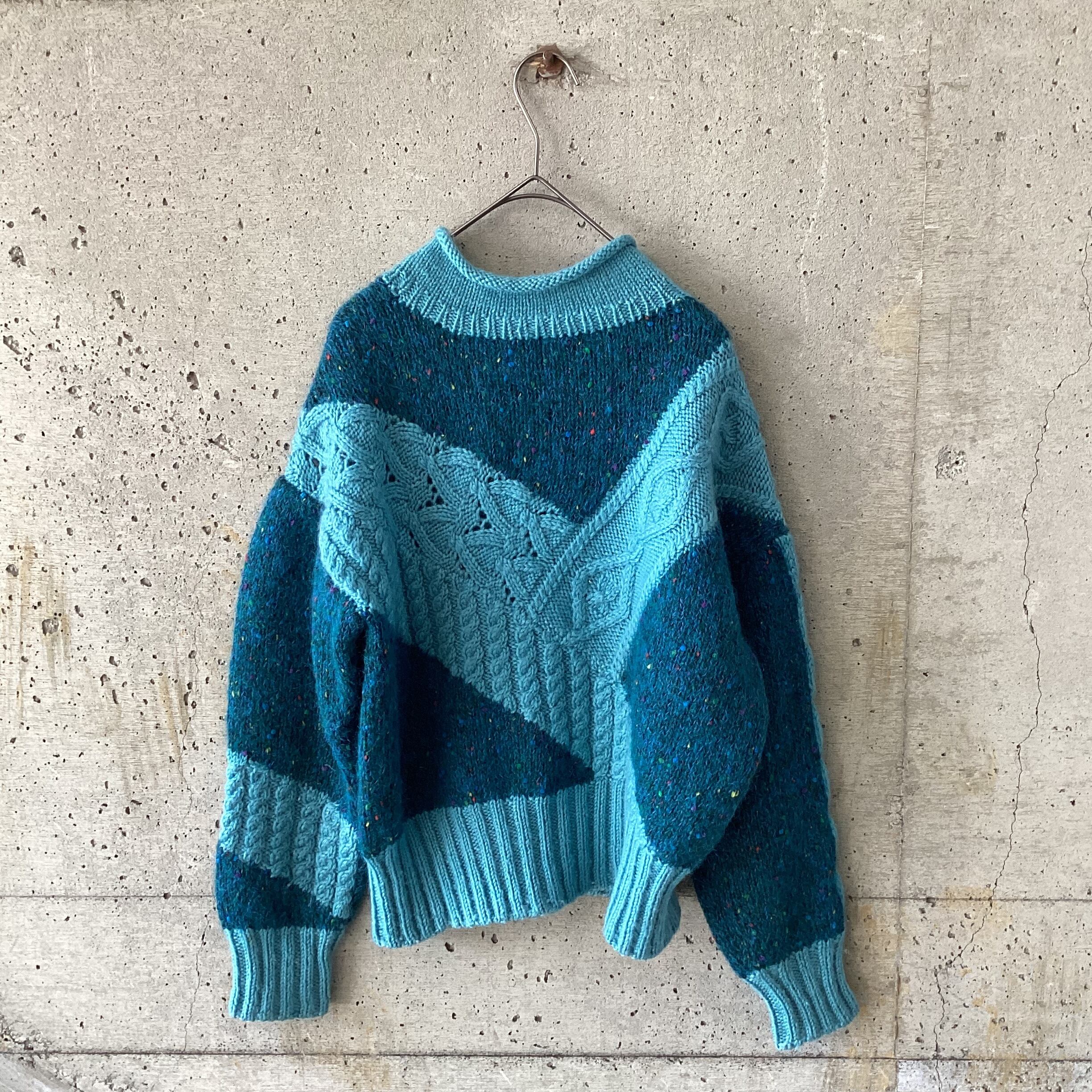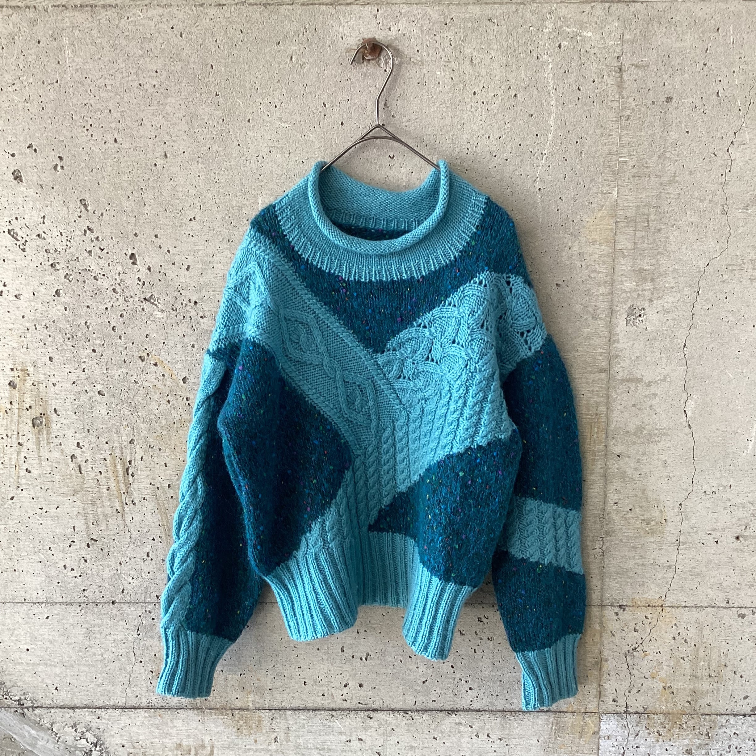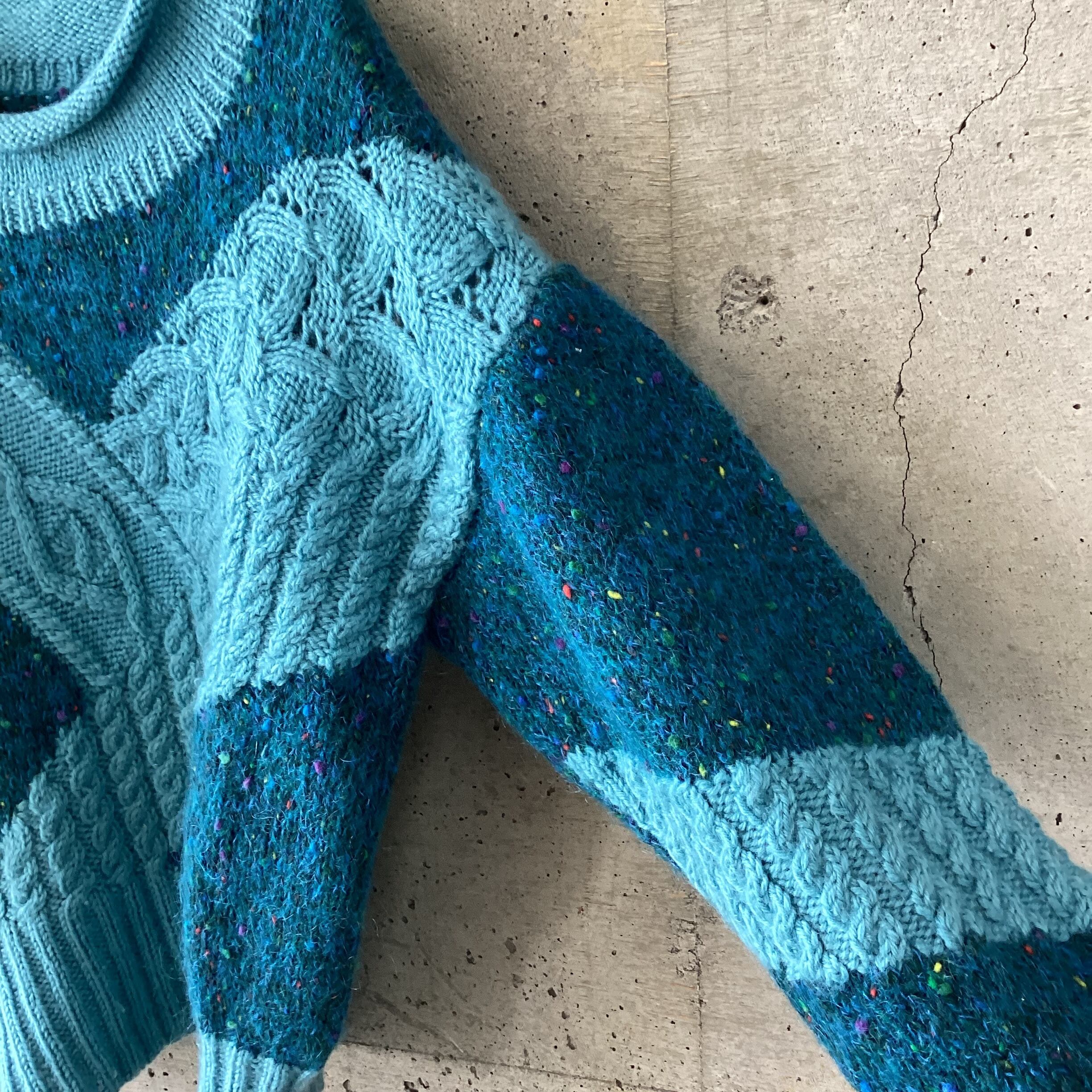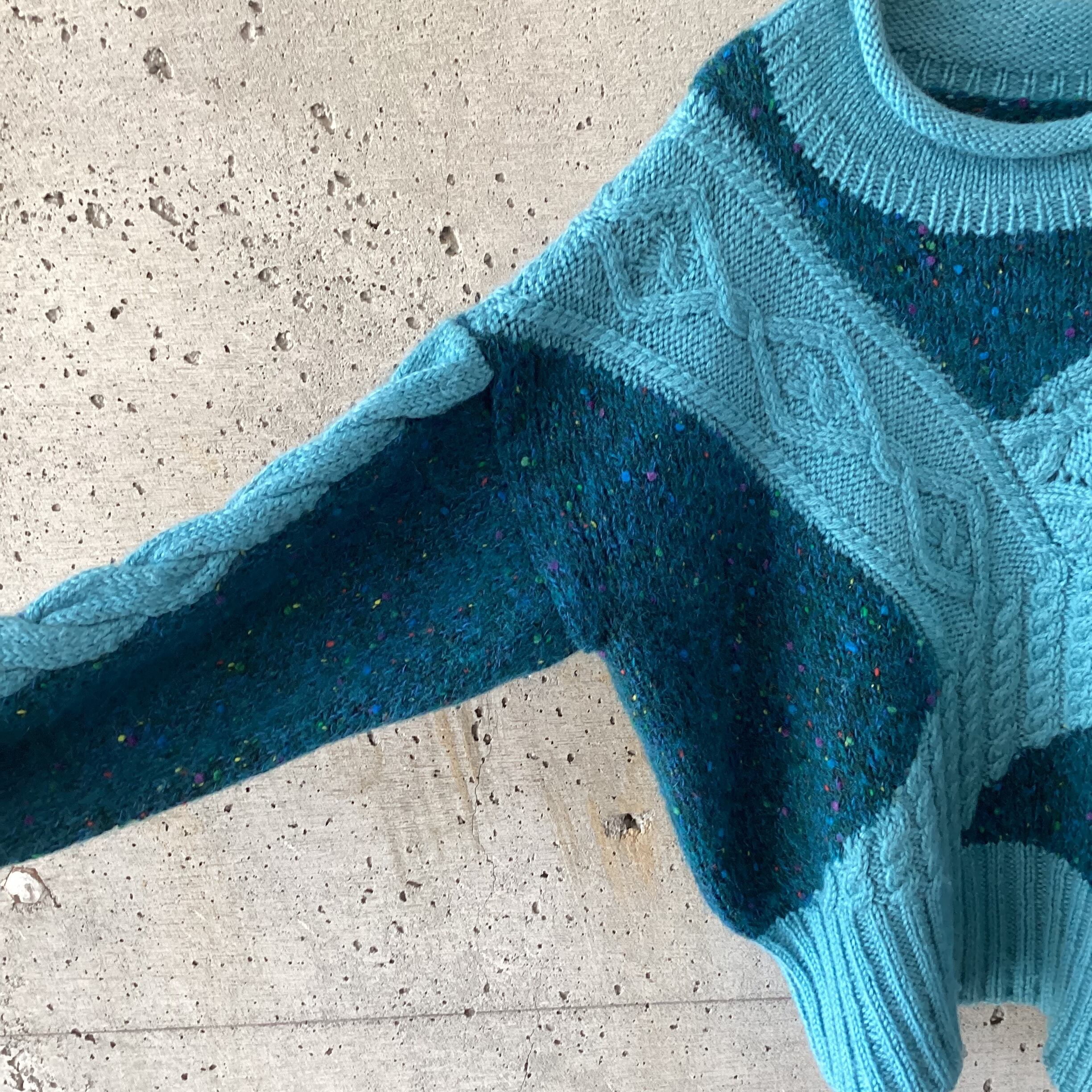 可愛らしい水色と、深めのブルーグリーンの糸がバランスよく、ボトムスを選ばずコーディネートを組むことができます。