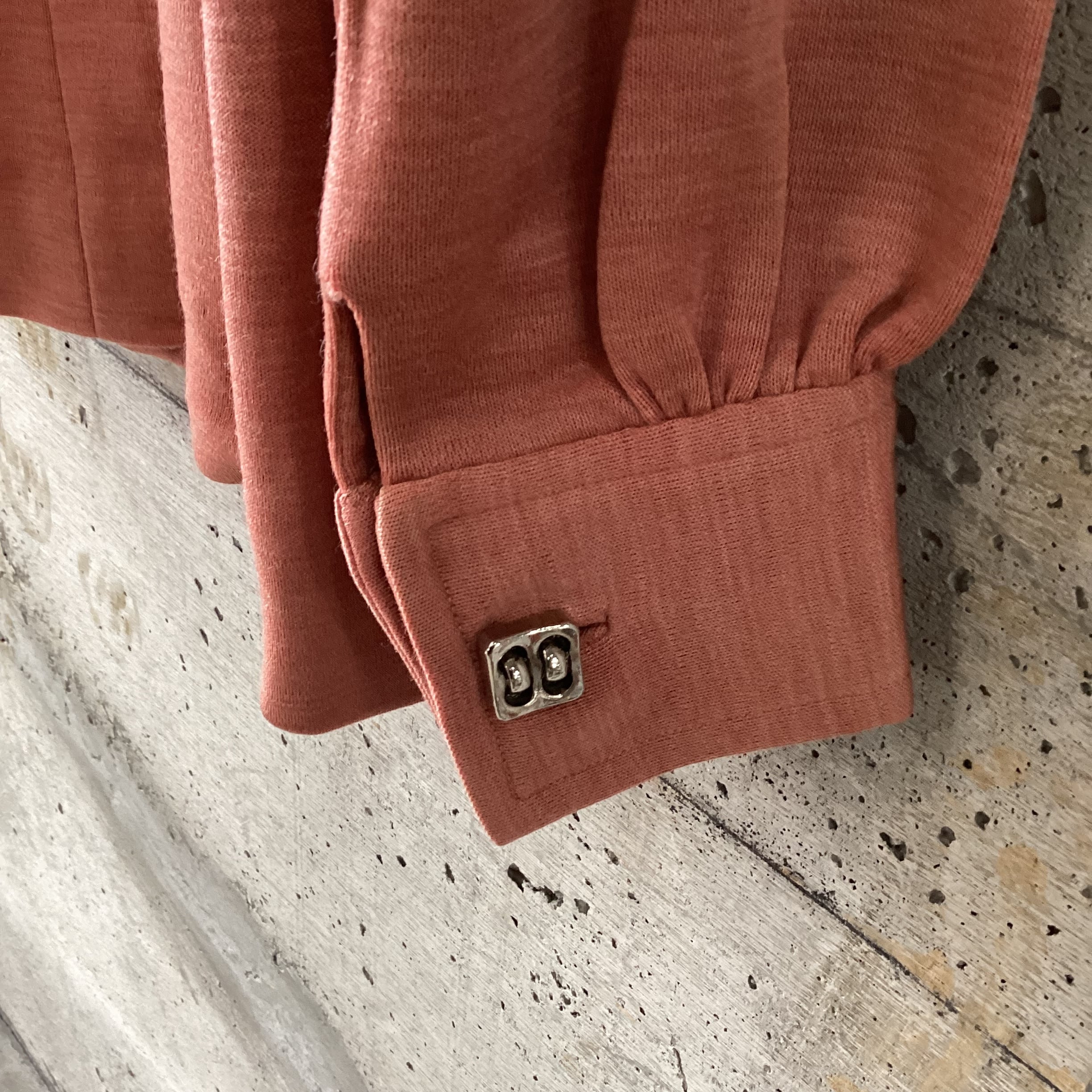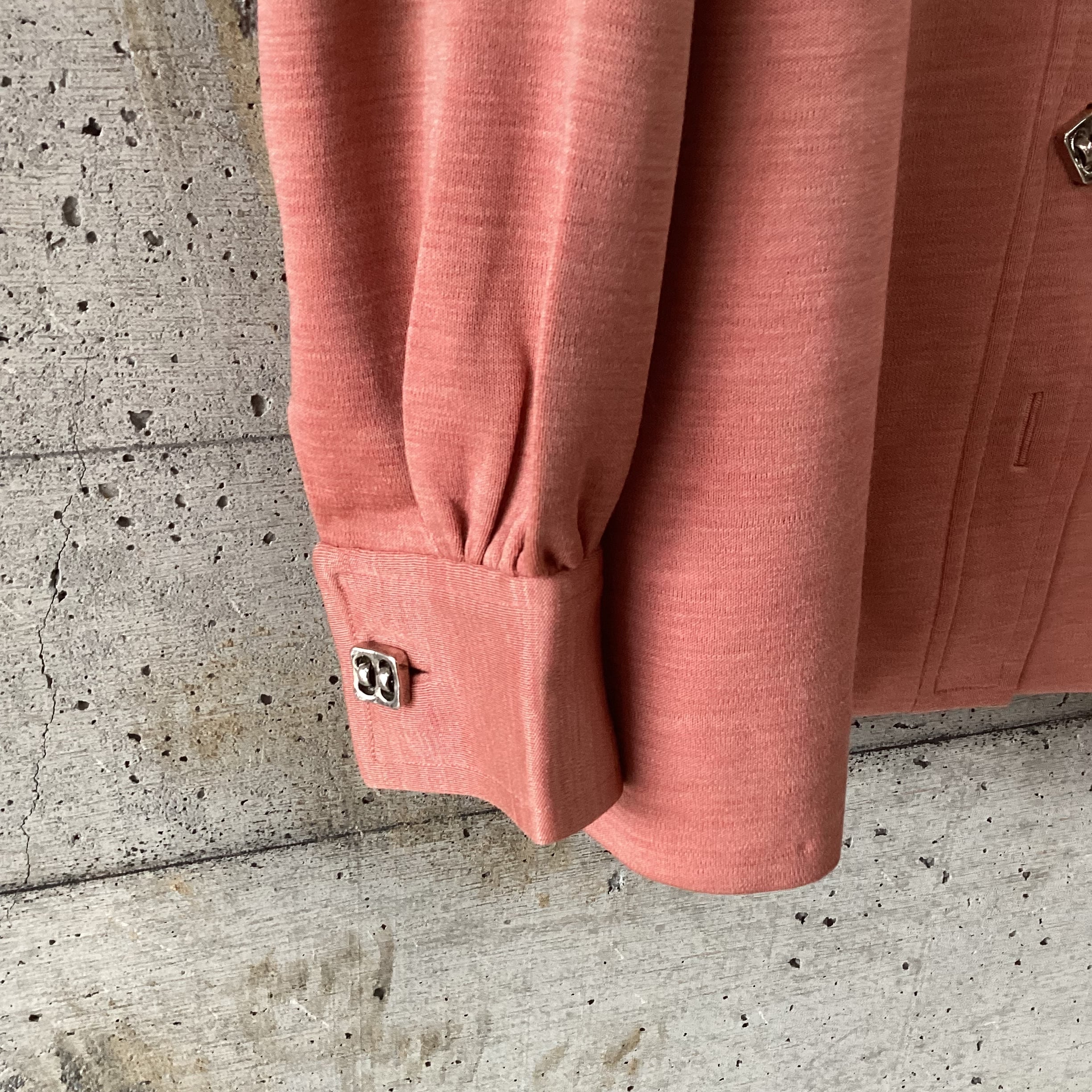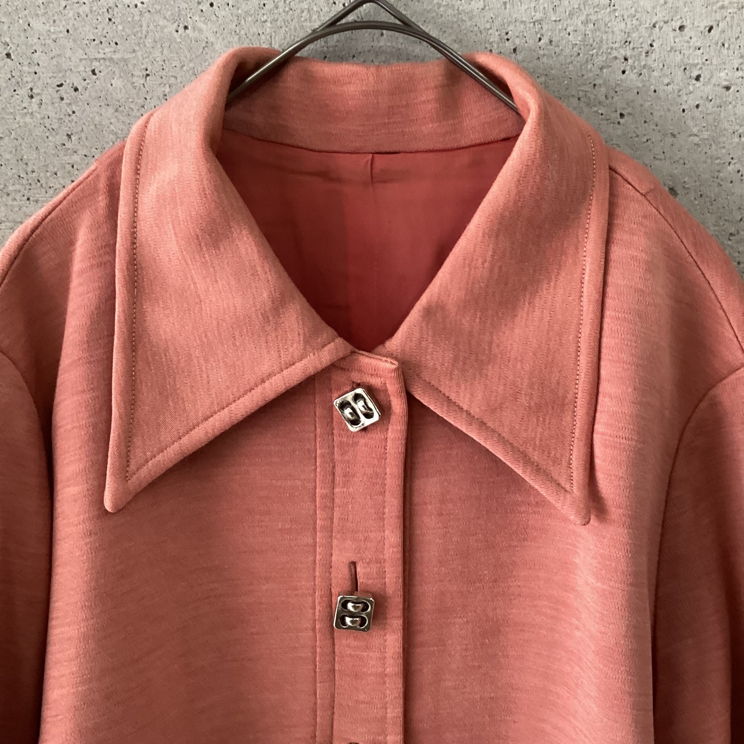 クラシカルな襟のデザインや、珍しい形のボタンが印象的で、今ではあまり見られない雰囲気のある一着です。
