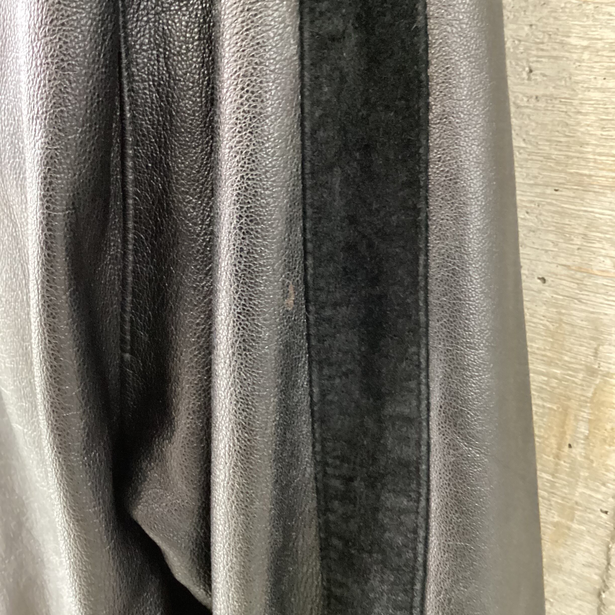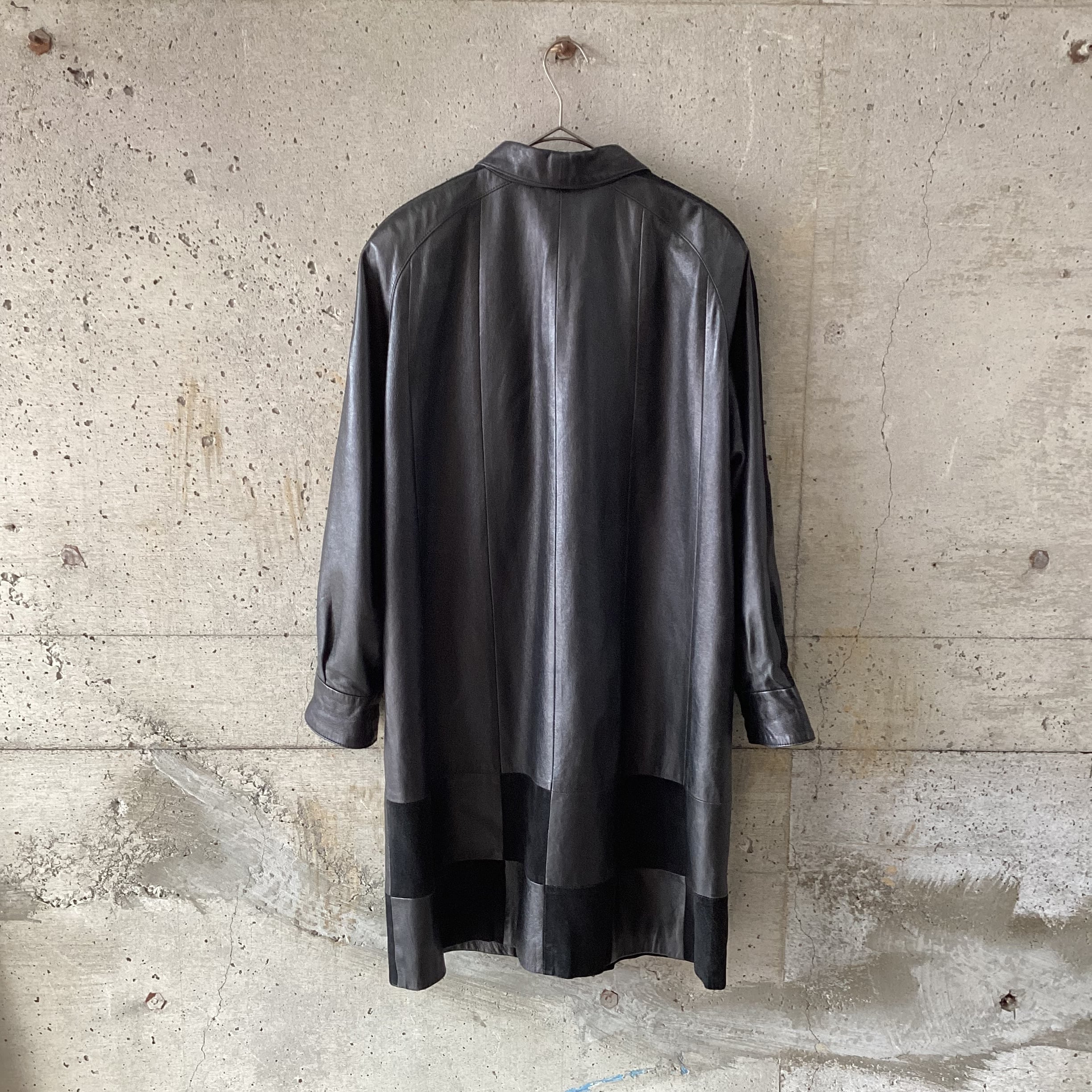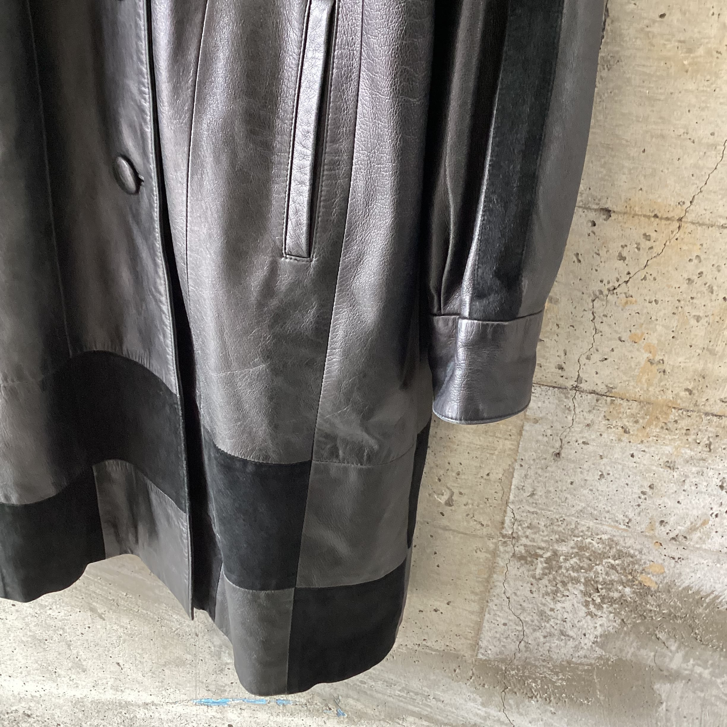光沢レザーとスエードを組み合わせ、市松模様で切り替えた裾のデザインが目を惹くレザーコートです。