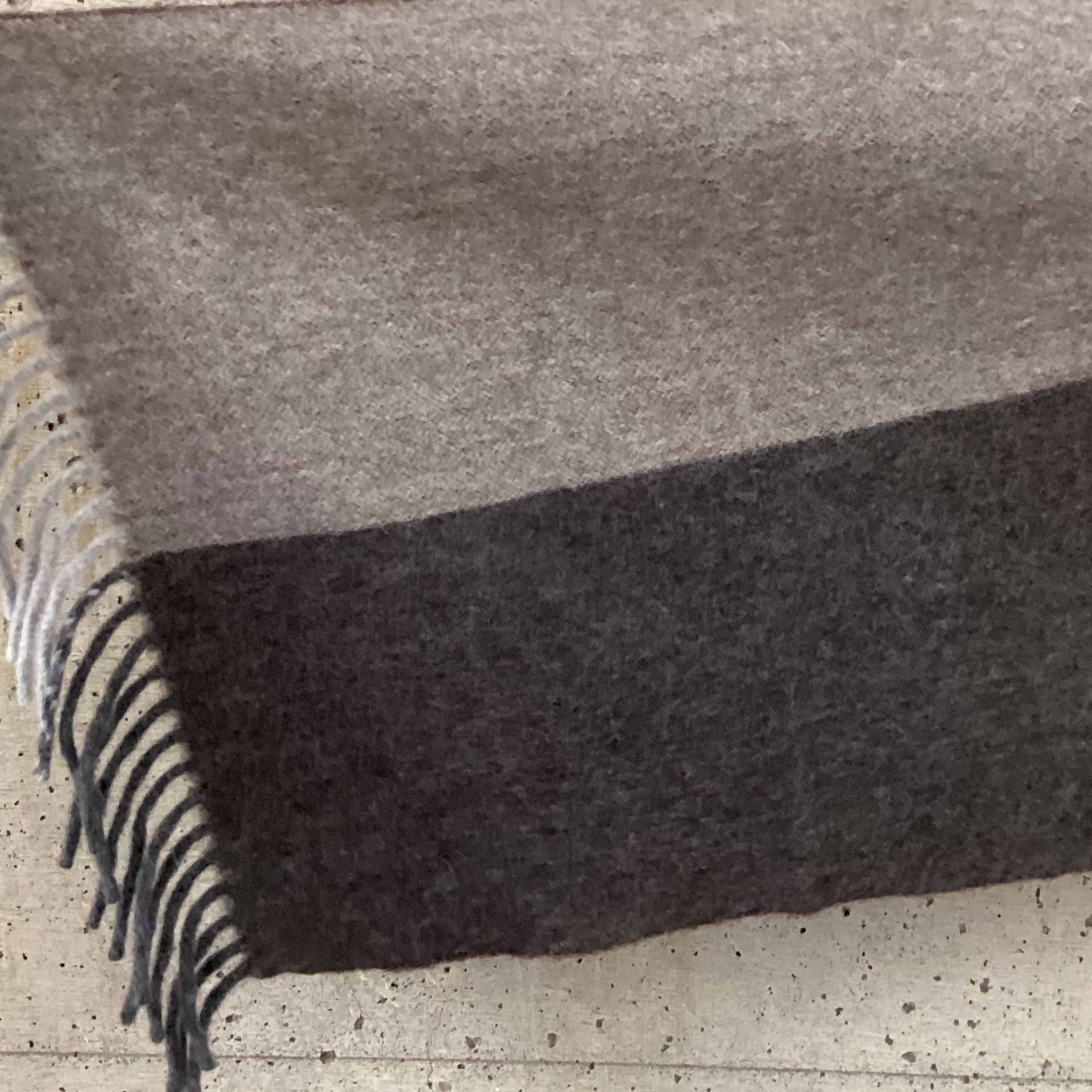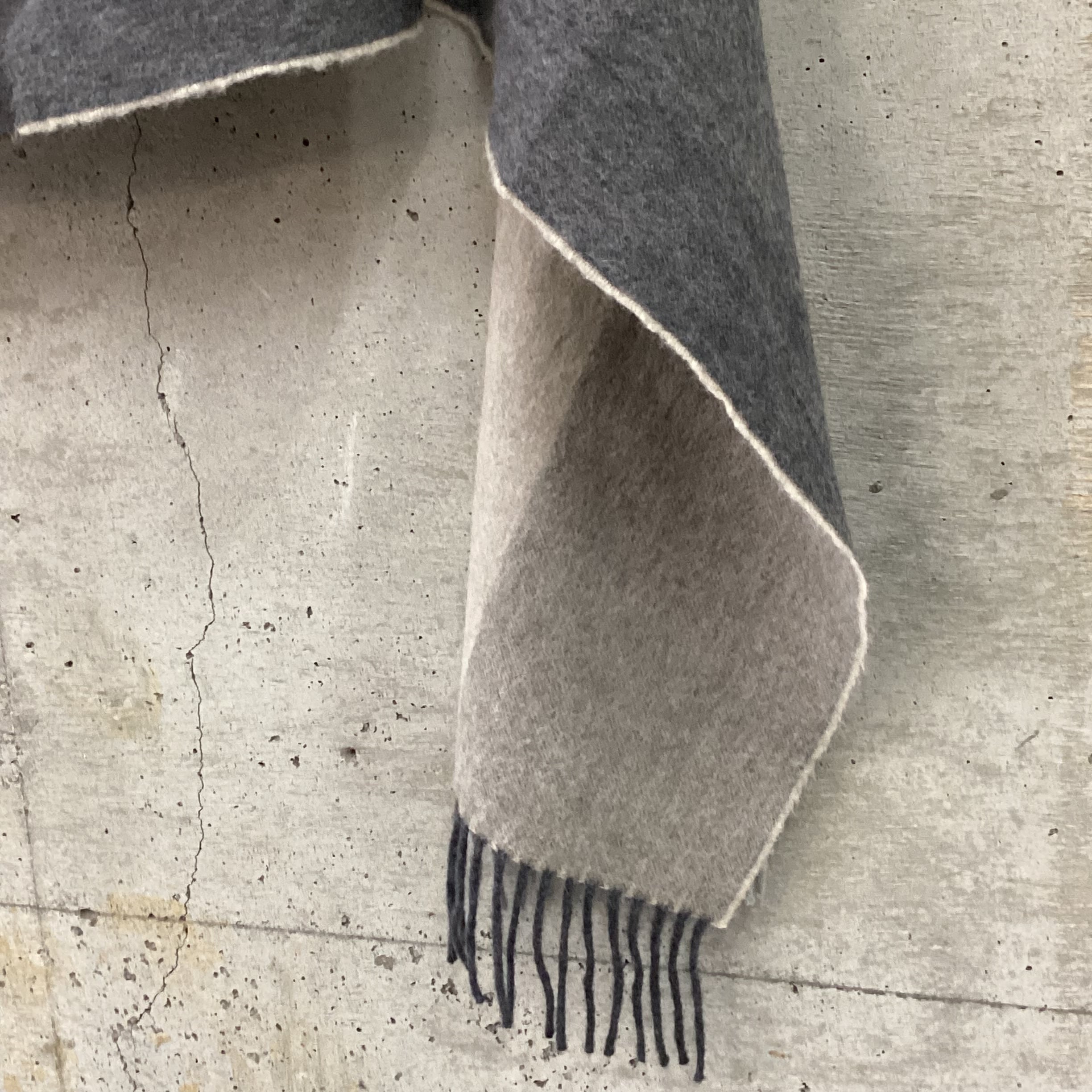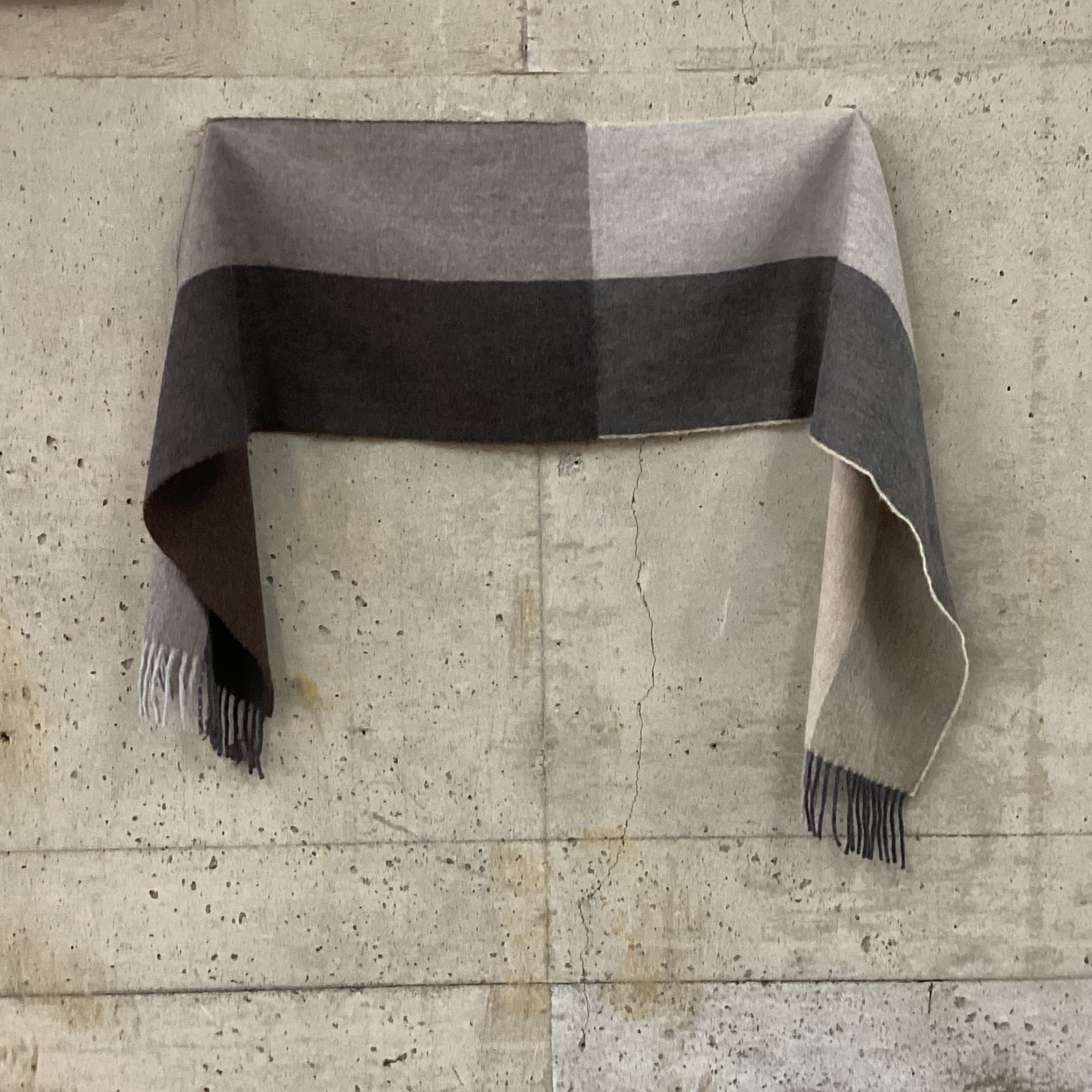 こちらのマフラーは4分割されたデザインで、4つのセクションそれぞれの色が異なり、裏面も別の色になっています。落ち着いたトーンの色の組み合わせの楽しさがポイントです。