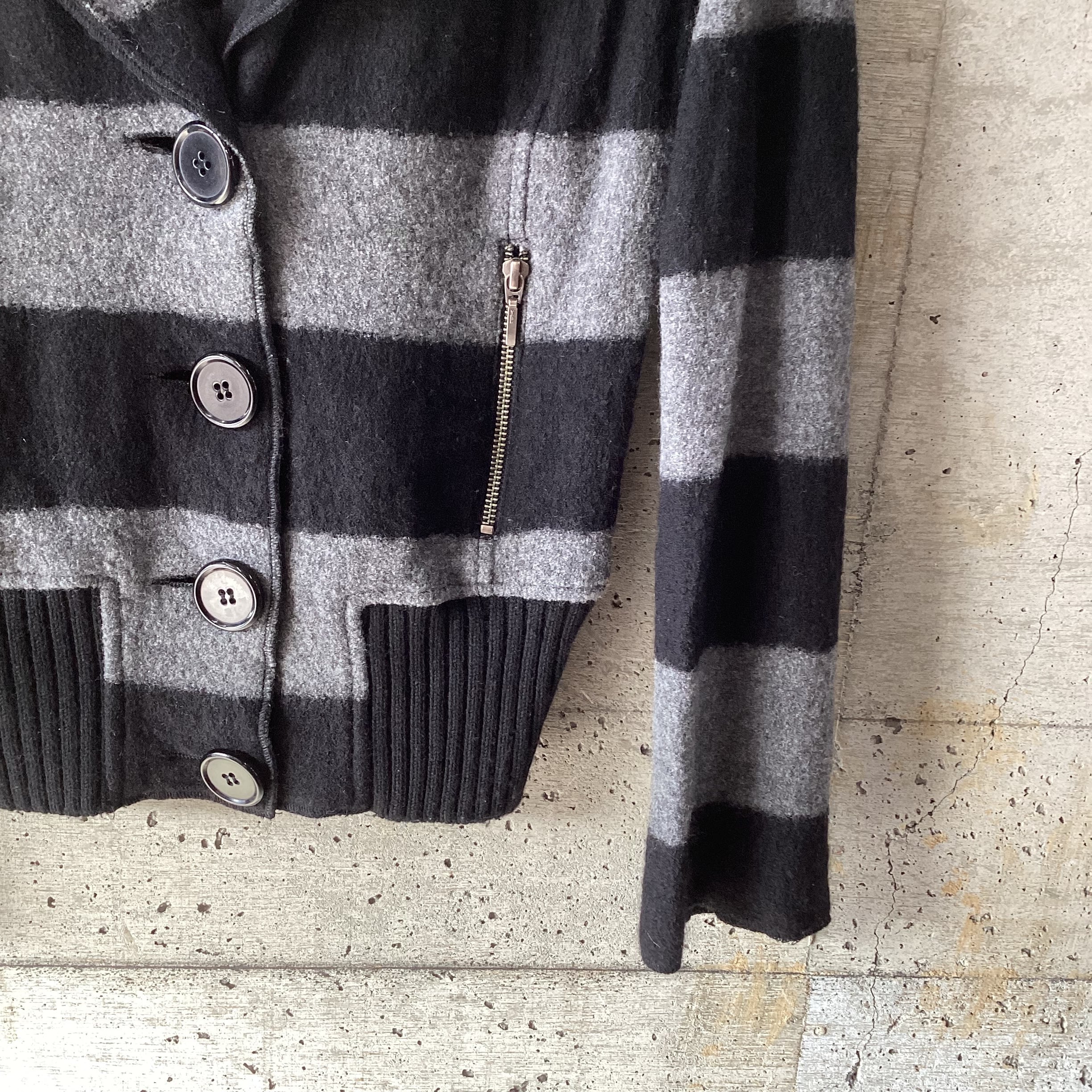 太いボーダーだとカジュアル感の強い印象を受けますが、色味とデザイン性からモードな印象を受けます。