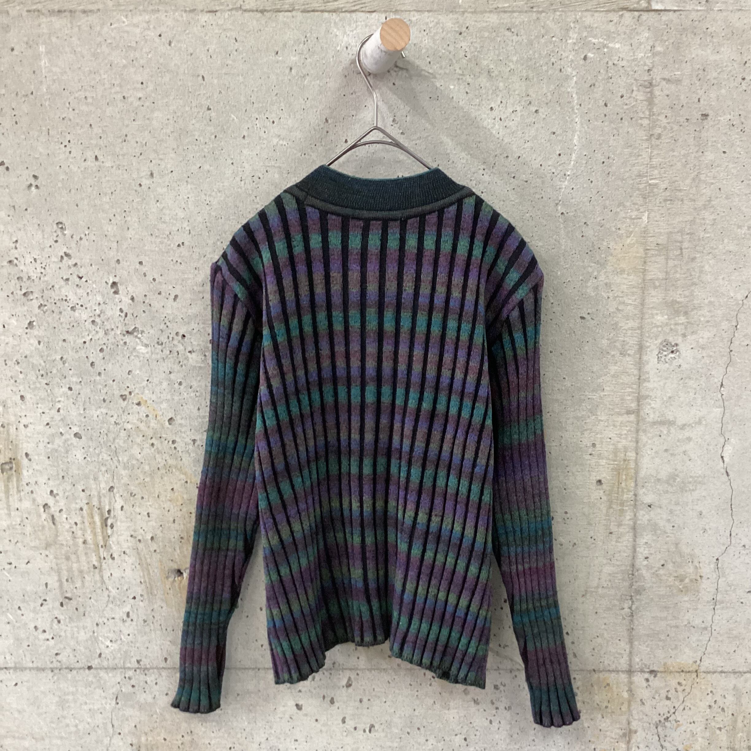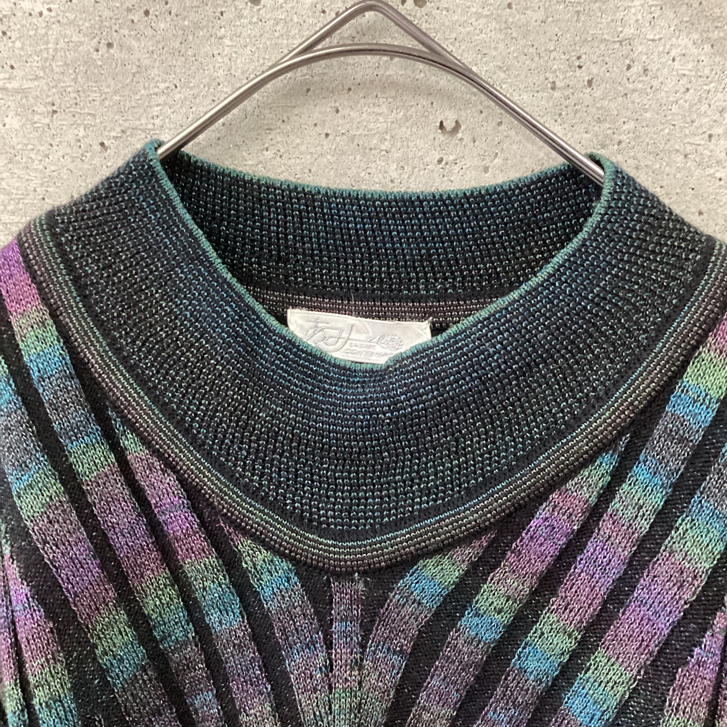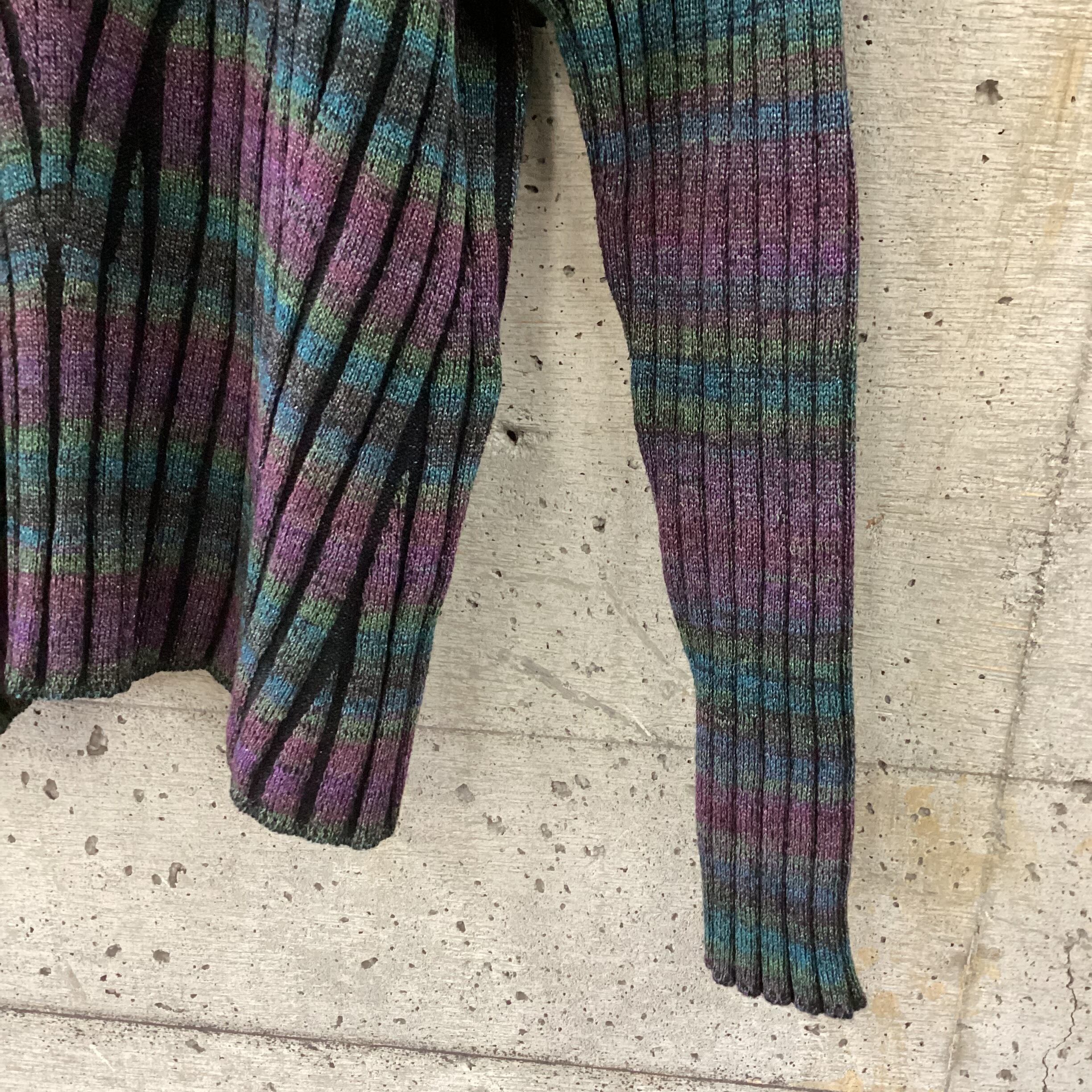 ダークトーンのレインボーのような配色が珍しいニットです。