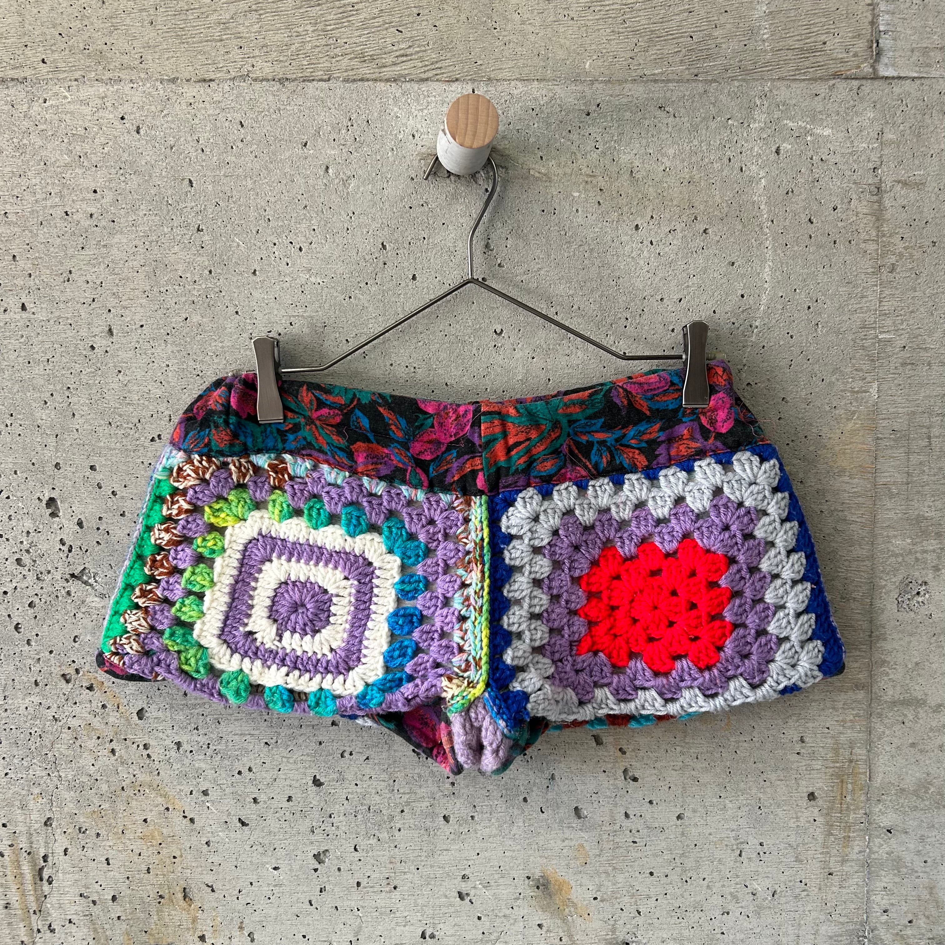 カラフルに編まれた毛糸は配色がとても良く、パワフルなイメージを与えてくれます。とても短い丈で中にカラータイツや細めのパンツと合わせることでコーディネートが華やかになります。