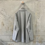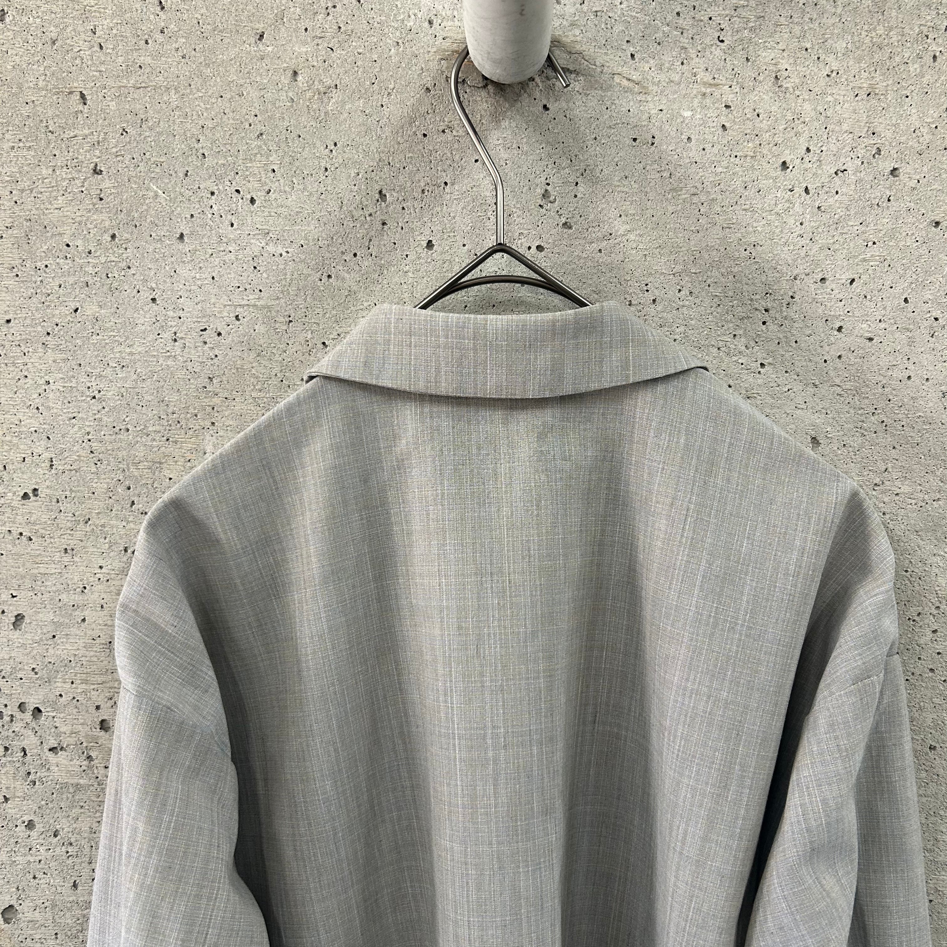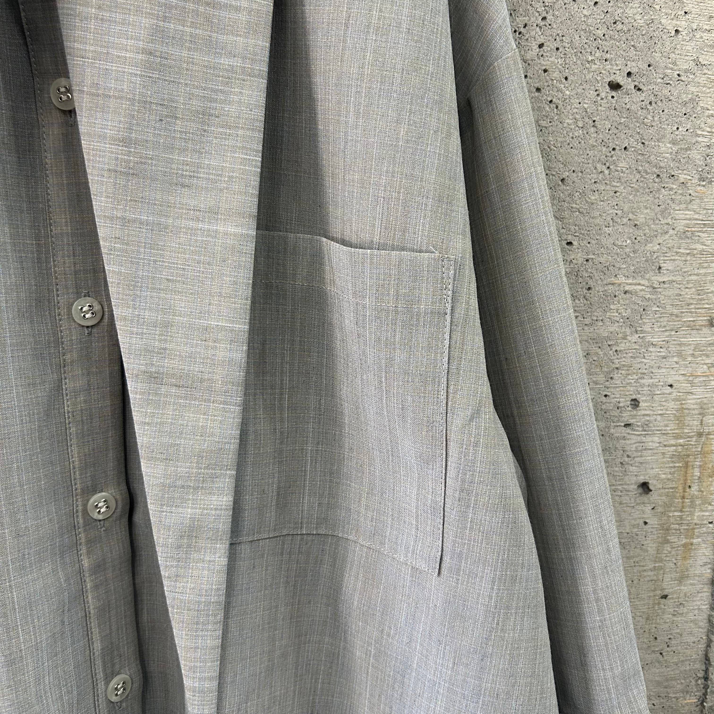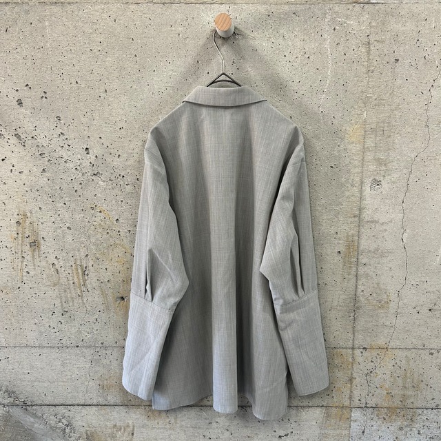 とても長い襟が特徴的なグレーの薄手シャツです。