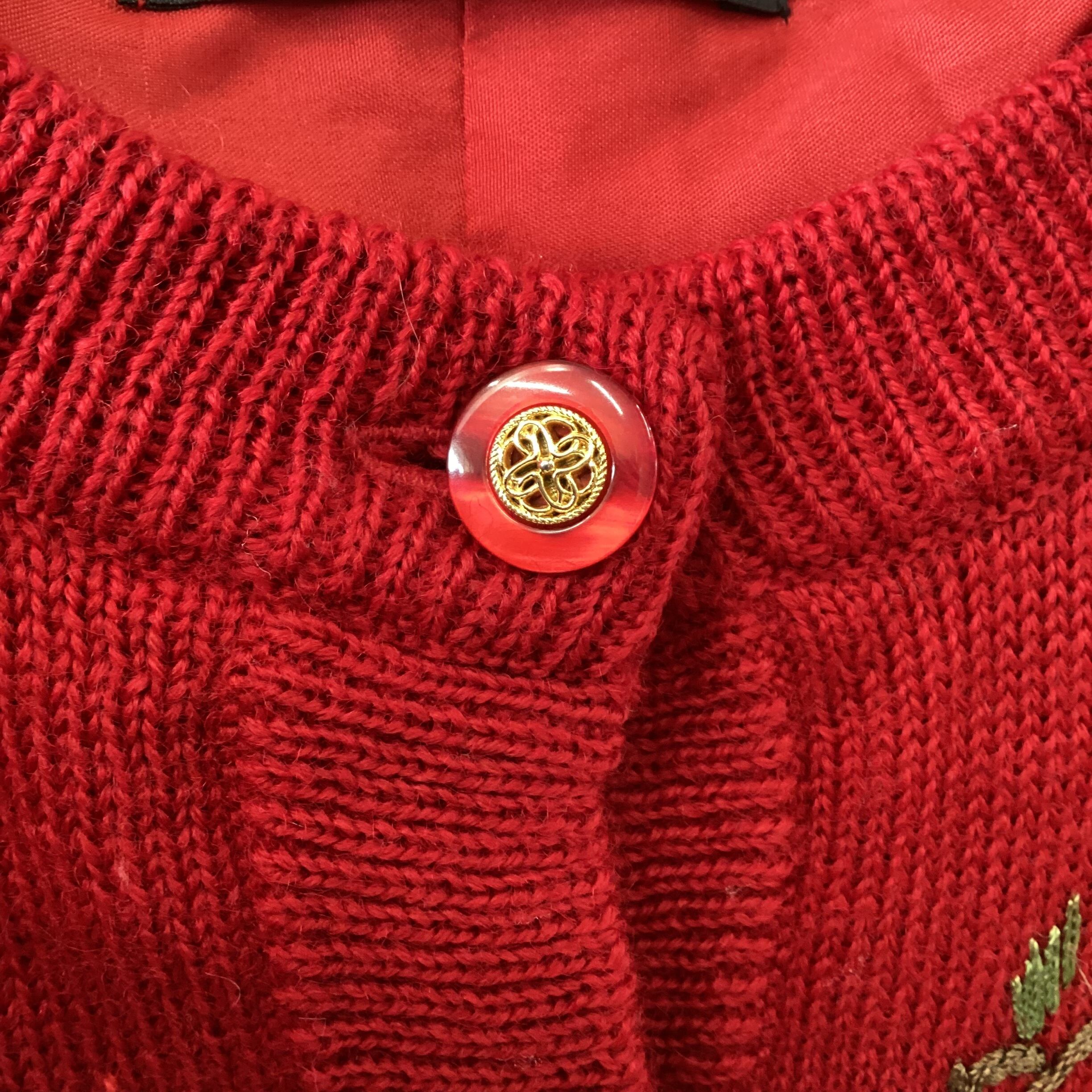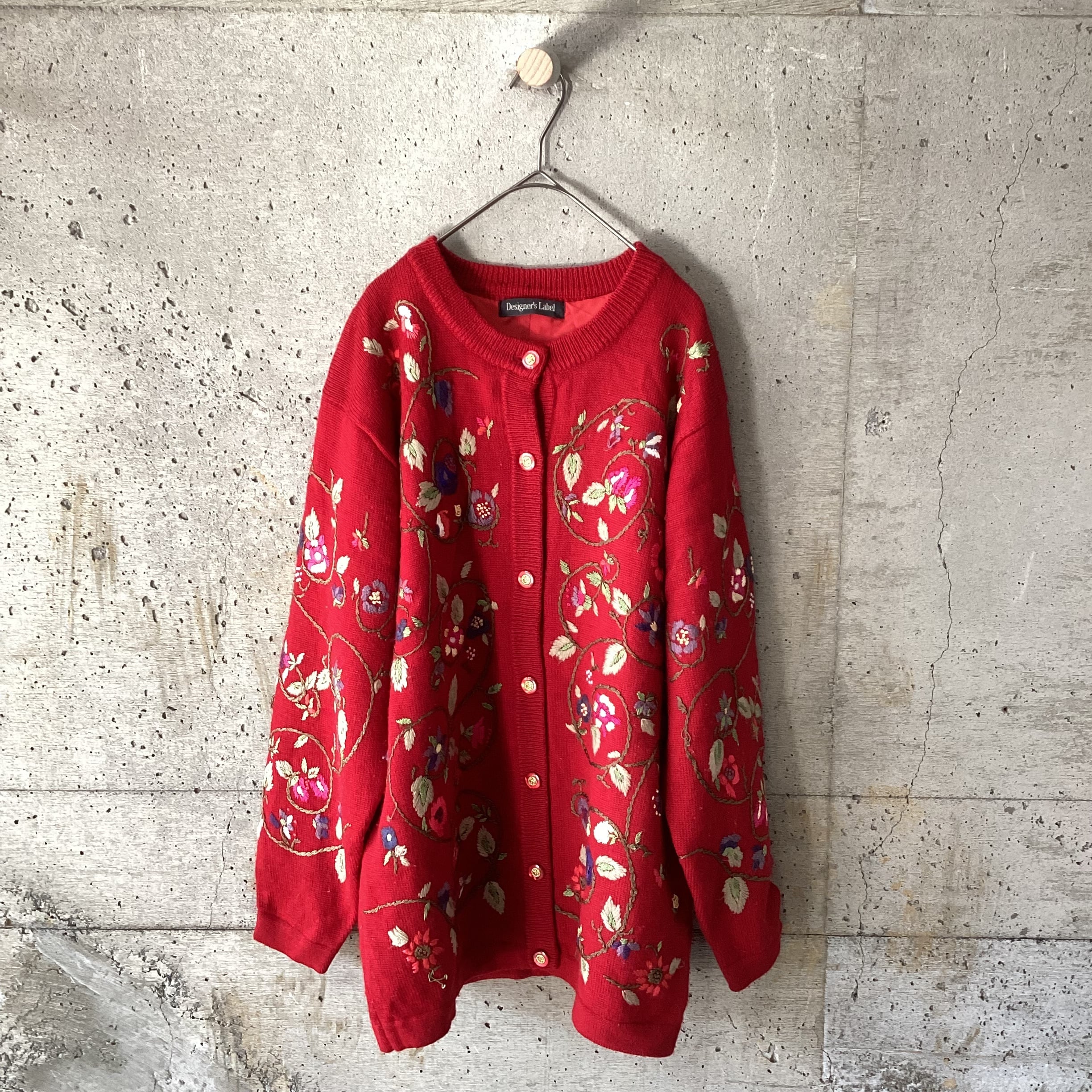 全体的に刺繍が施された綺麗な赤色のニットカーディガンです。