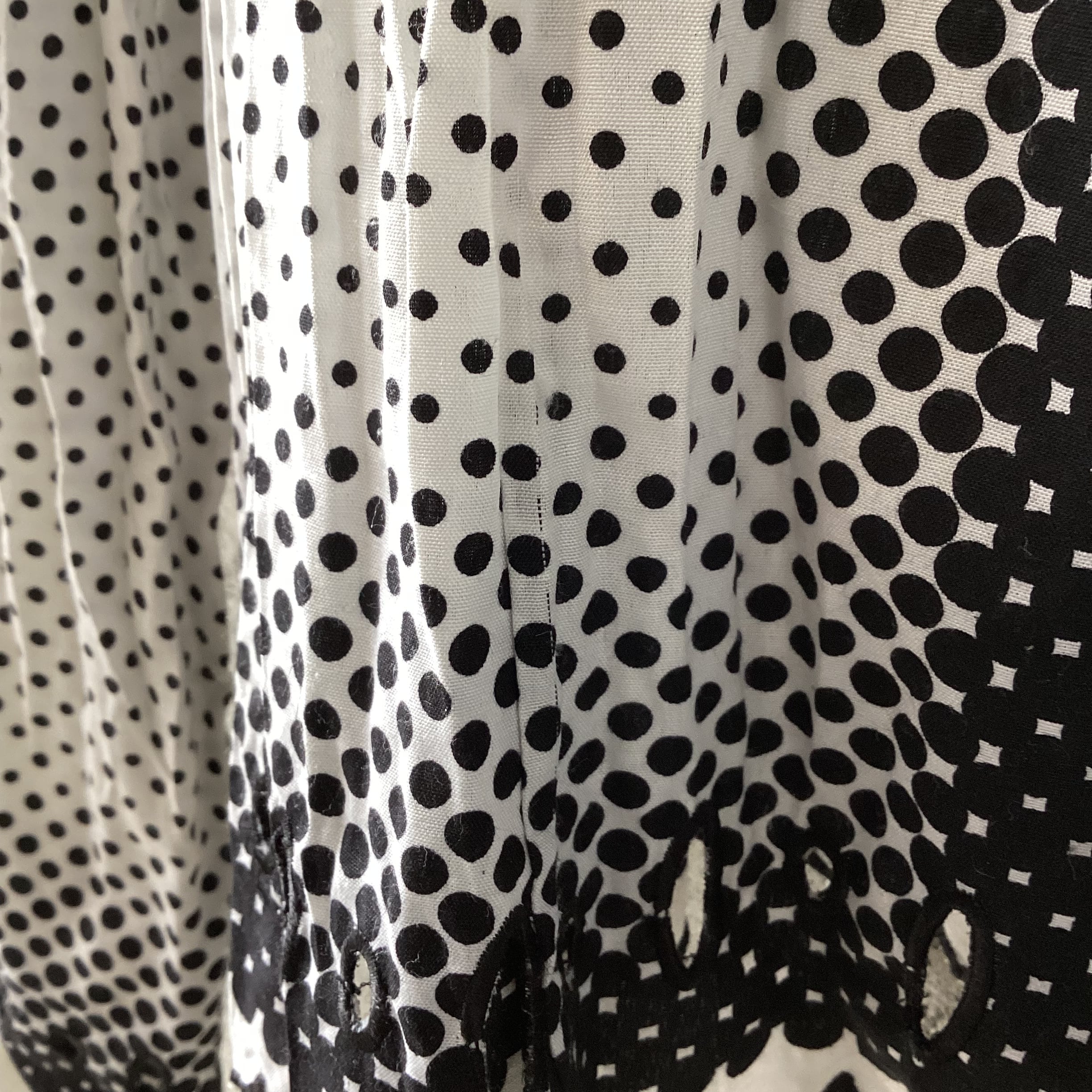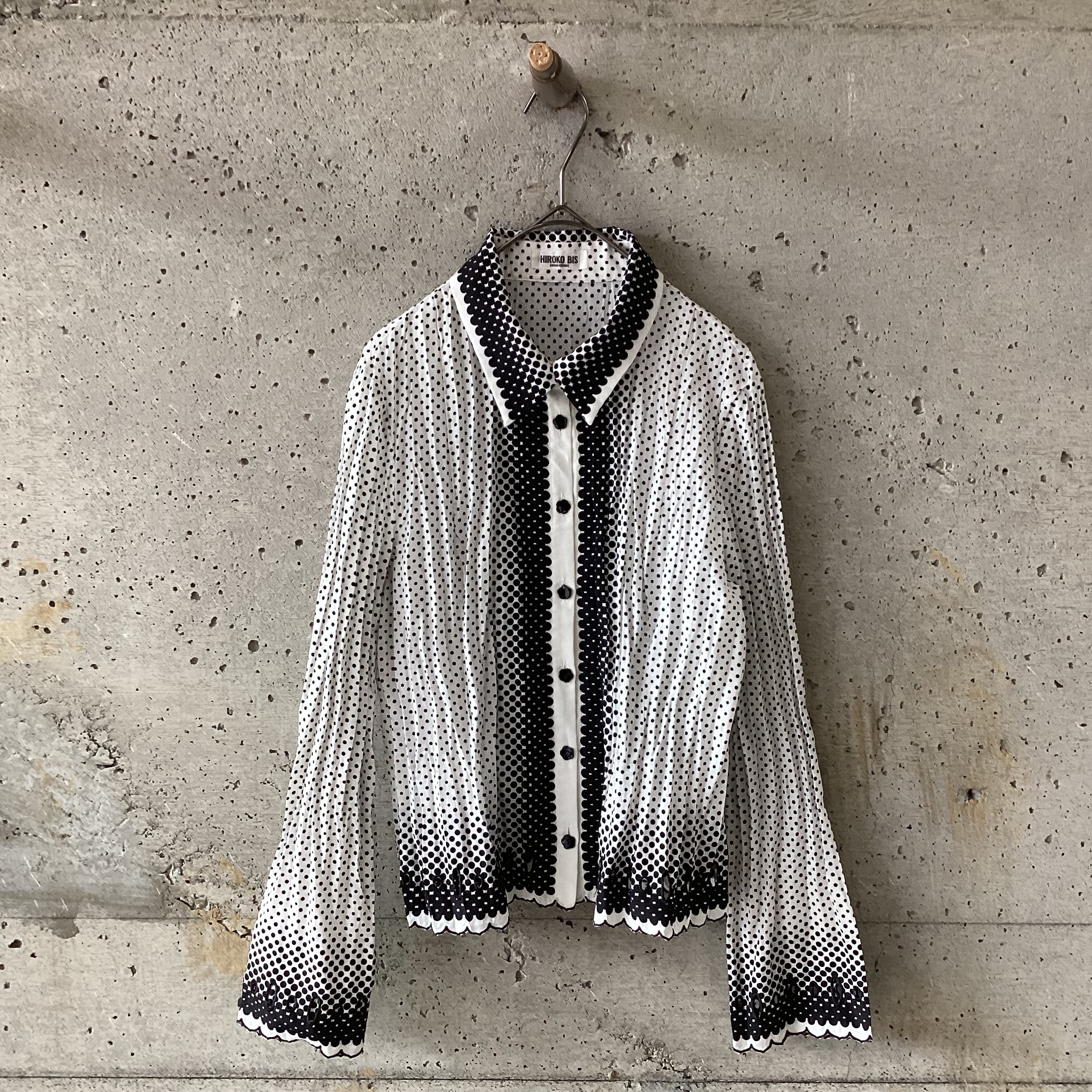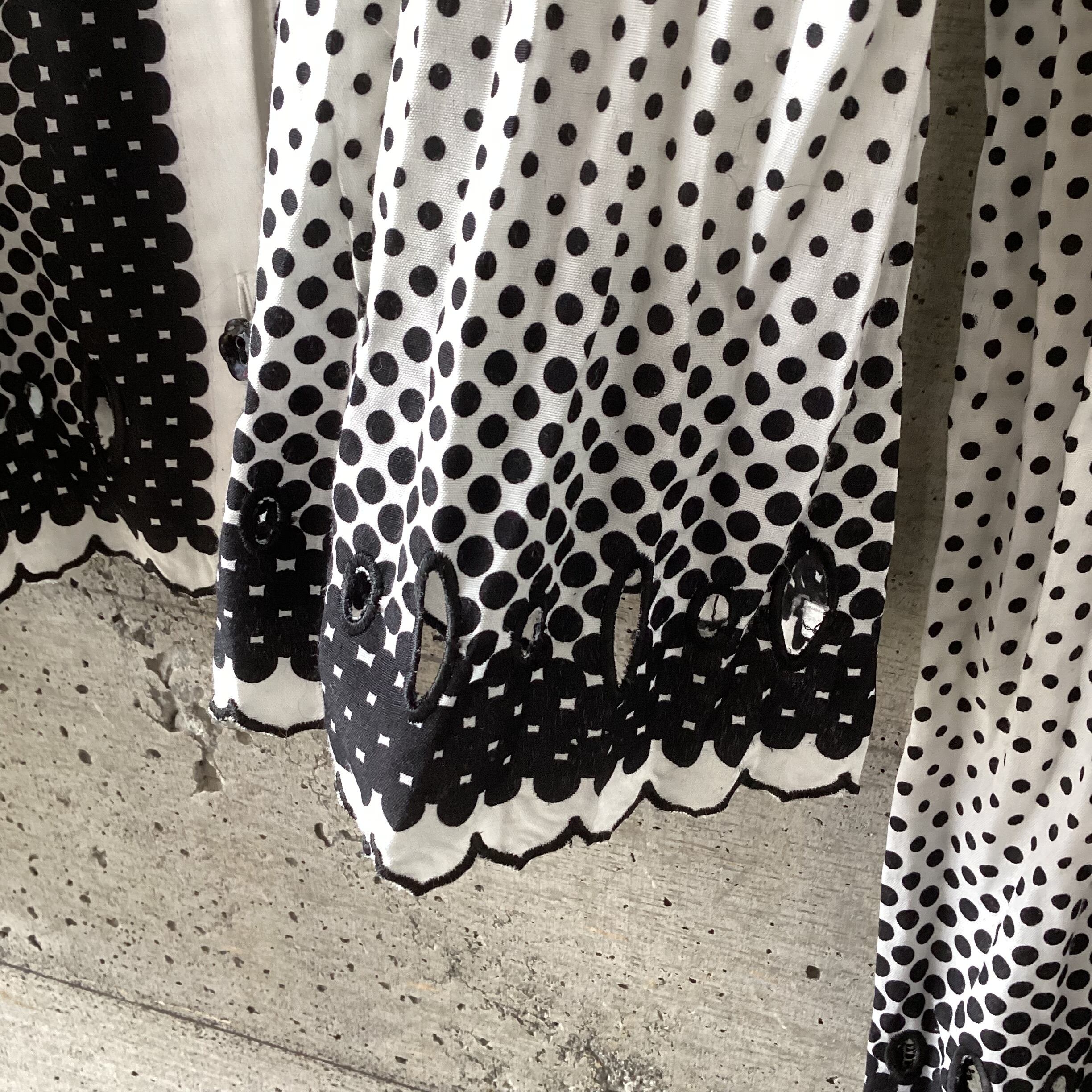 シワ加工や強弱のあるドット柄、可愛らしいお花のボタン、裾や袖先のカットワークなど、細部まで見どころたっぷりの素敵なシャツです。