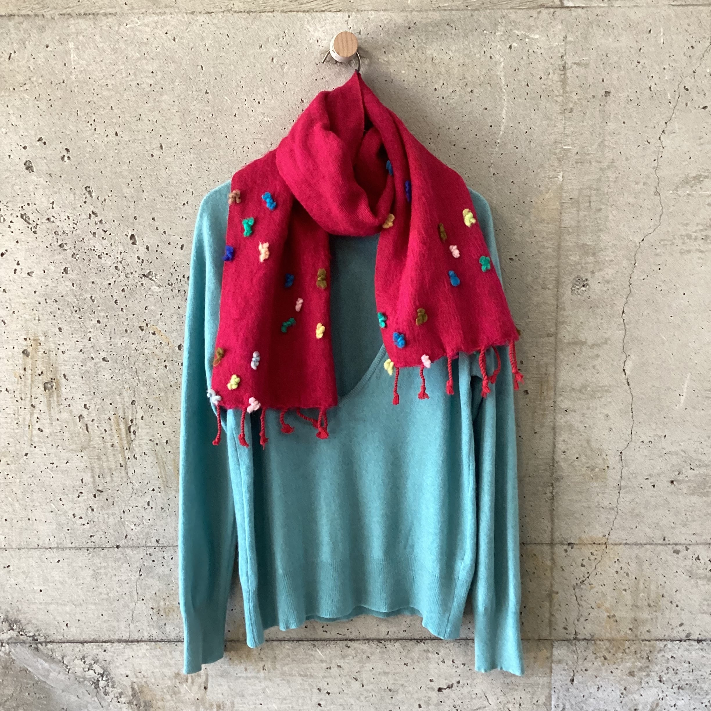 このマフラーを巻くだけで首元が華やかな色味になり、コーディネートもパッと明るくなるおすすめの一点です。