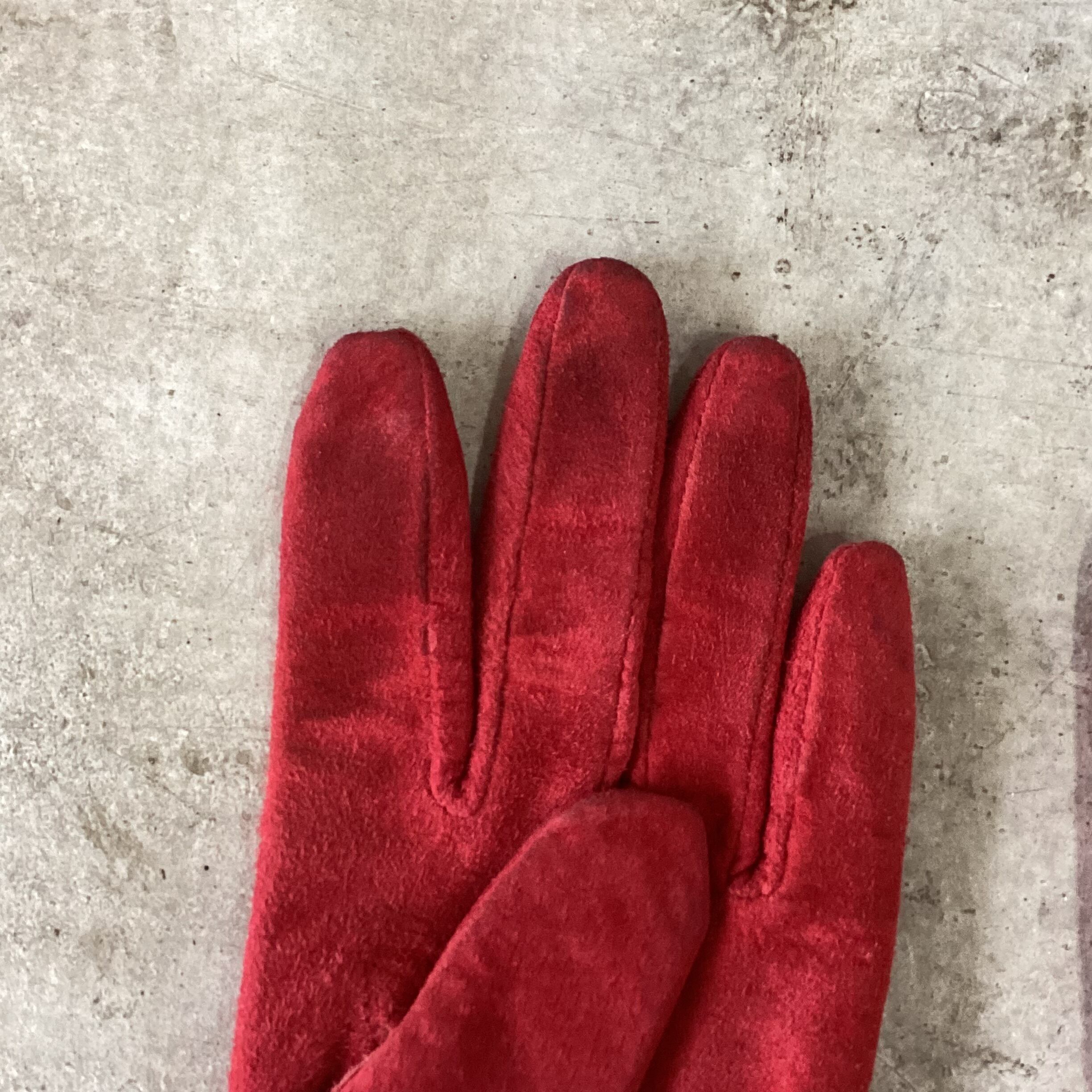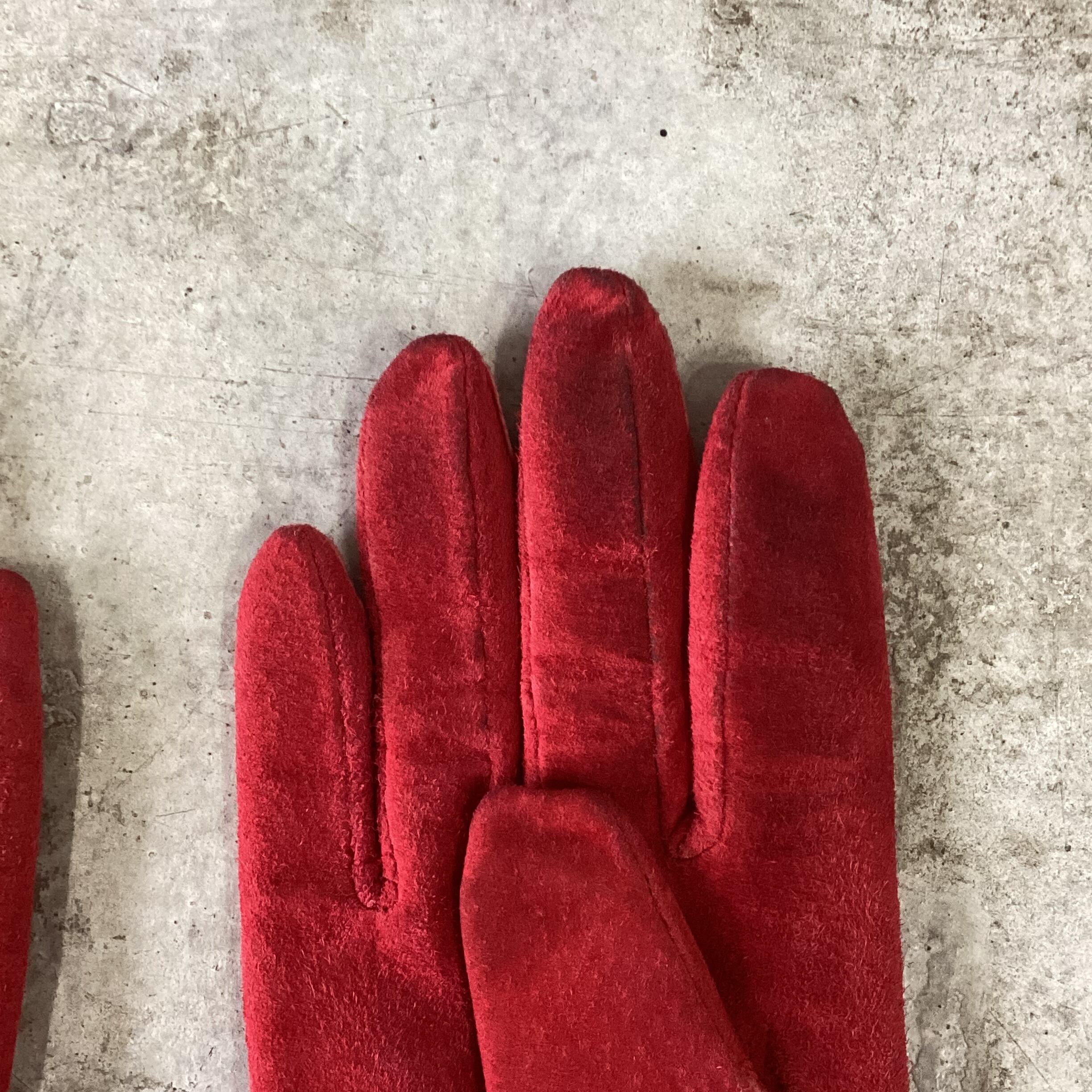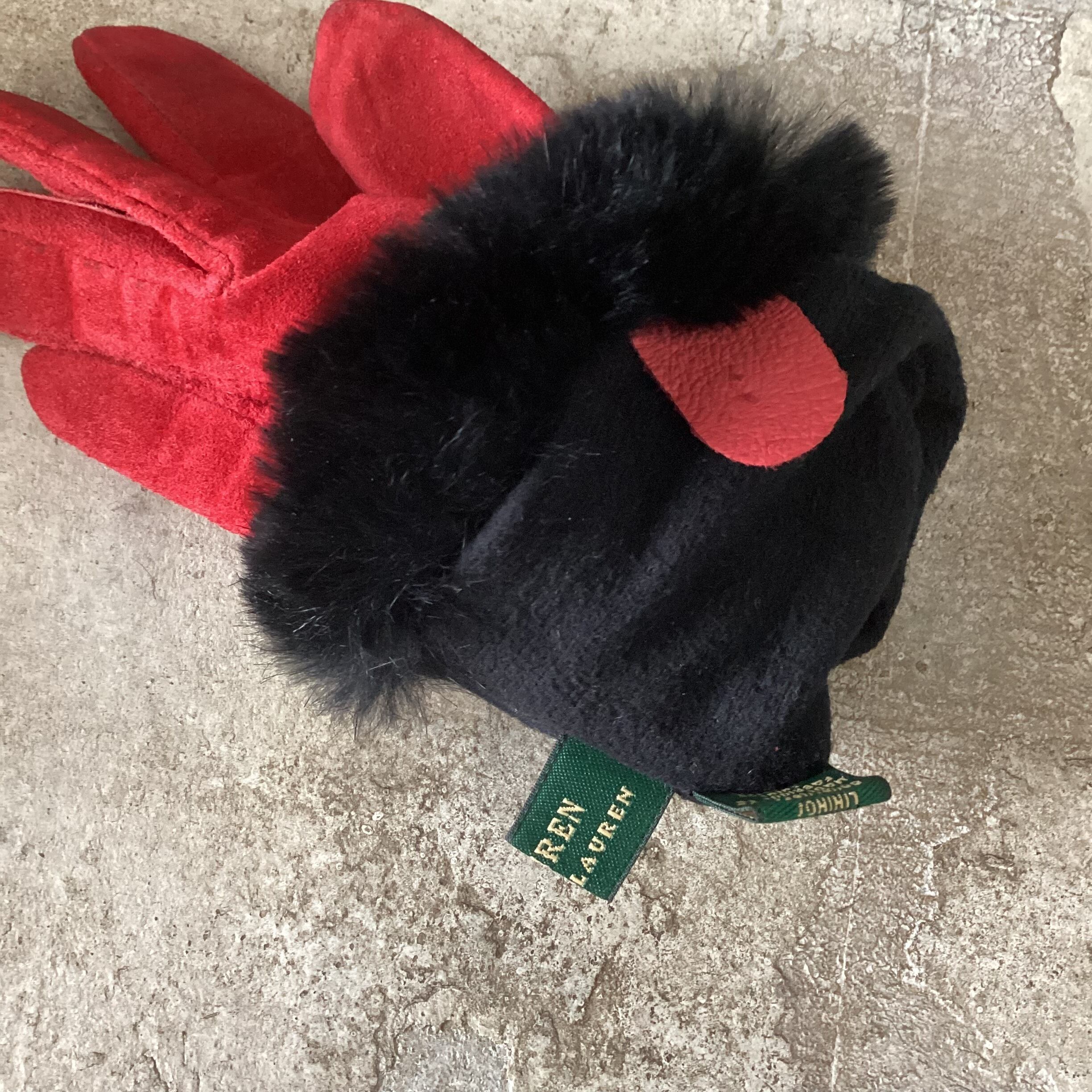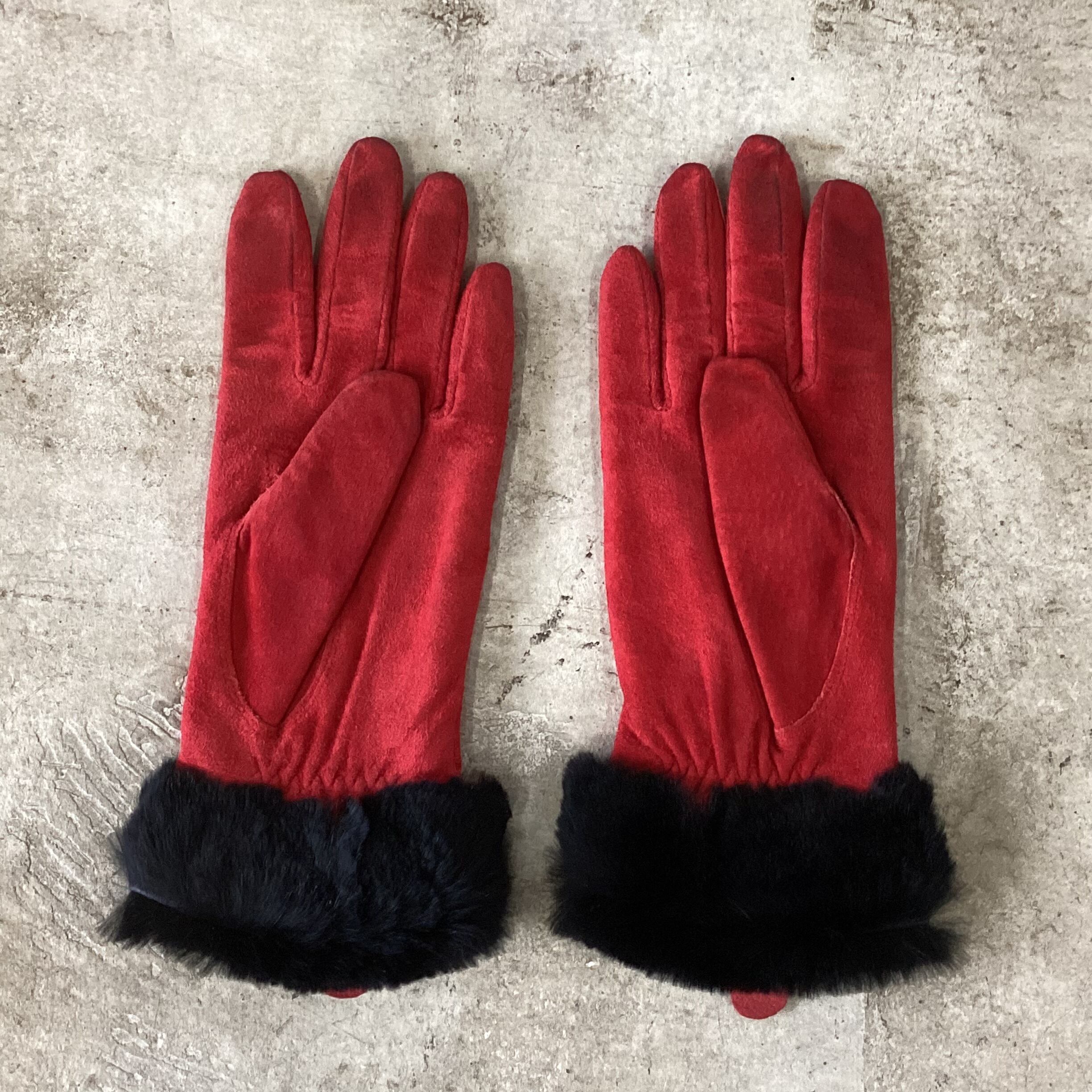 Red suede leather and black real fur gloves