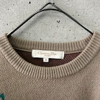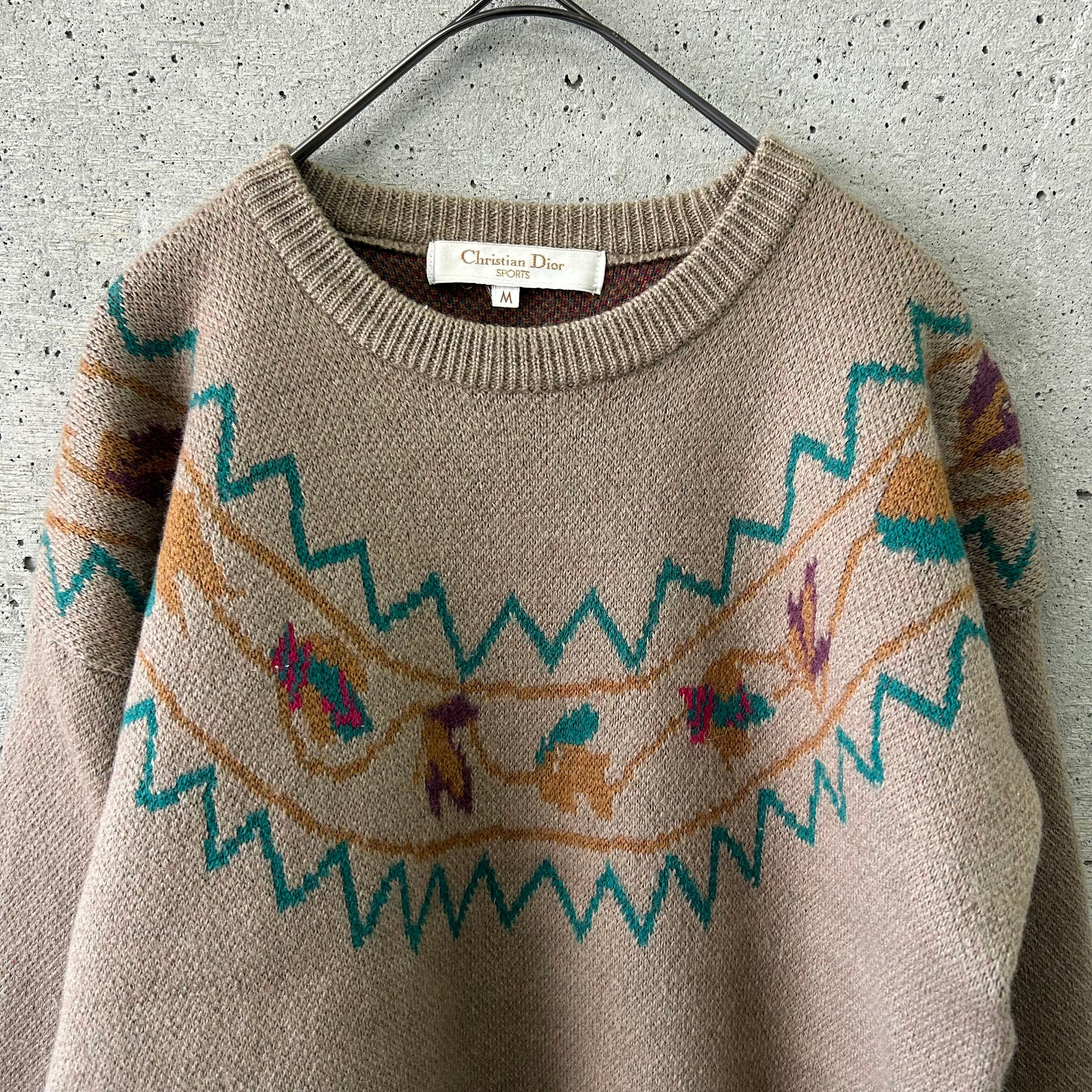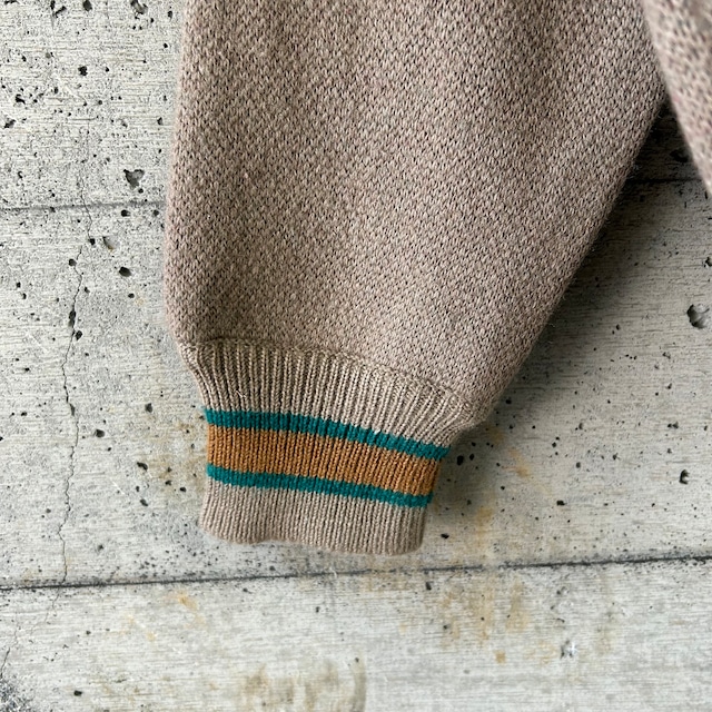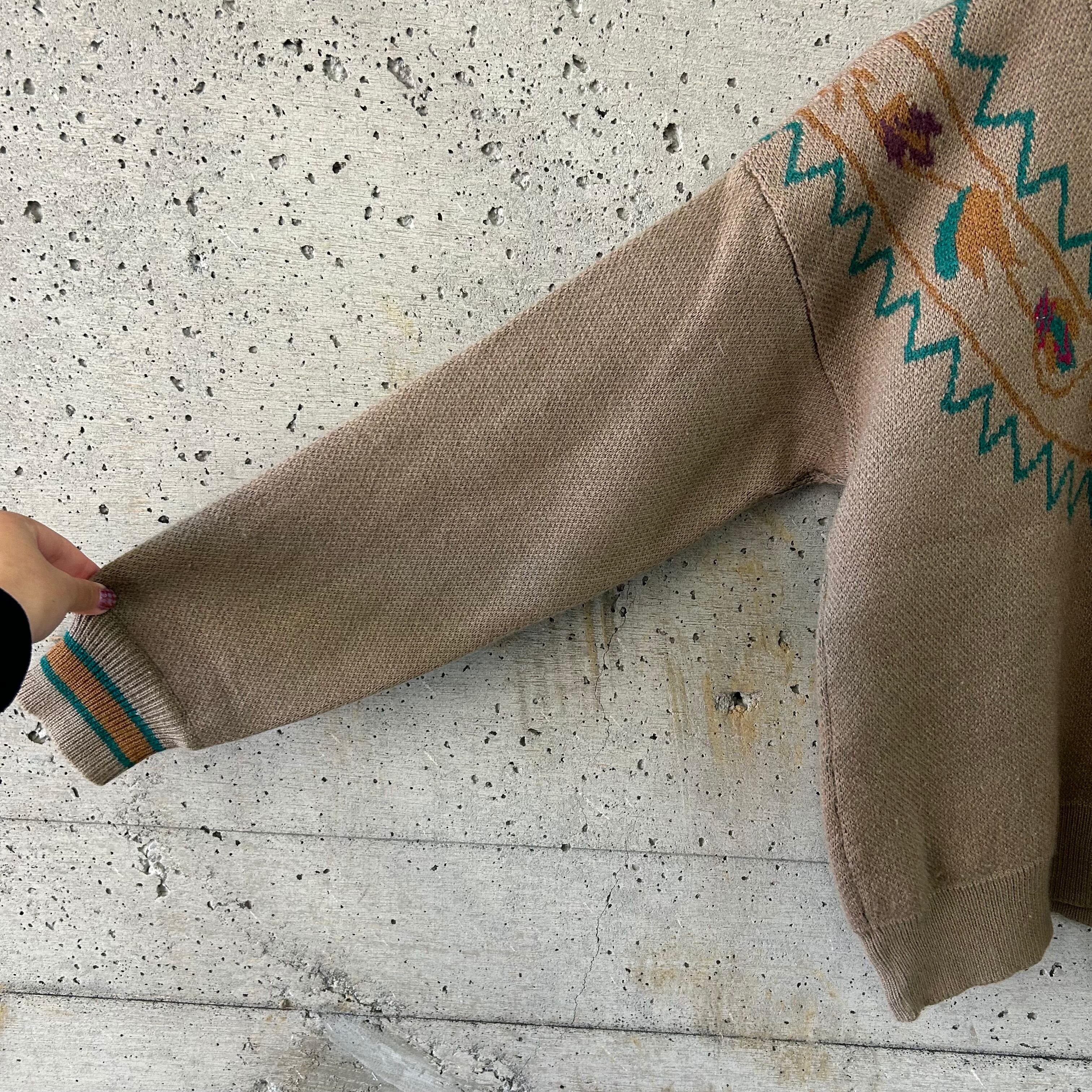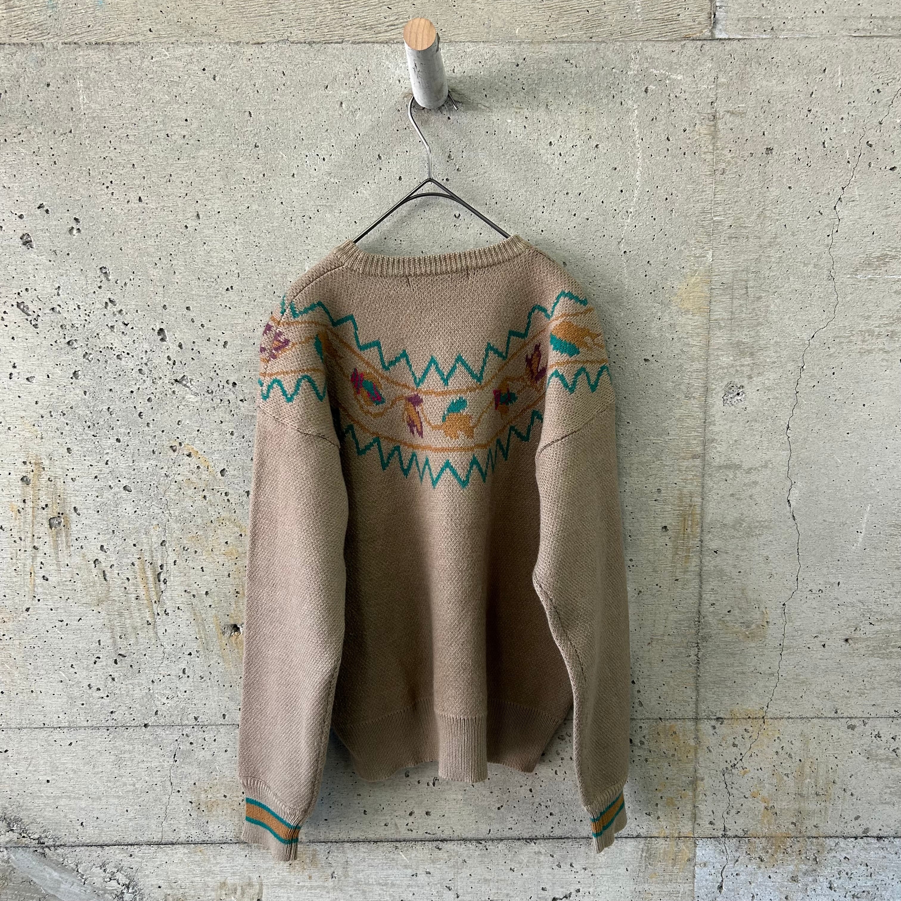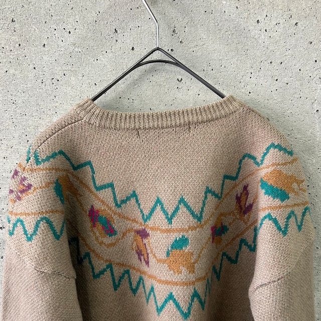 カーキをベースにして、落ち着いた多色を用いて柄が編まれているニットです。