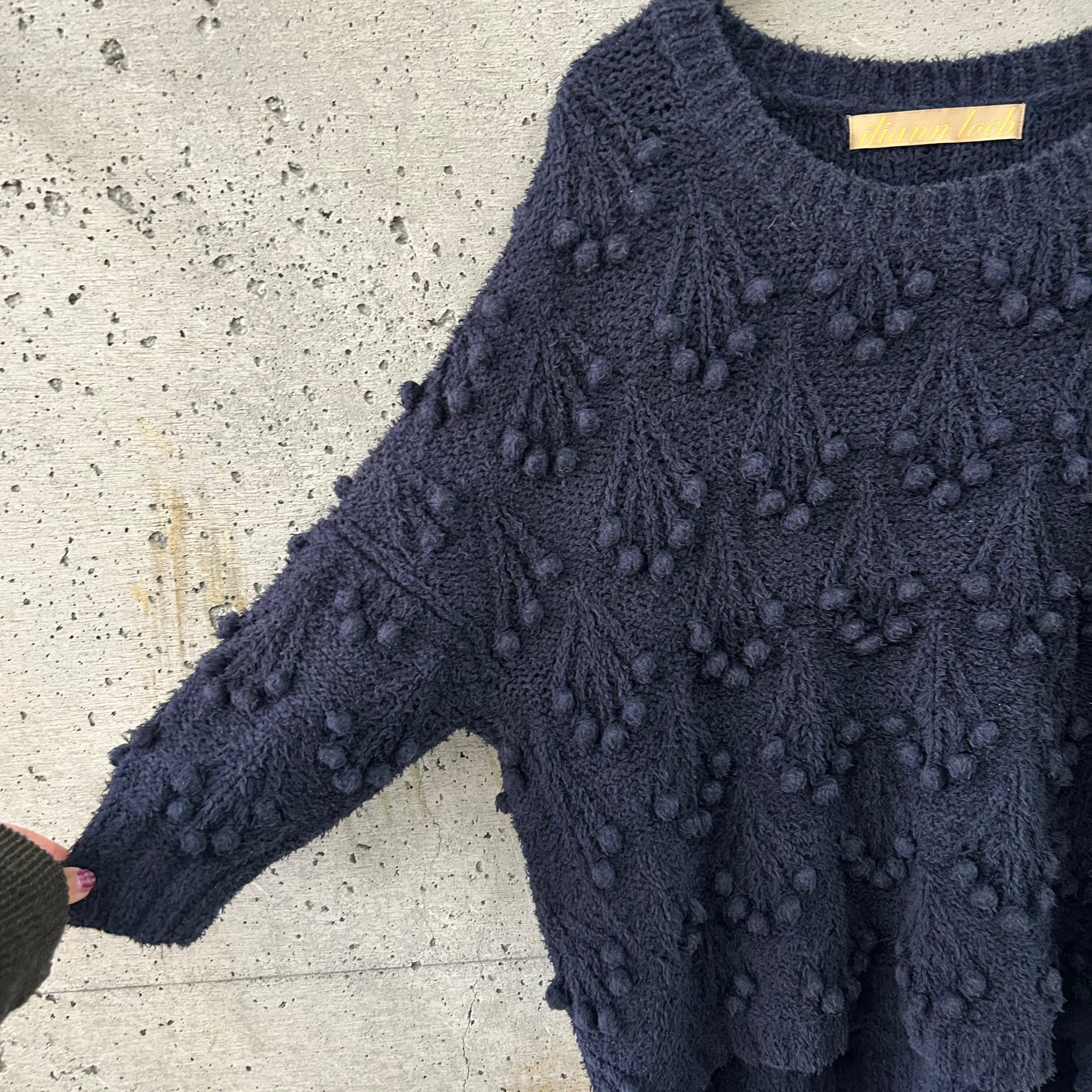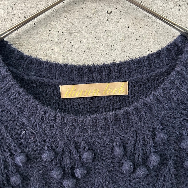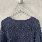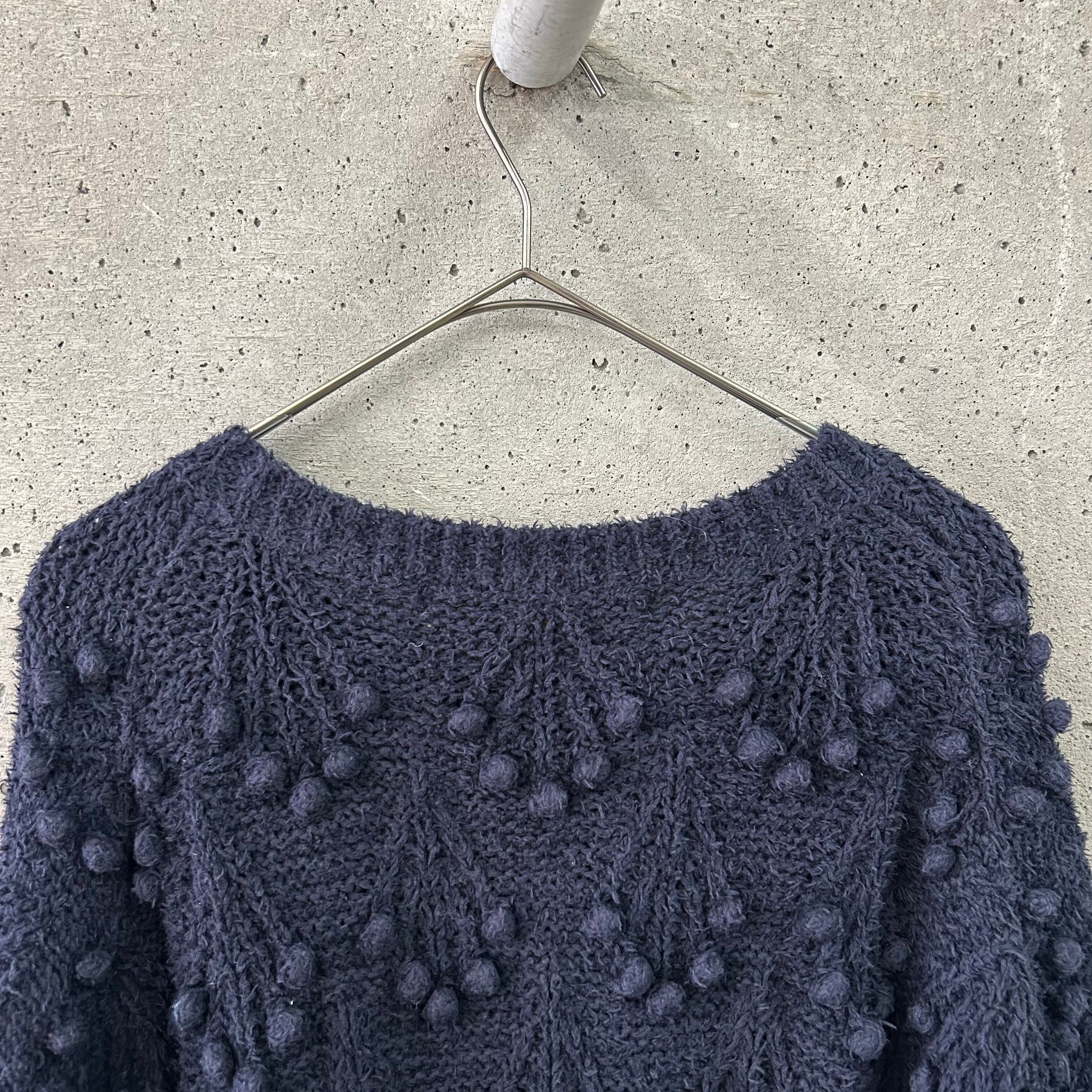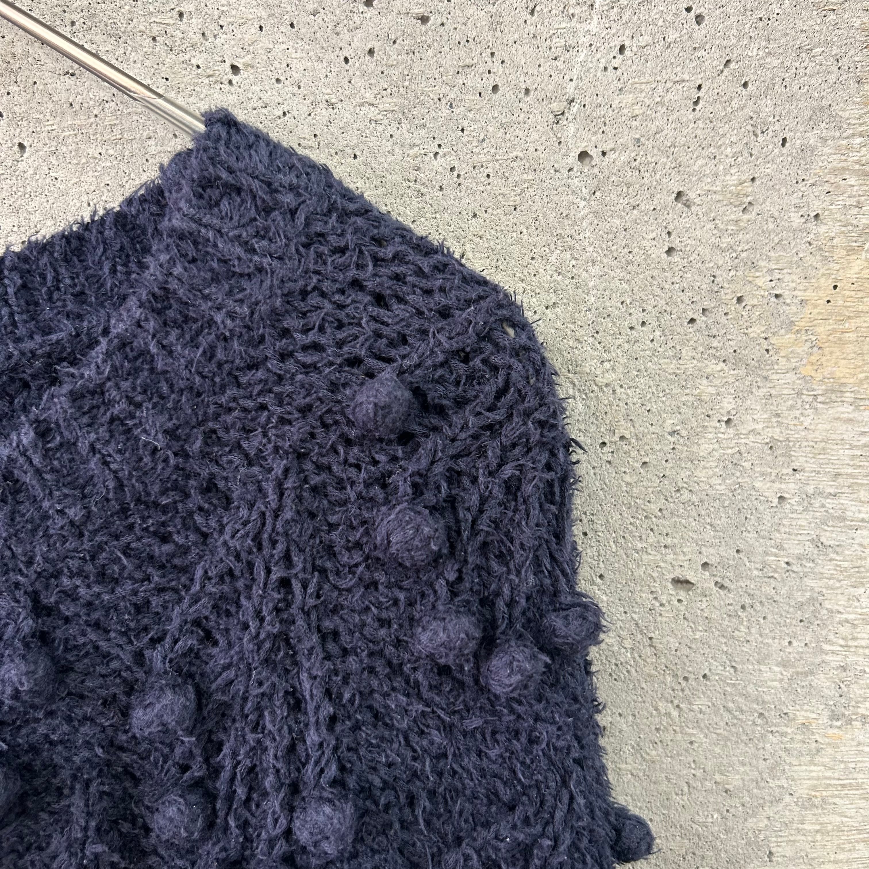 毛羽立ちのある珍しい糸で編まれたネイビーのニットです。
