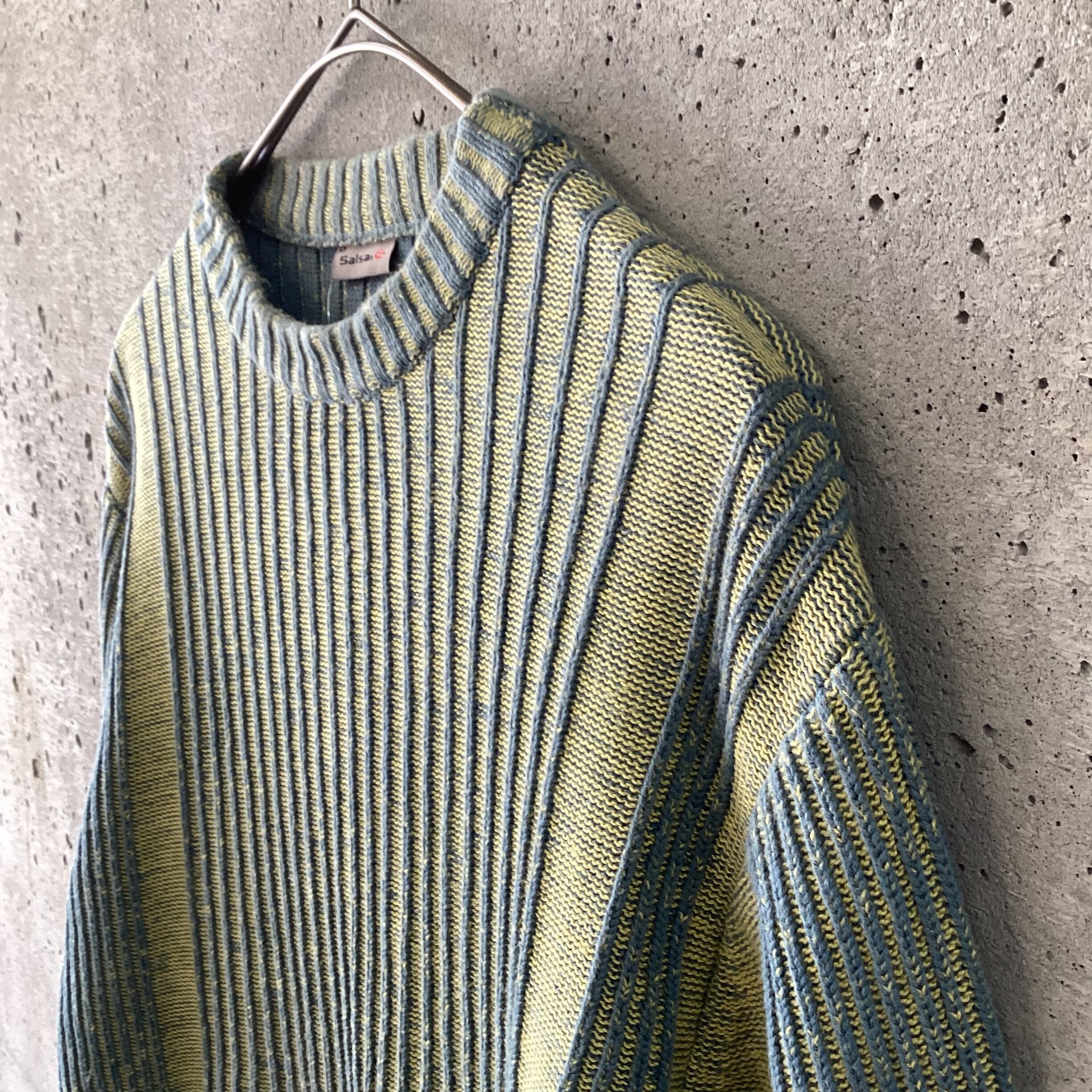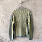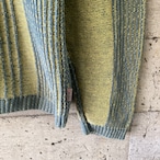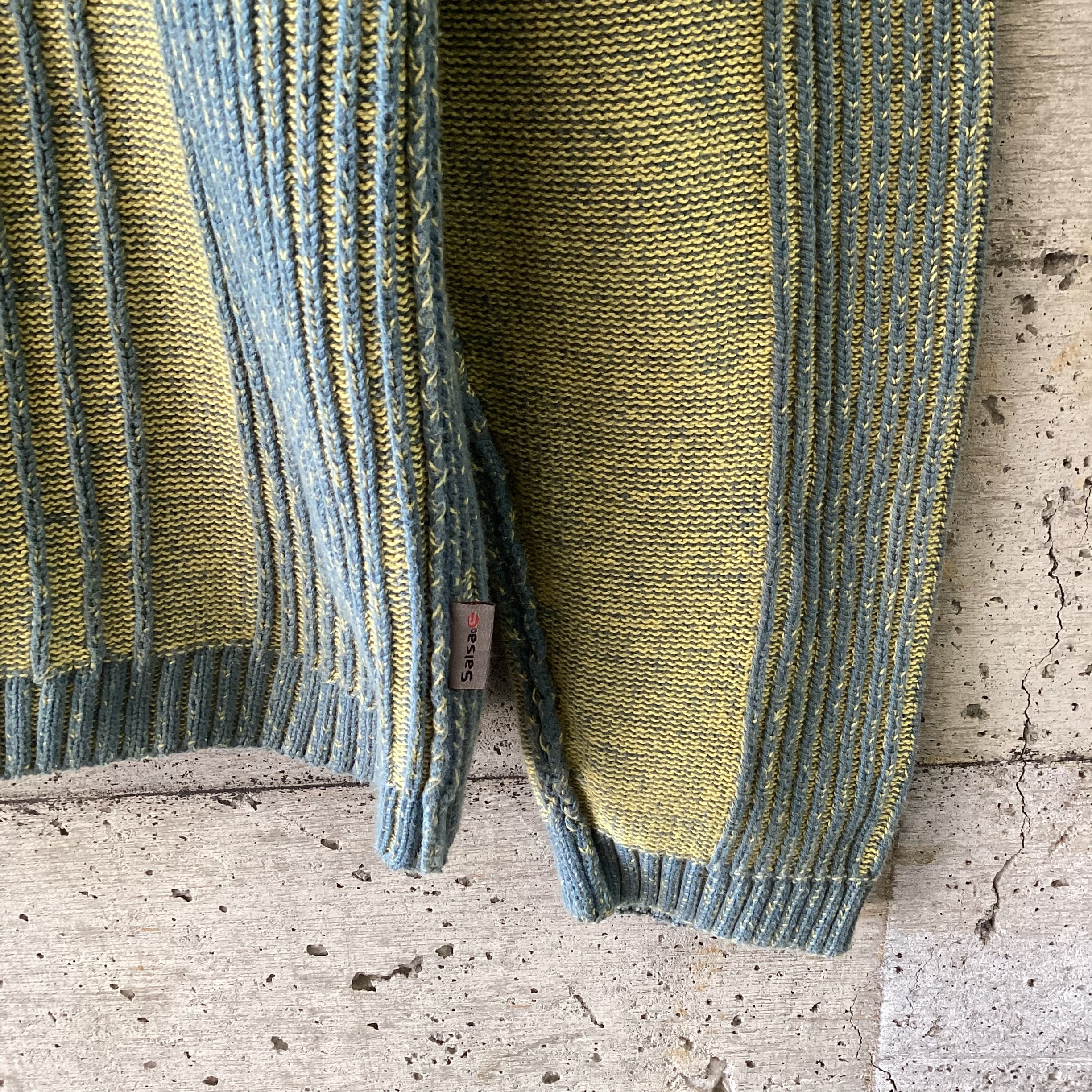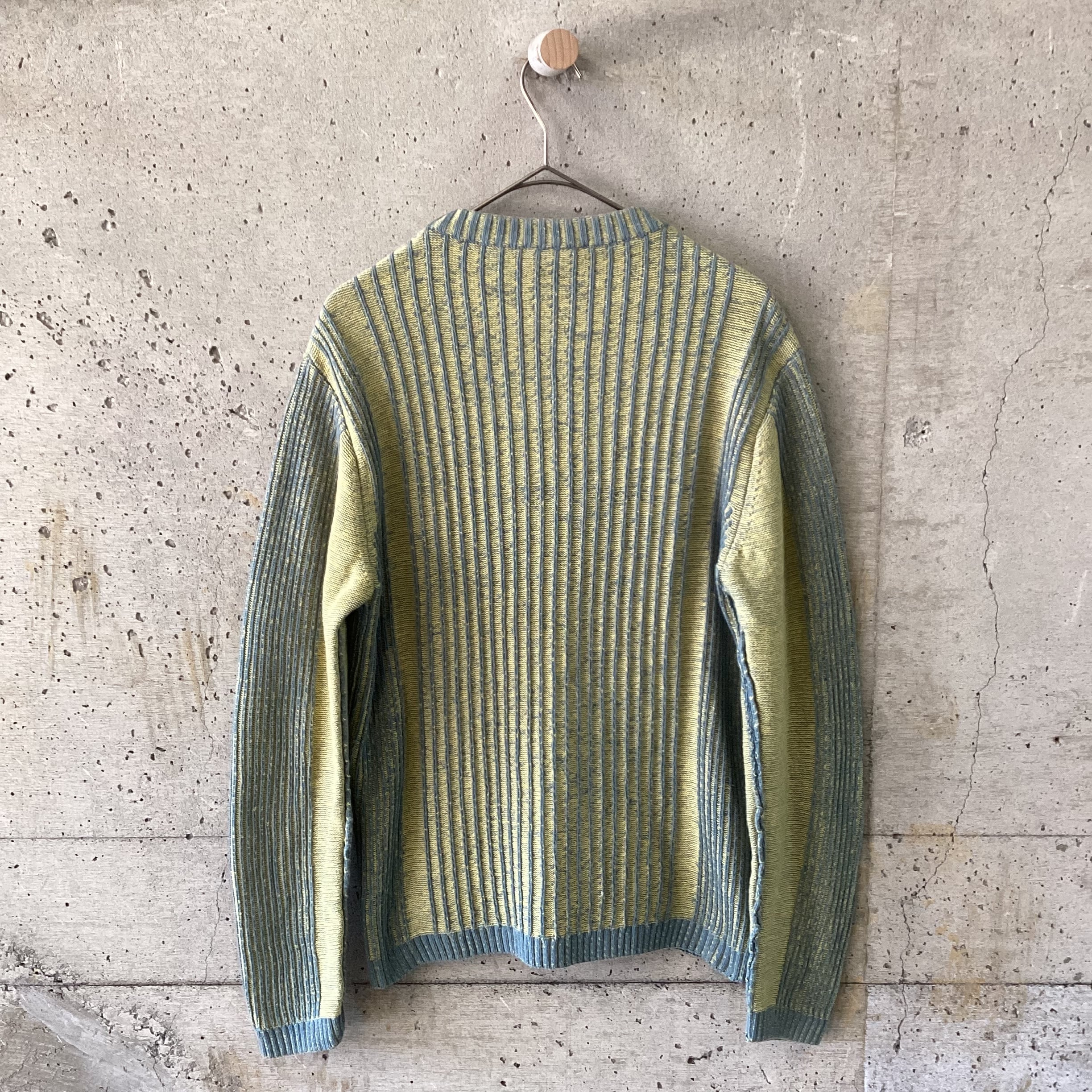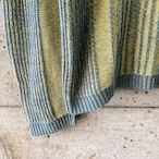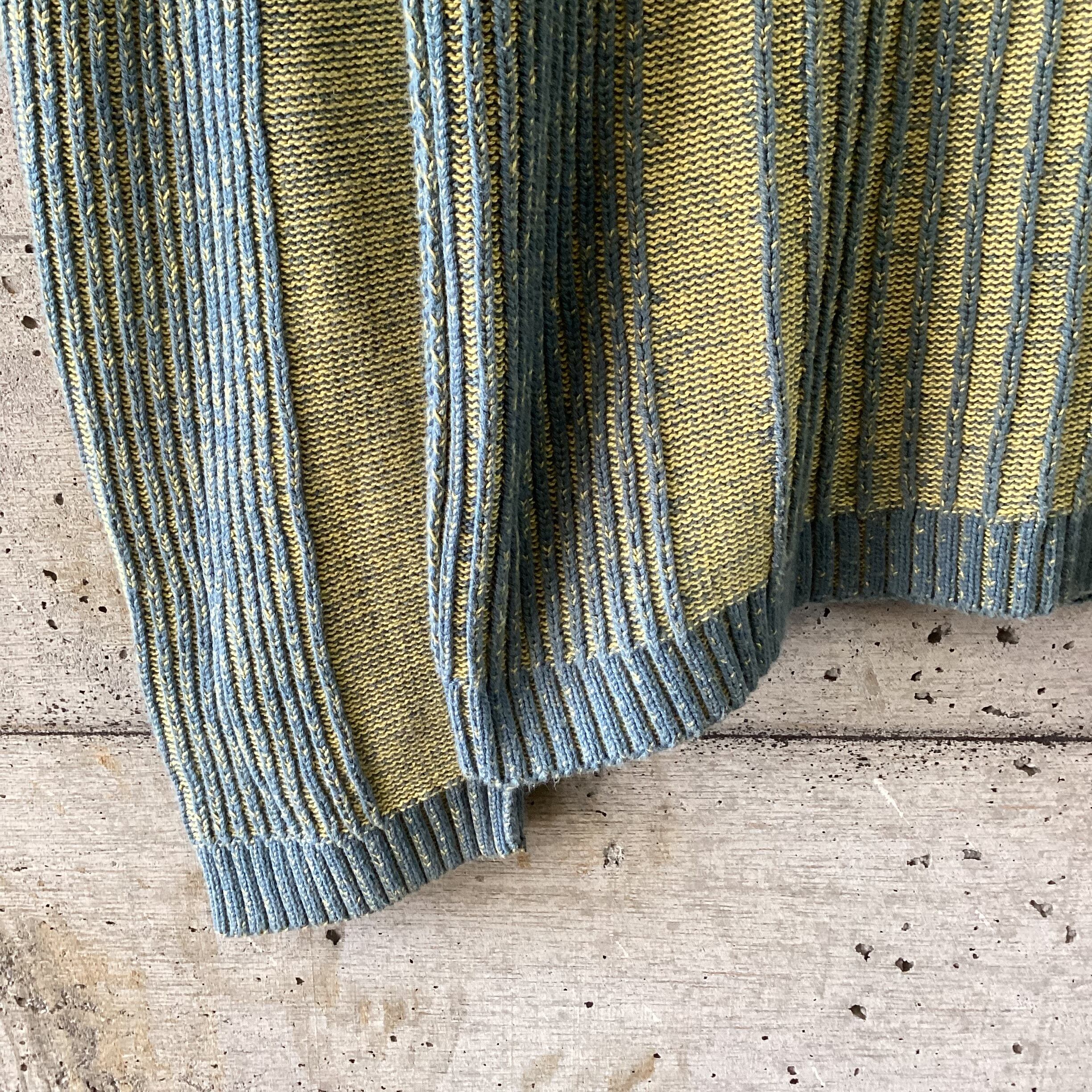 黄色と水色の組み合わせは明るい印象を与えますが、このニットはトーンが暗めなので落ち着いのある印象です。