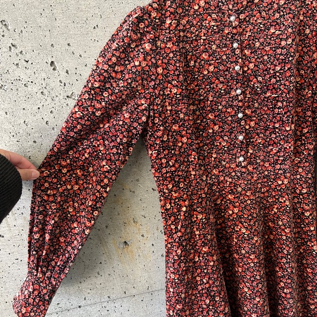 パールビーズのボタンが華奢なイメージを演出し、小花柄の華やかさを引き立てます。